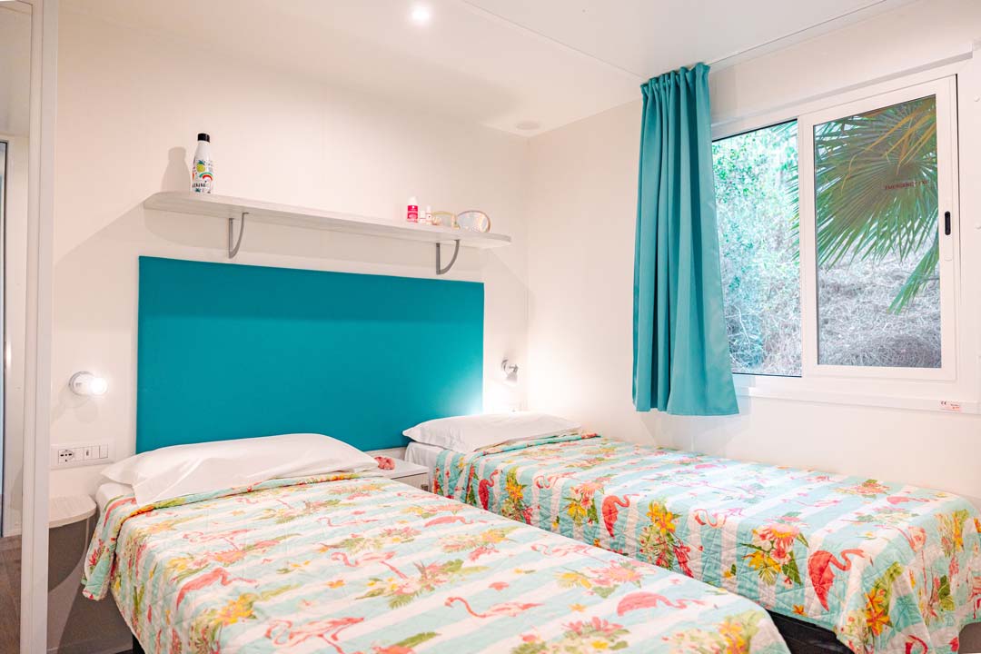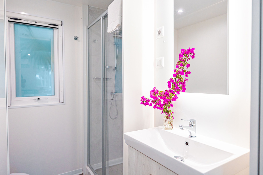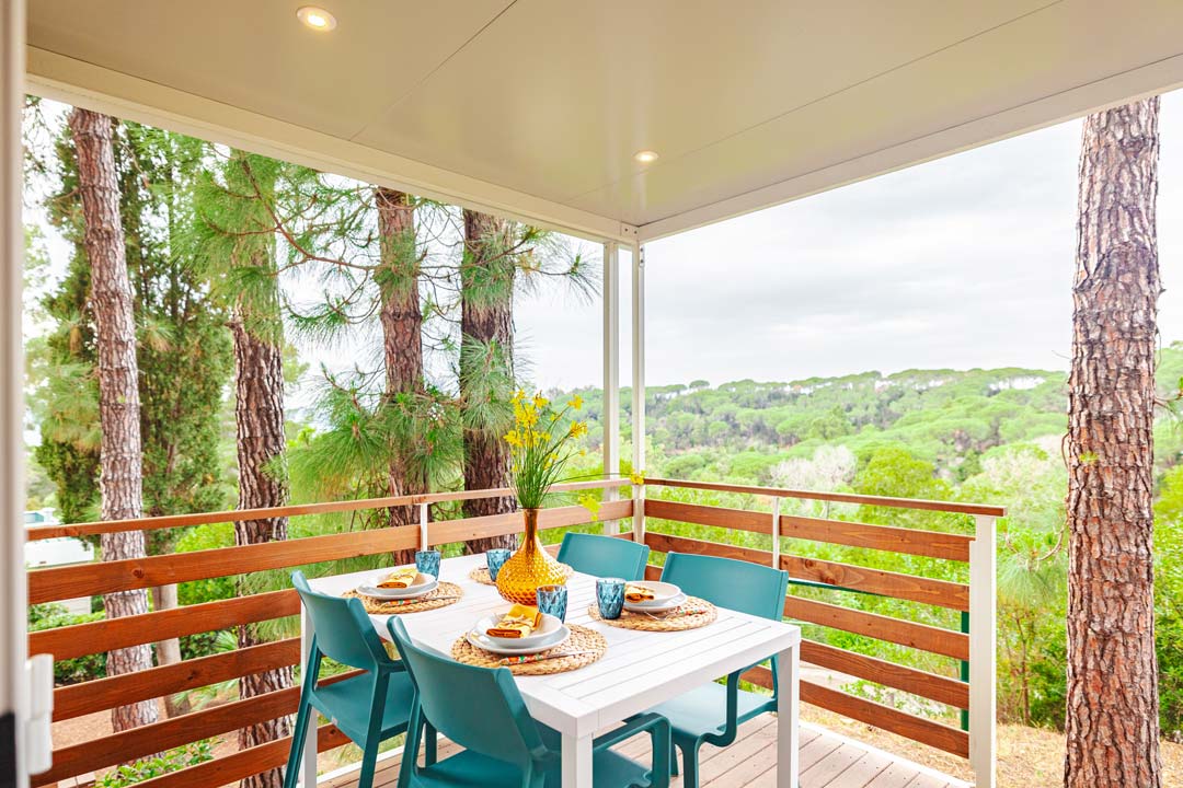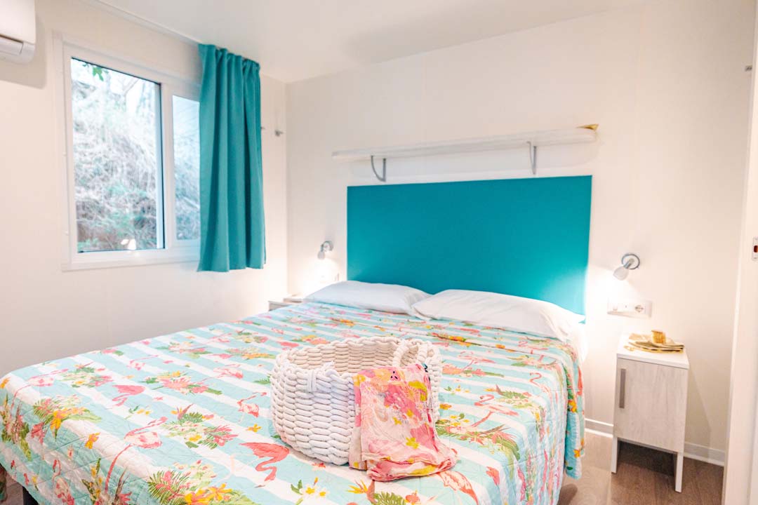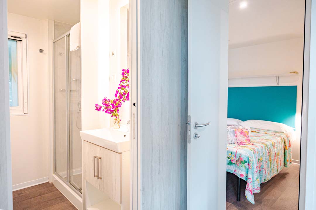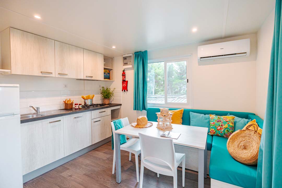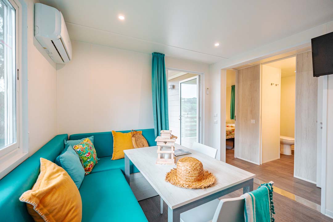 Das Mobilehome Comfort bietet Platz für bis zu 4 Personen. Es besteht aus einem Schlafzimmer mit Doppelbett, sowie einem weiteren Schlafzimmer mit zwei Einzelbetten. Die gut eingerichtete Küche befindet sich im Wohnbereich und verfügt über 4-Flammen-Gasherd, Besteck, Geschirr, Kochtöpfe, Mikrowelle, Spülmaschine sowie einen Kühlschrank mit Eisfach. Die beiden Badezimmer sind mit einem WC, Bidet, einer Dusche und einem Waschbecken ausgestattet. Die überdachte Terrasse ist mit Tisch und Stühlen ausgestattet und lädt zum Entspannen ein. Hinweis: Wenn Sie mehr als eine Unterkunft benötigen, ist dies bei uns in der Regel möglich, da wir über mehrere Objekte des gleichen Haustyps verfügen.