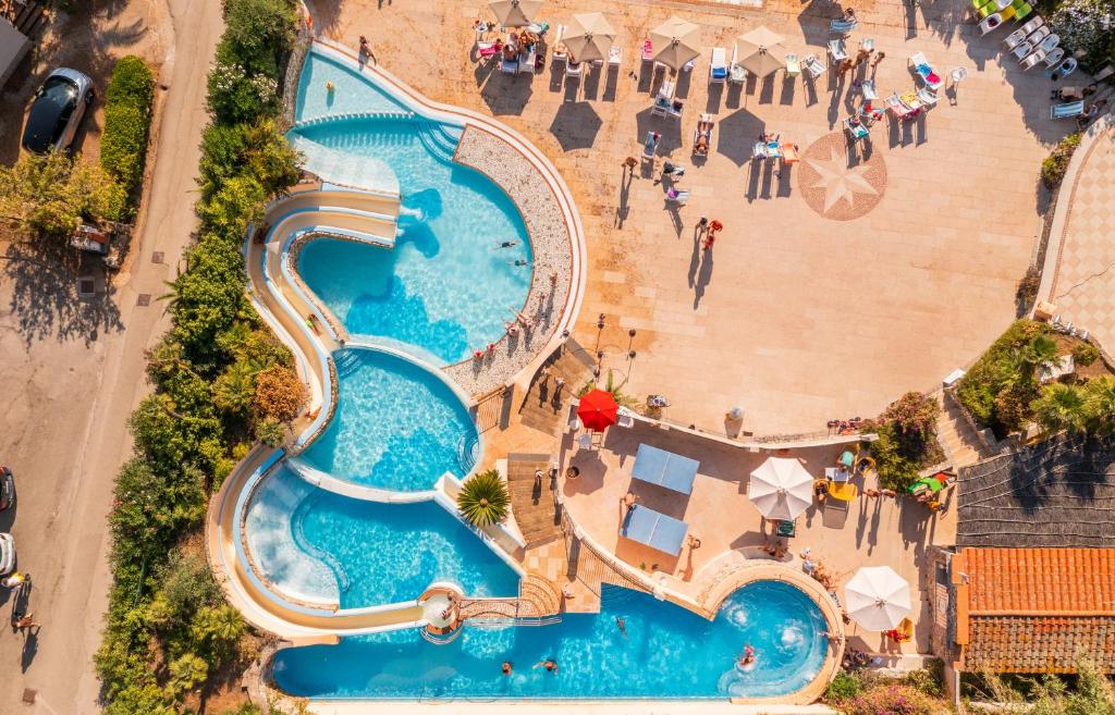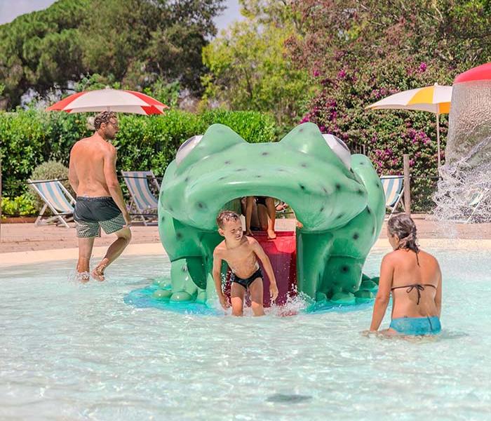 POOLDie weitläufige Poollandschaft ist das Herz des Campings und der absolute Lieblingsort aller Kinder, die hier den ganzen Tag planschen, rutschen und neue Freunde finden. Mehrere Becken in verschiedenen Formen und Tiefen, lange Wasserrutschen, Springbrunnen und ein komplett ausgestatteter, sicherer Kinderbereich lassen die Kleinen zu Piraten, Meerjungfrauen oder kleinen Fischen werden. Eltern entspannen auf bequemen Liegen unter Sonnenschirmen, lassen sich im grossen Hydromassage-Whirlpool verwöhnen oder schwimmen ihre Bahnen im 25-Meter-Sportbecken. An der Kioskbar direkt am Pool gibt es kühle Getränke, leckeres Eis und kleine Snacks – ideal für eine Pause mit Blick auf das fröhliche Treiben.