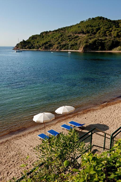 STRANDDer Ottone-Strand ist in nur 5 Minuten über einen schattigen Weg durch den Palmengarten oder bequem per Transferservice (direkt zur Zugangsleiter) erreichbar. Dieser sanft abfallende Kies- und Sandstrand mit kristallklarem Wasser eignet sich hervorragend für Familien mit Kindern und alle, die entspannt baden möchten. Sonnenschirme und Liegen können vor Ort gemietet werden; es gibt auch ausreichend Platz für eigene Handtücher. Am Strandkiosk geniessen Sie Snacks, Eis und Getränke mit traumhaftem Blick auf den Golf von Portoferraio.