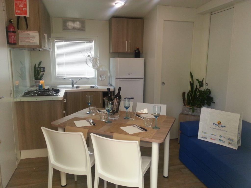 Das Mobilehome Lodge Superior bietet Platz für maximal 6 Personen und verfügt über ein Elternschlafzimmer mit Ehebett sowie ein Kinderzimmer mit 2 Einzelbetten. In den Schlafzimmern finden Sie Moskitonetze an den Fenstern. Die Sitzbank im Wohnbereich lässt sich bei Bedarf in zwei weitere Schlafplätze umfunktionieren. Der Wohnbereich verfügt über eine komplett eingerichtete Küche mit Töpfen, Besteck, italienischer Espressomaschine, Geschirr und grossem Kühlschrank mit Eisfach. Zudem ist die Unterkunft mit TV, Wäscheständer und Klimaanlage eingerichtet. Die Unterkunft verfügt über zwei Badezimmer mit je einem Waschbecken, einer Dusche und einem WC. Der überdachte Sitzplatz mit Tisch und Stühlen lädt zum gemütlichen Entspannen ein, während die Kinder sich auf dem Spielplatz oder am Pool austoben können. Grillen ist in der Nachbarsanlage an den öffentlichen Grillstellen erlaubt. Fahrzeit ab ital. Grenze ca. 3h. Hinweis: Wenn Sie mehr als eine Unterkunft benötigen, ist dies bei uns in der Regel möglich, da wir über mehrere Objekte des gleichen Haustyps verfügen.