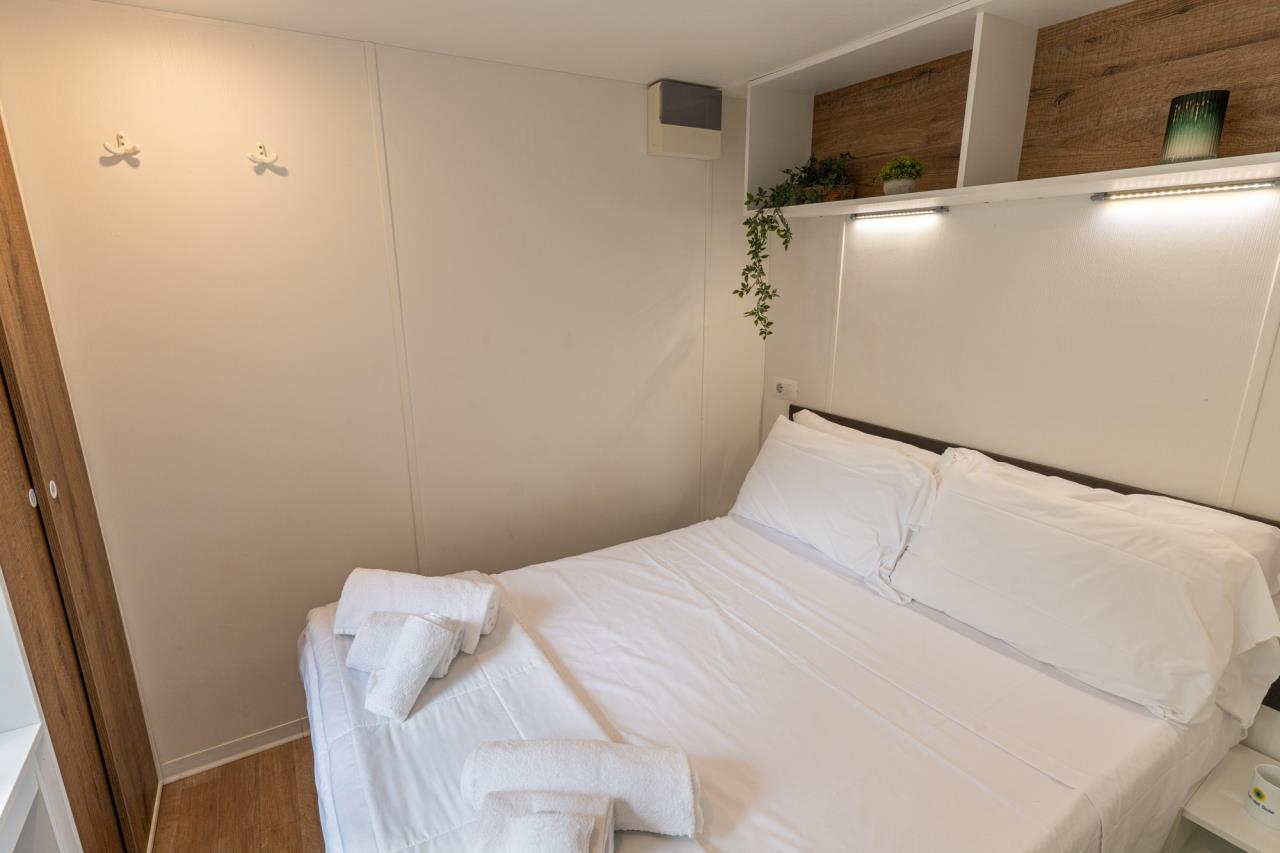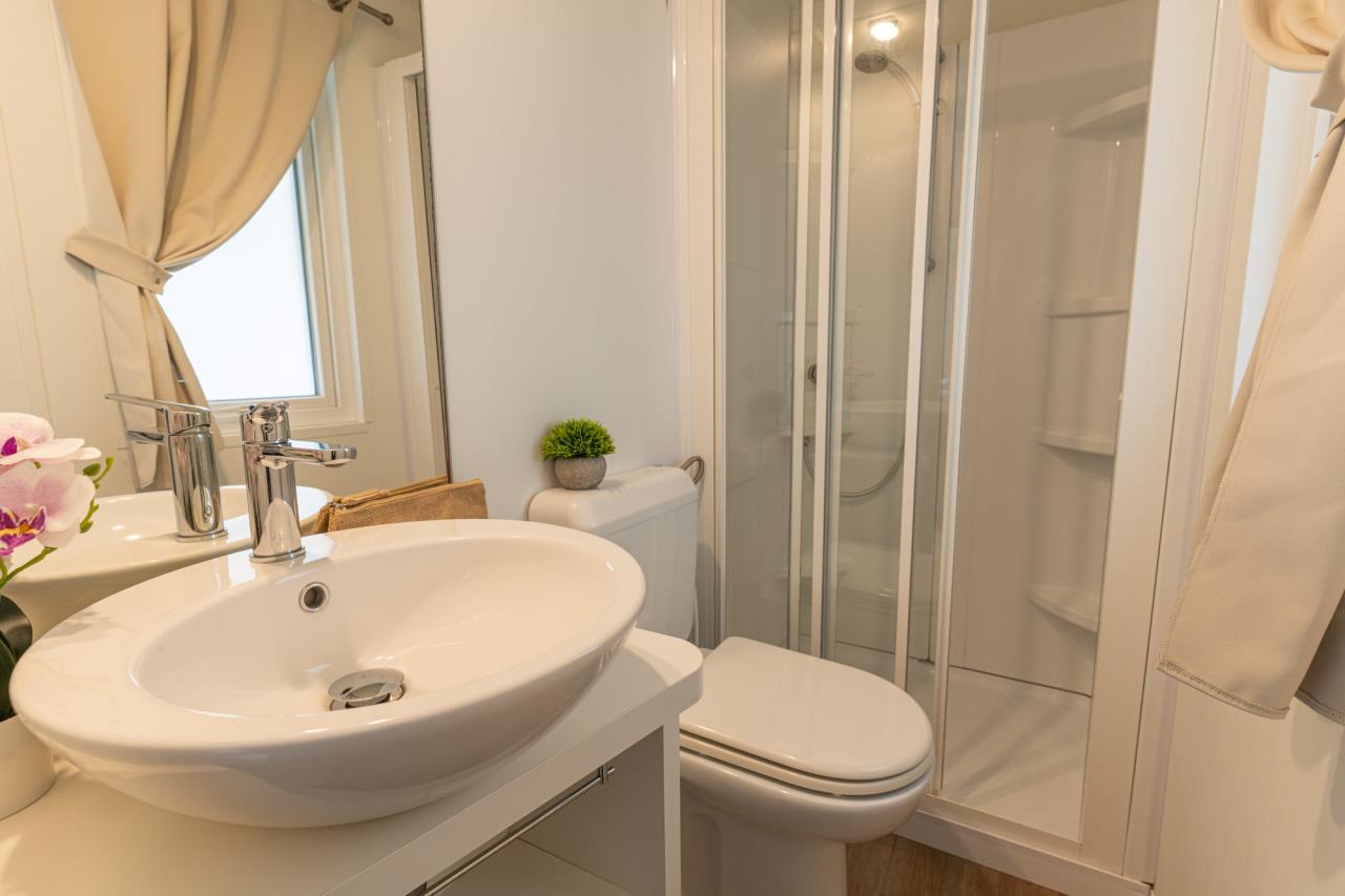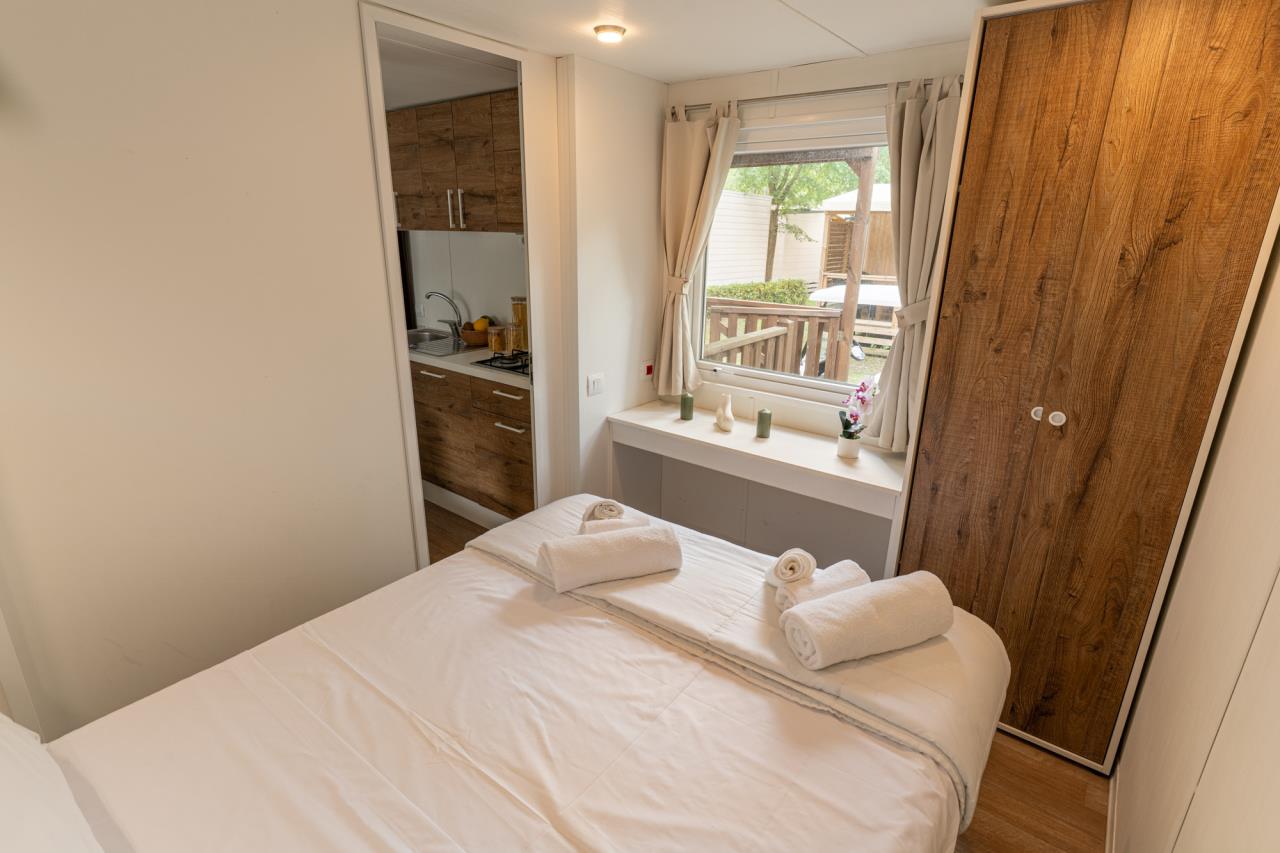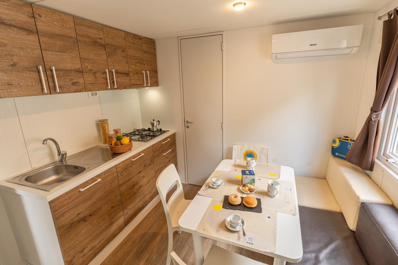 Die Lodge Comfort Dog bietet Platz für max. 4 Personen und ist modern und hübsch eingerichtet. Das Mobilhome besteht aus einem Elternschlafzimmer mit Doppelbett sowie einem Kinderzimmer mit zwei Einzelbetten. An den Schlafzimmerfenstern sind Moskitonetze angebracht. Die gut eingerichtete Küche befindet sich im Wohnbereich und verfügt über einen Herd, Geschirr, Besteck, Kochtöpfe, italienische Espressokanne sowie Kühlschrank mit Eisfach. Das Badezimmer ist mit einer Dusche, einem WC sowie einem Waschbecken ausgestattet. Die überdachte Holzterrasse mit Tisch und Stühlen lädt zum gemütlichen Entspannen ein, während die Kinder sich auf dem Spielplatz oder am Pool austoben können. Ein SAT-TV und ein Wäscheständer sind auch vorhanden. Grillen ist an den öffentlichen Grillstellen mit Kohle erlaubt. Hinweis: Wenn Sie mehr als eine Unterkunft benötigen, ist dies bei uns in der Regel möglich, da wir über mehrere Objekte des gleichen Haustyps verfügen.