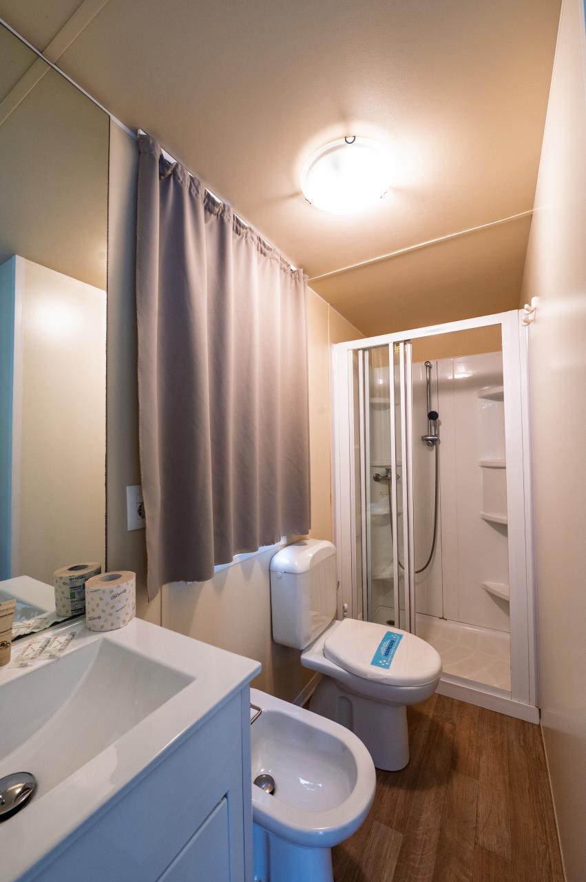 Das Mobilehome 4 Plus bietet Platz für maximal 5 Personen. Es verfügt über ein Schlafzimmer mit einem Doppelbett (140cm x 200cm) sowie ein Kinderzimmer mit zwei Einzelbetten (70cm x 185cm). Zusätzlich bietet das Sofa im Wohn- und Essbereich (70cm x 185cm) einen weiteren Schlafplatz. Die gut eingerichtete Küchenecke ist ausgestattet mit einem Herd, Geschirr, Besteck, Kochtöpfen, Geschirrspüler, Mikrowelle sowie einem Kühlschrank mit Eisfach. Das Badezimmer umfasst eine Dusche, WC, Bidet und ein Waschbecken. Eine Klimaanlage und SAT-TV sind ebenfalls vorhanden. Die überdachte Terrasse mit Tisch und Stühlen lädt zum gemütlichen Entspannen ein, während die Kinder sich auf dem Spielplatz oder am Pool austoben können. Die Fahrzeit ab der italienischen Grenze beträgt etwa 4 Stunden. Hinweis: Wenn Sie mehr als eine Unterkunft benötigen, ist dies bei uns in der Regel möglich, da wir über mehrere Objekte des gleichen Haustyps verfügen.