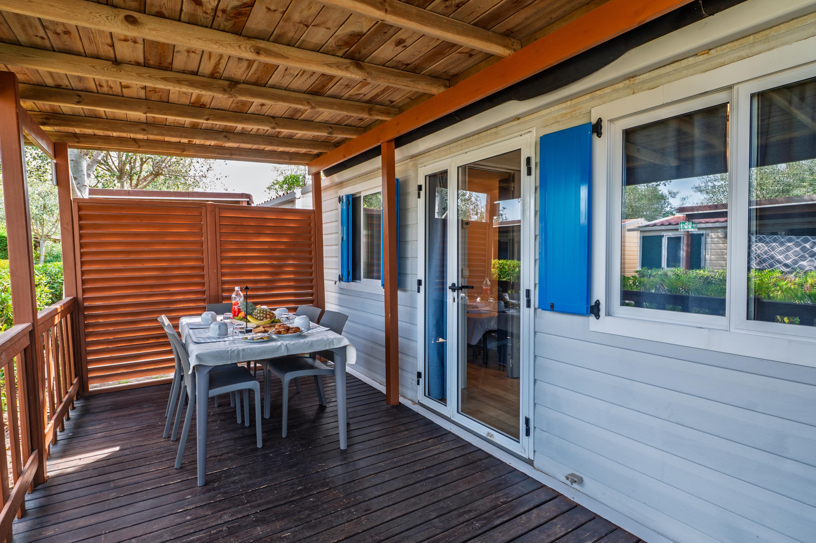 Das Mobilehome C6 bietet Platz für max. 6 Personen. Es verfügt über ein Schlafzimmer mit einem Doppelbett sowie zwei Kinderzimmer mit je zwei Einzelbetten. Im Wohnzimmer gibt es einen Sat TV. Es hat eine gut eingerichtete Küchenecke, welche über einen Herd, Geschirr, Besteck, Kochtöpfe, Mikrowelle sowie Kühlschrank mit Eisfach verfügt. Das Badezimmer ist mit einer Dusche und einem Waschbecken ausgestattet. Die separate Toilette verfügt über ein WC und ein Waschbecken. Die überdachte Terrasse mit Tisch und Stühlen lädt zum gemütlichen Entspannen ein, während die Kinder sich auf dem Spielplatz oder am Pool austoben können. Fahrzeit ab italienischer Grenze ca. 4h. Hinweis: Wenn Sie mehr als eine Unterkunft benötigen, ist dies bei uns in der Regel möglich, da wir über mehrere Objekte des gleichen Haustyps verfügen.