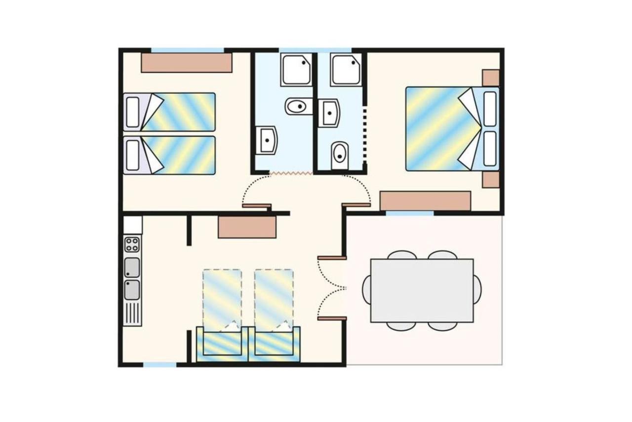 Die schöne und neue Doppelferienhaus "Villino V6K" wurde im Jahr 2016 neu erbaut und hat Platz für max. 6 Personen und besteht aus einem Elternschlafzimmer mit Doppelbett, sowie einem Kinderzimmer mit zwei Einzelbetten. Im Wohnraum hat es ein Bettsofa, welches zwei weiteren Personen Platz bieten. Die gut eingerichtete Kochnische verfügt über Geschirr, Besteck, Pfannen, Wasserkocher und Microwelle sowie Kühlschrank mit Eisfach. TV vorhanden. Die beiden Badezimmer verfügen je über eine Dusche sowie Waschbecken und WC. Der überdachte Sitzplatz mit Tisch und Stühlen lädt zum gemütlichen Entspannen ein, während die Kinder sich auf dem Spielplatz oder am Pool austoben können. Grillen ist an der öffentlichen Grillstelle erlaubt. Fahrzeit ab ital. Grenze ca. 4h. Auf Wunsch kann vor Ort auch Halb- oder Vollpension dazugebucht werden. Hinweis: In dieser Kategorie ist keine Zusatzperson möglich. Hinweis Wenn Sie mehr als eine Unterkunft benötigen, ist dies bei uns in der Regel möglich, da wir über mehrere Objekte des gleichen Haustyps verfügen. .