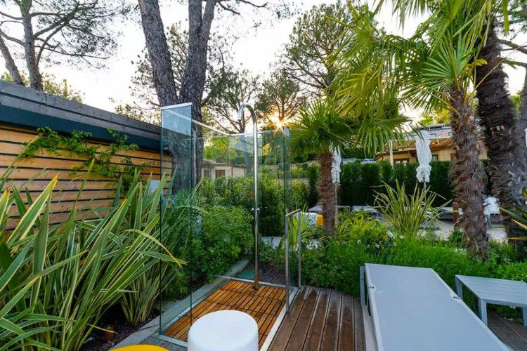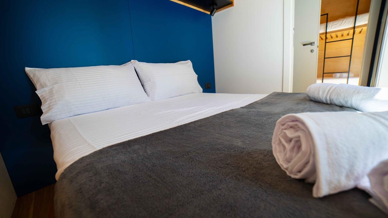 Die moderne Lodge ist für maximal 7 Personen und besteht aus drei Wohnmodulen. Das erste Modul verfügt über ein Schlafzimmer mit Doppelbett und eigenem Bad mit Dusche, Waschbecken und WC. Das zweite Modul besteht aus zwei Schlafzimmern, eines verfügt über ein Doppelbett, das zweite über zwei Einzelbetten und ein Hochbett für ein Kind unter 12 Jahren. Hier befindet sich auch das zweite Badezimmer, ausgestattet mit einer Dusche, einem Waschbecken und einem WC. Im dritten Wohnmodul befindet sich die Küche und der Essbereich. Es gibt einen 4-Flammenherd, eine Spüle, Töpfe, Geschirr und einen grossen Kühlschrank mit Gefrierfach. Ein Tisch und Stühle sind ebenfalls vorhanden. Die grosse Fenstertür mit Blick auf die geräumige Holveranda verleiht dem Wohnzimmer viel Helligkeit.