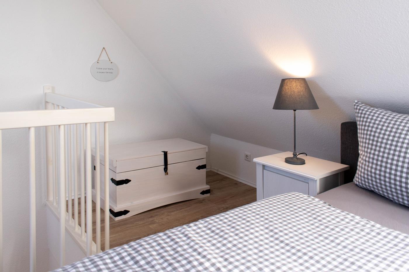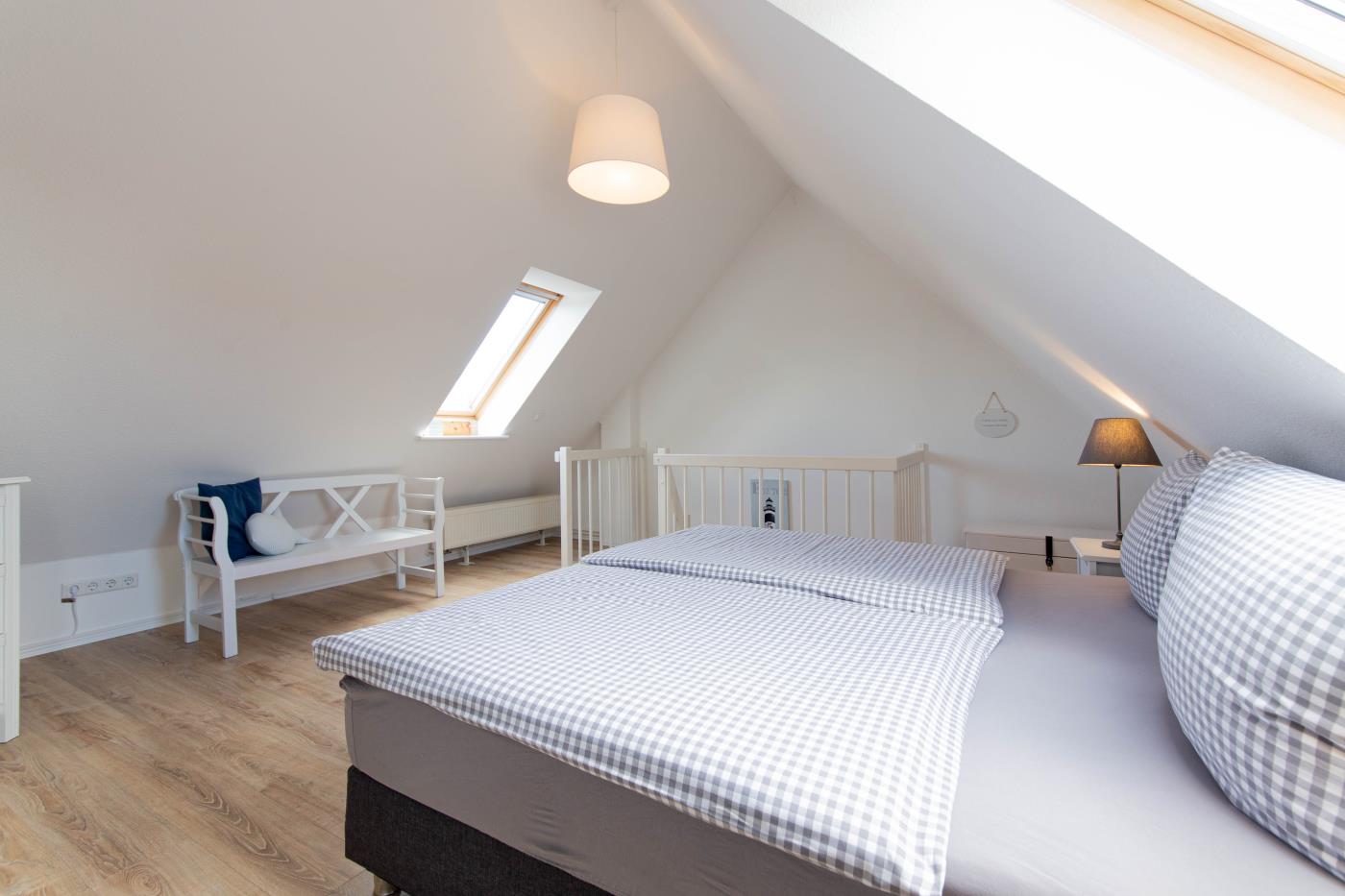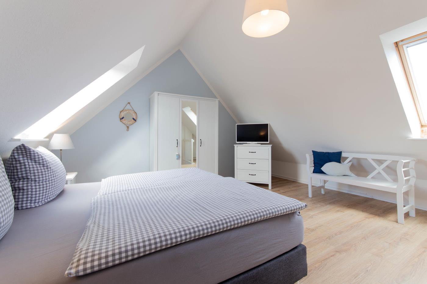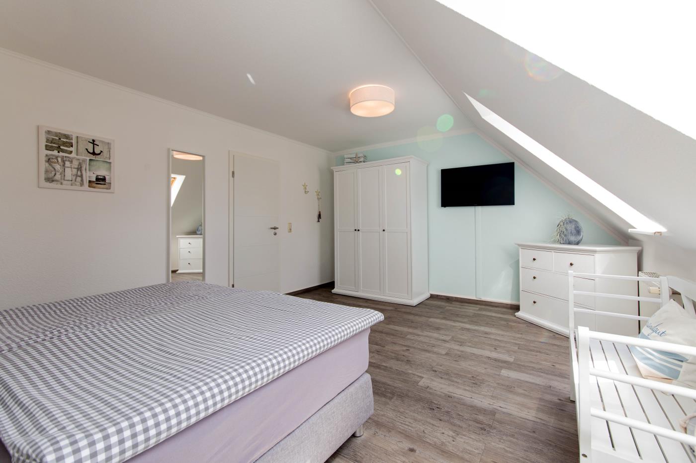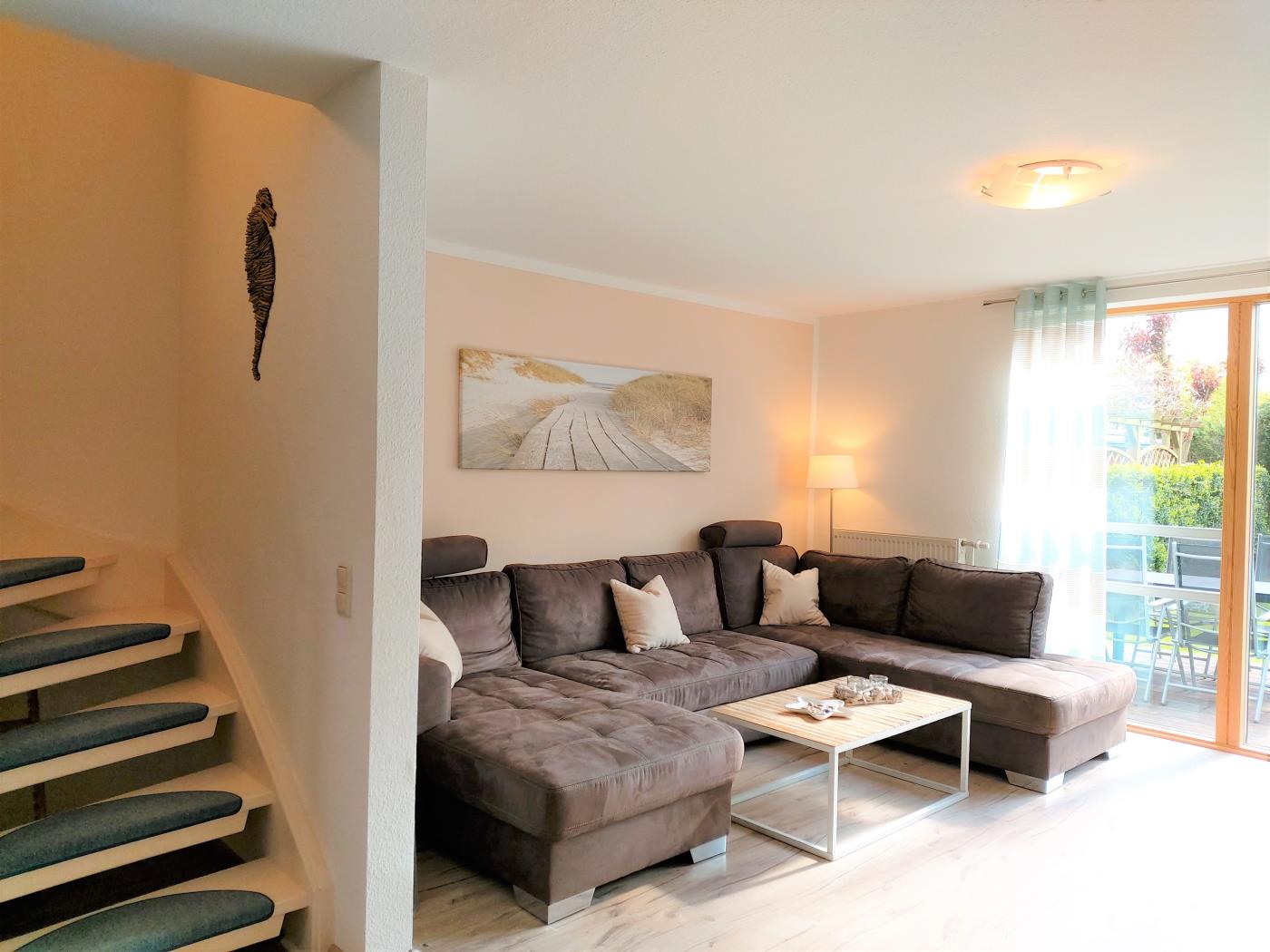 Das Ferienhaus bietet Ihnen auf viereinhalb Zimmern viel Raum zum Erholen. Im Erdgeschoss befindet sich das Wohnzimmer mit offener Küche. Von hier aus haben Sie Zugang auf die Holzterrasse. Auf der Terrasse befinden sich Sitzmöbel für sechs Personen. Schutz vor der Sonne bietet hier eine Markise. Durch eine Abtrennung zu den Nachbargrundstücken finden Sie auf der Terrasse Ihren eigenen privaten Rückzugsort vor. Der Gartenbereich ist komplett eingezäunt, so dass sich ihr Hund frei bewegen kann. Außerdem befindet sich ein Gäste-WC mit Dusche auf dieser Ebene. Im ersten Geschoss befinden sich zwei geräumige Schlafzimmer, beide mit Boxspringbetten (1,80m2,00m) ausgestattet. Ein weiteres Bad mit Badewanne und Dusche komplettiert das erste Geschoss. Weiter geht es in das zweite Geschoss. Hier befindet sich ein weiteres Schlafzimmer. Auch dieses ist mit einem gemütlichen Boxspringbett (1,80m2,00m) ausgestattet. In den Schlafzimmern befinden sich an allen Fenstern Verdunklungsrollos. Eine Waschmaschine steht Ihnen ebenfalls zur Verfügung.