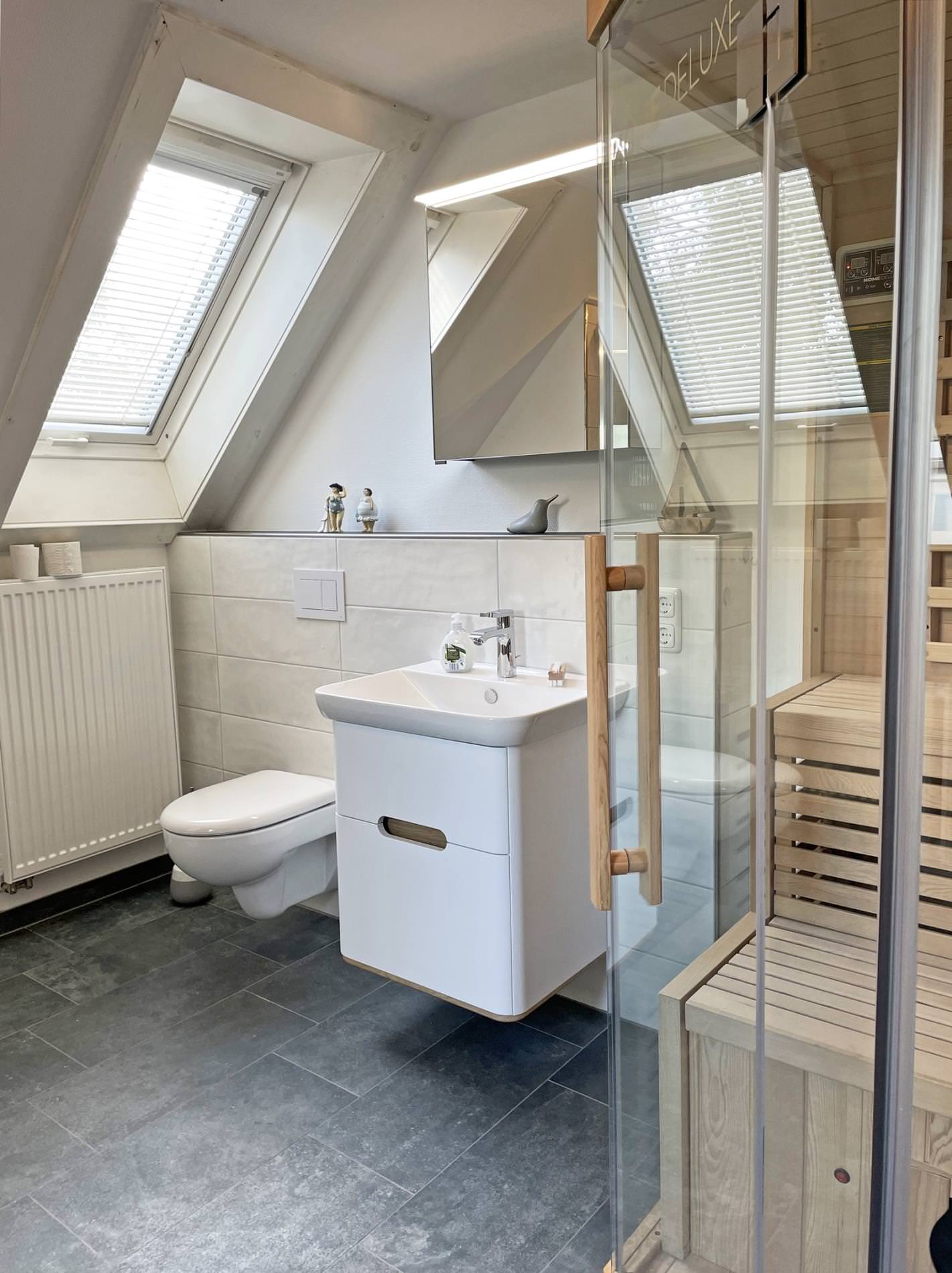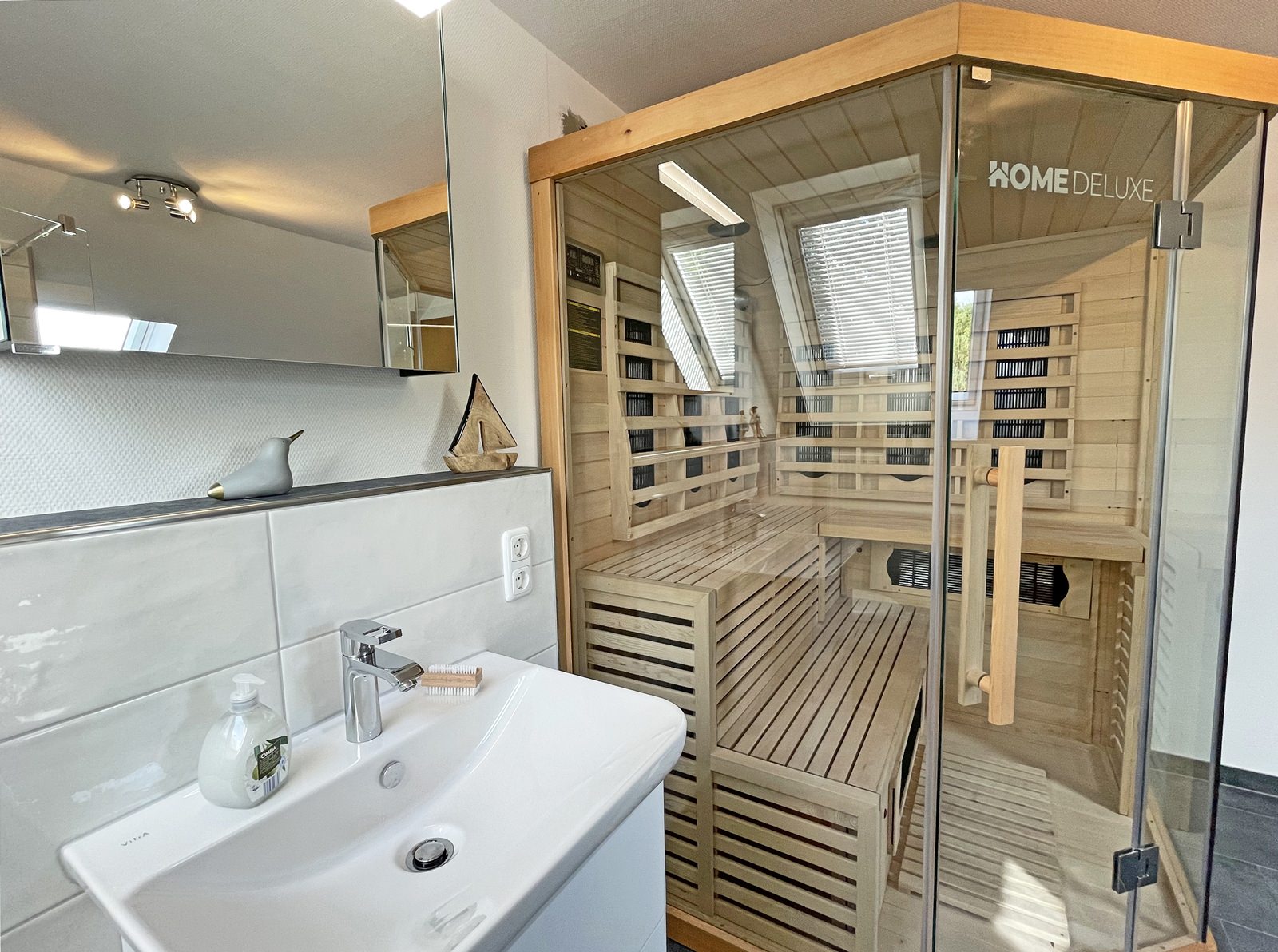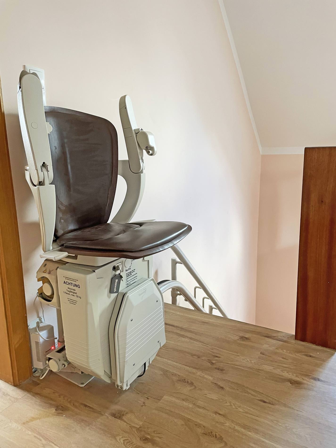 Vom gemütlichen Sofa können Sie in den kühleren Jahreszeiten auch wunderbar dem Knistern des offenen Kaminofens lauschen. Alternativ können Sie es sich bei einem spannenden Buch auch auf dem Lesesessel am Kaminofen bequem machen oder Sie verbringen einen heiteren Spieleabend mit der ganzen Familie am großen Esstisch im Wohnbereich. Über einen Flur gelangen Sie in die helle Küche, die mit diversen Kochutensilien Hobbyköchen keine Wünsche offen lässt. Im Erdgeschoss finden Sie außerdem ein kleines Gäste-WC. Zwei separate Schlafzimmer befinden sich im Obergeschoss des Hauses, welches Sie optional auch über einen Treppenlift (belastbar bis 120kg) erreichen können. Hier sorgt jeweils ein großes Doppelbett und ein Einzel-Daybed für angenehme und erholsame Nachtruhe. Das topmoderne Badezimmer mit Tageslicht bietet neben einer begehbaren Dusche und Waschmaschine & Trockner auch eine tolle Infrarotlichtsauna – so kommen auch Wellnessfans voll auf ihre Kosten!