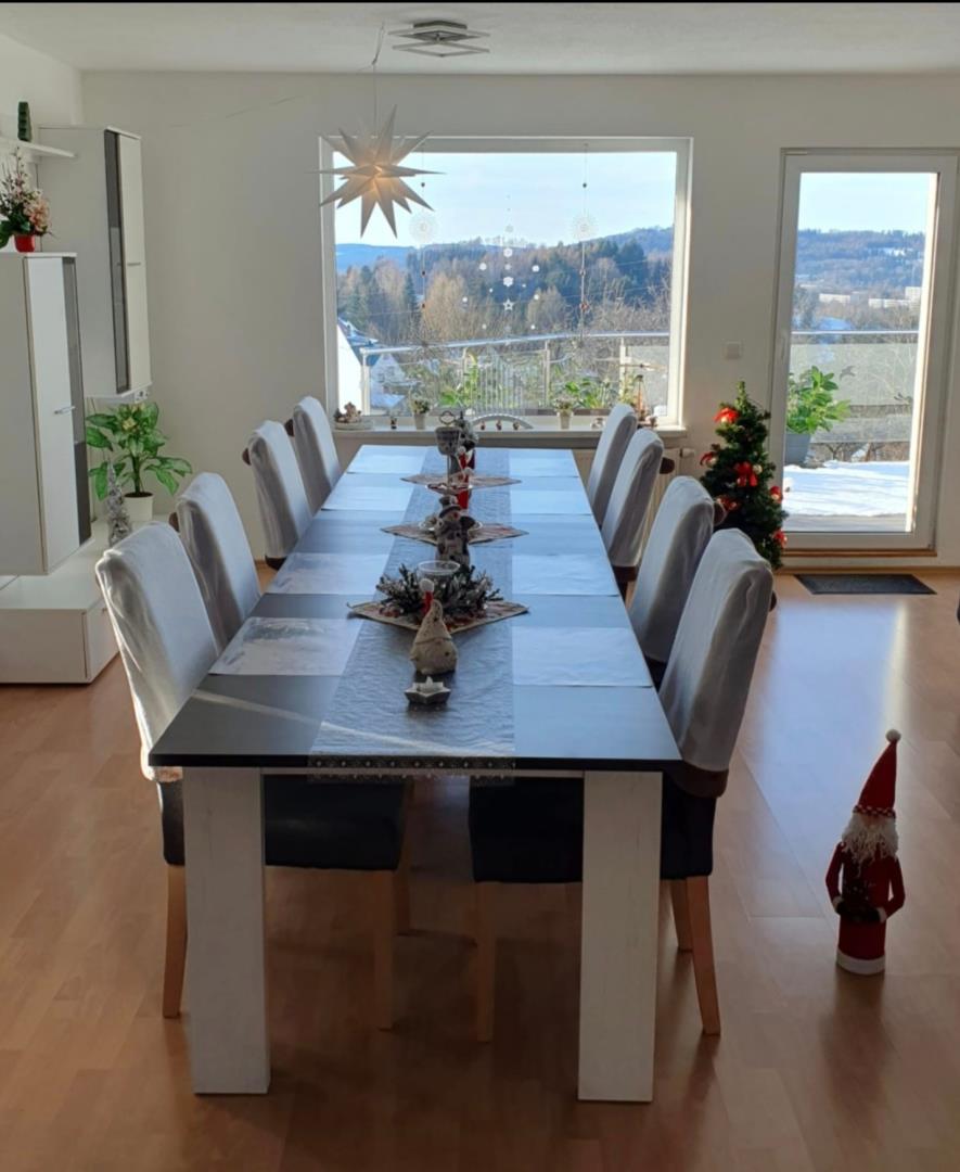 Sie haben Lust auf einen Urlaub umgeben von Natur und Ruhe? Dann kommen Sie doch mal in den Thüringer Wald. Unser Ferienhaus befindet sich in absolut ruhiger Lage am Waldrand. Hier können Sie entspannen und die Seele baumeln lassen. Nur wenige Schritte trennen das Ferienhaus vom Rennsteig, Deutschlands bekanntestem Höhenwanderweg. Dieser wiederum ist Ausgangspunkt für zahlreiche schöne Touren. Unser schickes Ferienhaus bietet auf ca. 100 qm, aufgeteilt in 2 Etagen, Platz für bis zu 6 Personen. Ein große Terrasse bietet Ihnen eine herrliche Aussicht. Das Haus befindet sich ca. 300 Meter zum idyllischen Waldbad. Der Kurbeitrag ist in bar vor Ort bei Anreise zu entrichten. Offener Wohnbereich mit Couch, TV, Zugang zum Balkon, offenes Esszimmer, Küchenbereich, Kühl- und Gefrierkombi, Kochgelegenheit Cerankochfeld, Geschirrspüler, Teller, Tassen, Besteck, Backofen, Kühlschrank, Kaffeemaschine, Toaster, Bad mit Dusche und WC, Schlafbereich im EG mit Doppelbett, TV, Im OG offener Wohnbereich mit Couch, Kinderbett, TV, Bad im OG mit Wanne und WC, Schlafbereich im OG mit Doppelbett. PKW-Stellplatz überdacht, WLAN, Fahrradständer, Lademöglichkeit für E-Bikes. Die Bettwäsche und Handtücher sind bereits im Mietpreis enthalten.