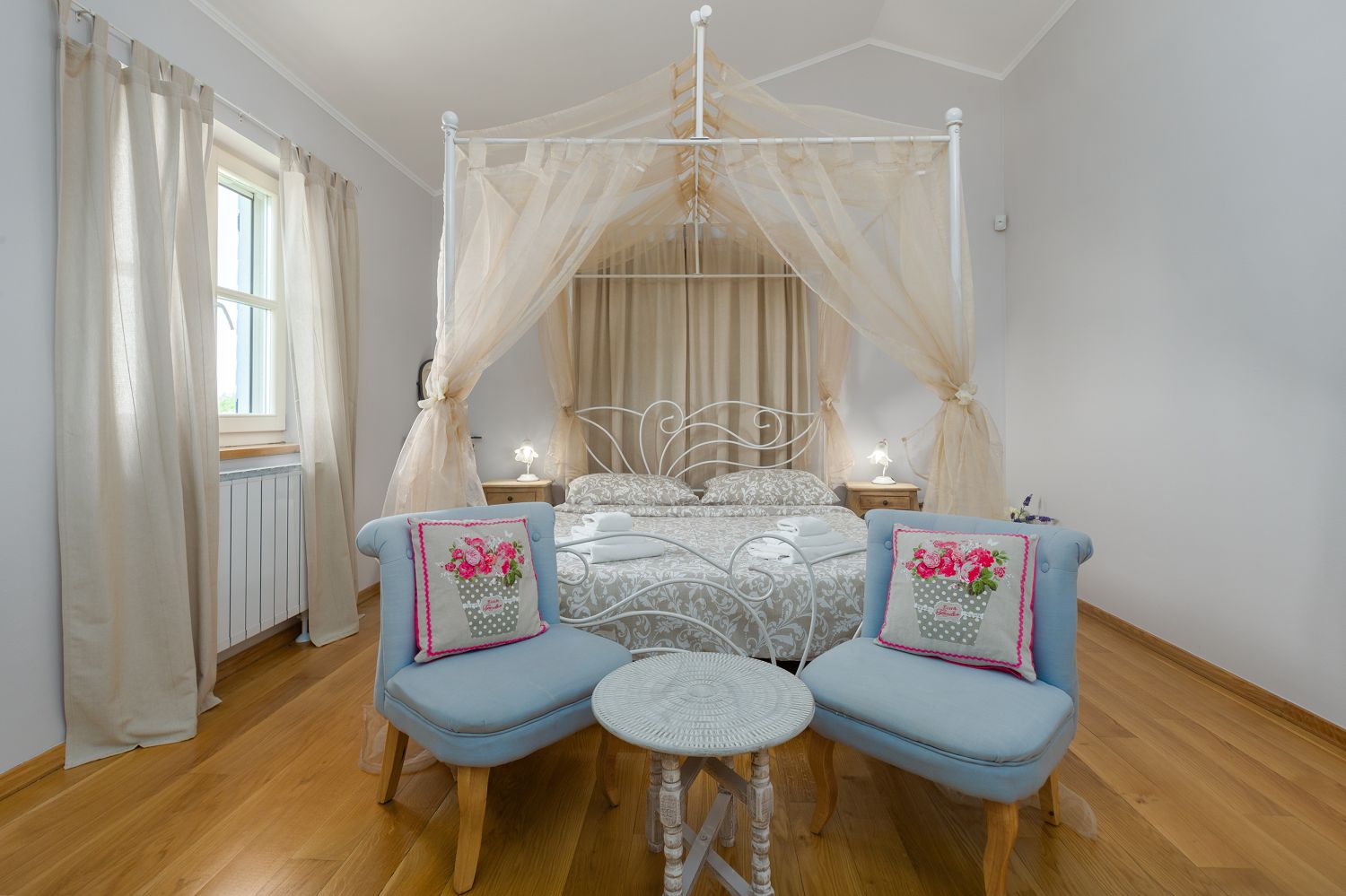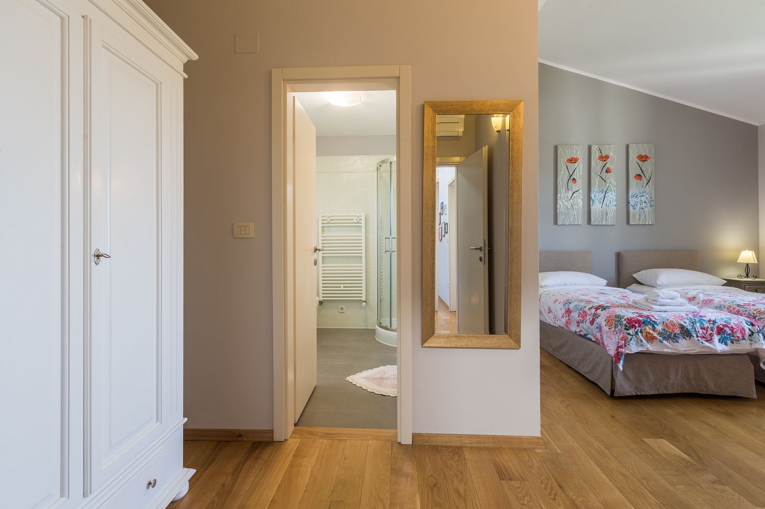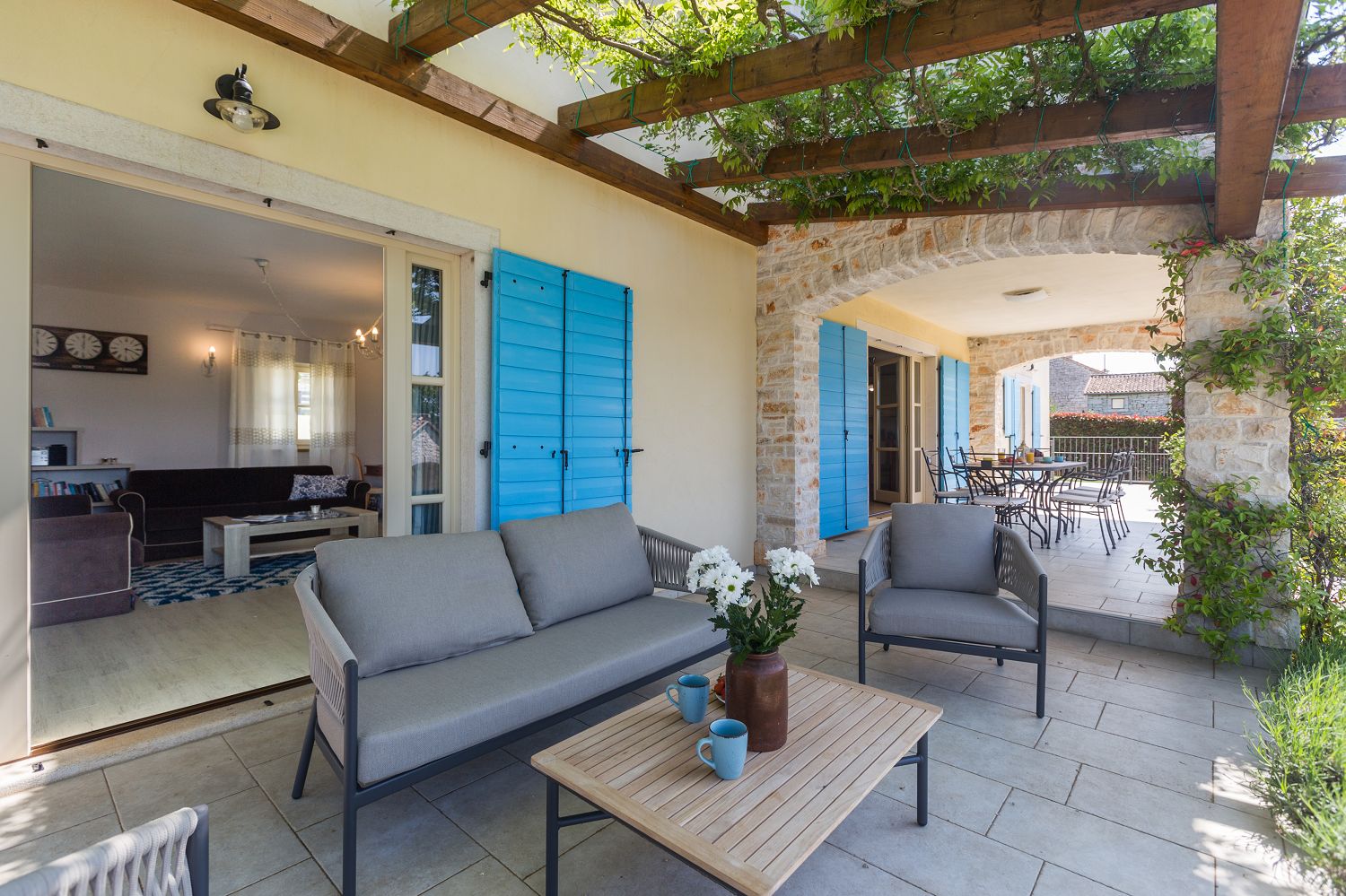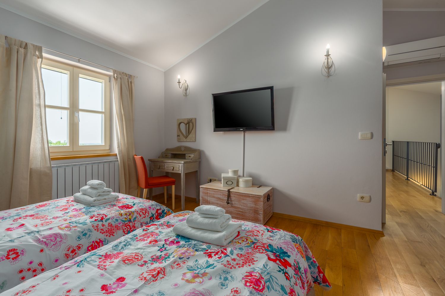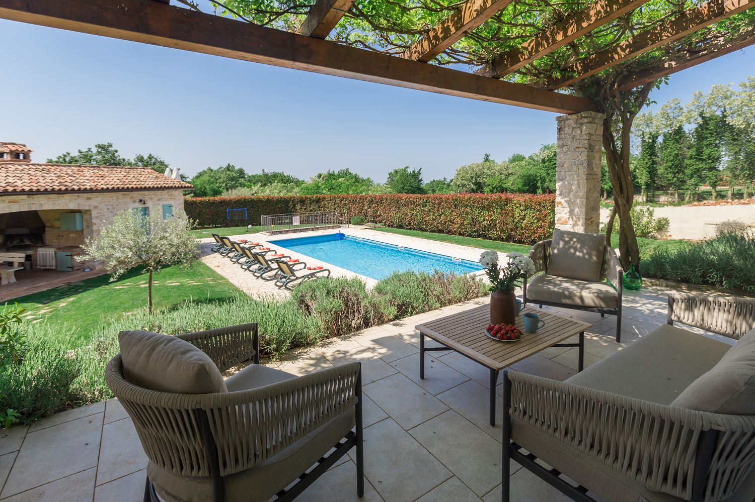 Diese Villa liegt im Dorf Heraki im grünen Binnenland Istriens, ca. 15 km von Porec und den Stränden entfernt. Das nächste Restaurant und Lebensmittelgeschäft befindet sich im 2 km entfernten Ort Sveti Lovrec. Auf dem 1500 m² großen Grundstück mit gepflegtem Rasen befinden sich mehrere aromatische Mittelmeerpflanzen wie Lavendel oder Rosmarin. In den wärmeren Jahreszeiten blühen hier zahlreiche Blumen. Den Gästen der Villa stehen ein privater, 66 m² großer Pool, vier Parkplätze, ein Poolhaus mit Sommerküche, Dusche/WC, Grillkamin, Sonnenliegen und ein Tisch mit Stühlen zur Verfügung. Die im Jahr 2014 erbaute Villa bietet ihren Gästen dank der hochwertigen Ausstattung einen bemerkenswerten Komfort. Auf Anfrage kann der Pool beheizt werden, sodass auch in den nicht zu heißen Monaten vor oder nach der Saison ein erfrischendes Bad möglich ist. Das komplett umzäunte Grundstück bietet viel Platz für Ihre vierbeinigen Freunde. Die Villa mit einer Fläche von 260 m² + Poolhaus kann bis zu 9 Personen beherbergen und eignet sich ideal für Familien oder Gruppen von Freunden. Im Erdgeschoss gibt es ein geräumiges, klimatisiertes Wohnzimmer mit Sitzecke, Kamin und Esstisch mit Ausgang zur überdachten Terrasse, eine separate, voll ausgestattete Küche, ein Schlafzimmer mit Doppelbett, Dusche/WC und ein separates WC. Auf der Etage befinden sich drei weitere Schlafzimmer mit eigenen Badezimmern, ein Kinderzimmer sowie ein Balkon mit Privatsphäre und traumhaftem Ausblick.