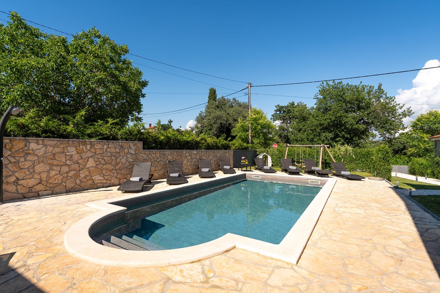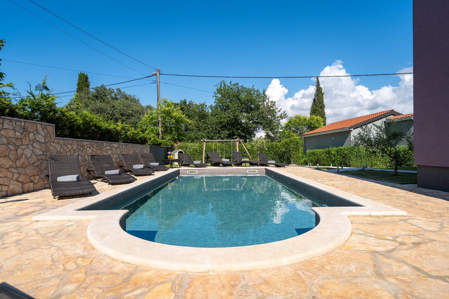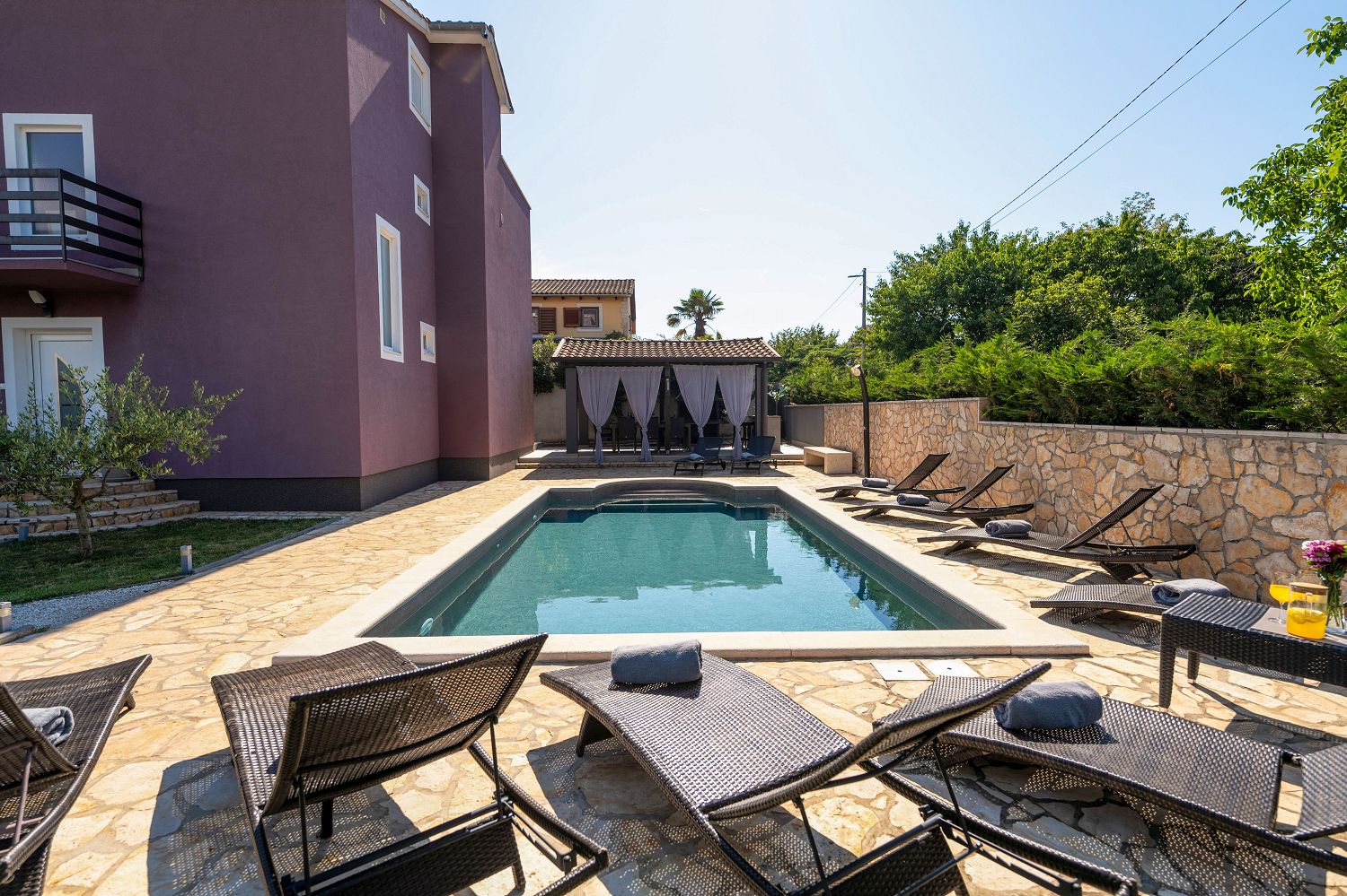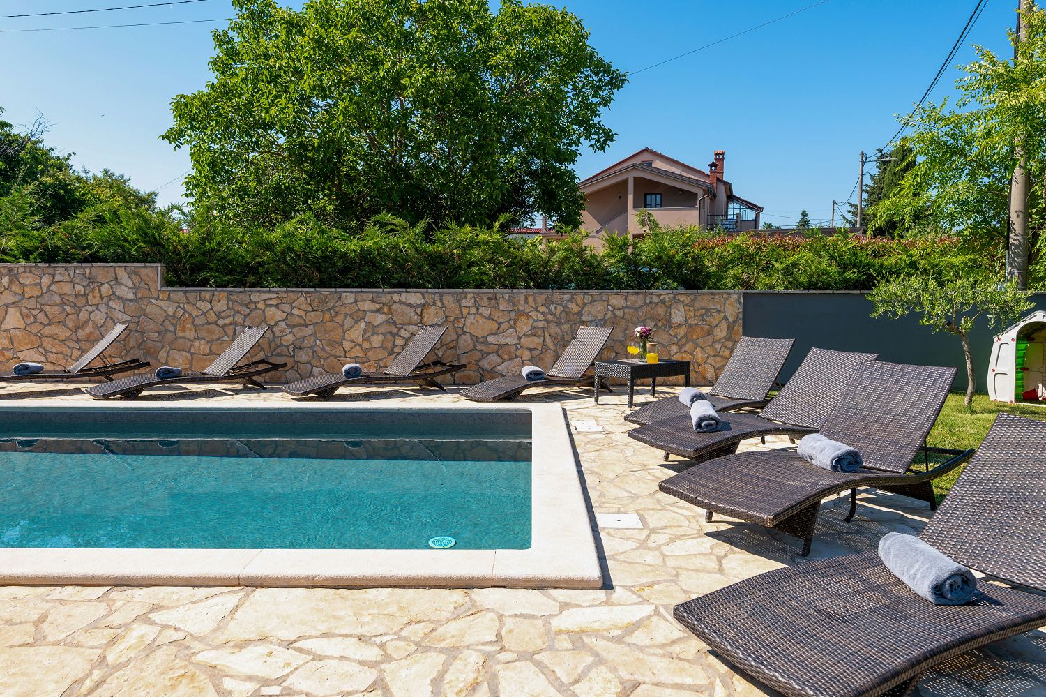 Die Casa liegt im kleinen Dorf Perci, 10 km von Porec und 4 km vom Touristenort Lanterna mit schönen Stränden und verschiedenen Sportmöglichkeiten entfernt. Geschäfte und Restaurants sind im nur wenige Autominuten entfernten Ort Tar erreichbar. Auf dem umzäunten und gepflegten Gartengrundstück (900 m²) stehen den Gästen ein 32 m² großer Pool, zehn Liegestühle mit Badetüchern, zwei Sonnenschirme, eine überdachte Sommerküche mit Grill und Esstisch für Mahlzeiten im Freien sowie ein Kinderspielplatz und vier Parkplätze zur Verfügung. Das Haus verfügt über eine Gesamtfläche von 280 m², die sich auf drei Etagen verteilen. Es ist voll klimatisiert und für bis zu zwölf Personen geeignet. Im Erdgeschoss gibt es eine voll ausgestattete Küche mit Esstisch, ein Wohnzimmer mit Ausgang zur Terrasse mit Gartenmöbeln, ein Schlafzimmer mit Doppelbett, ein Badezimmer mit Dusche/WC, ein Badezimmer mit Badewanne und Waschmaschine sowie eine separate Toilette. Im ersten Stock befinden sich zwei Doppelzimmer, beide mit Zugang zum Balkon, eines davon mit eigenem Bad, ein Zimmer mit getrennten Betten und Zugang zu einem Balkon mit wunderschönem Panoramablick sowie ein Badezimmer mit Dusche/WC im Flur. Im Dachgeschoss gibt es ein 25 m² großes Schlafzimmer mit Doppelbett und Schlafsofa für zwei Personen, ein Badezimmer mit Dusche/WC und eine schöne Dachterrasse mit Liegestühlen. Den Gästen steht außerdem ein Gemeinschaftsraum mit Tischfußball und einem Orbitrek-Fitnessgerät zur Verfügung. Jugendgruppen sind nicht gestattet.