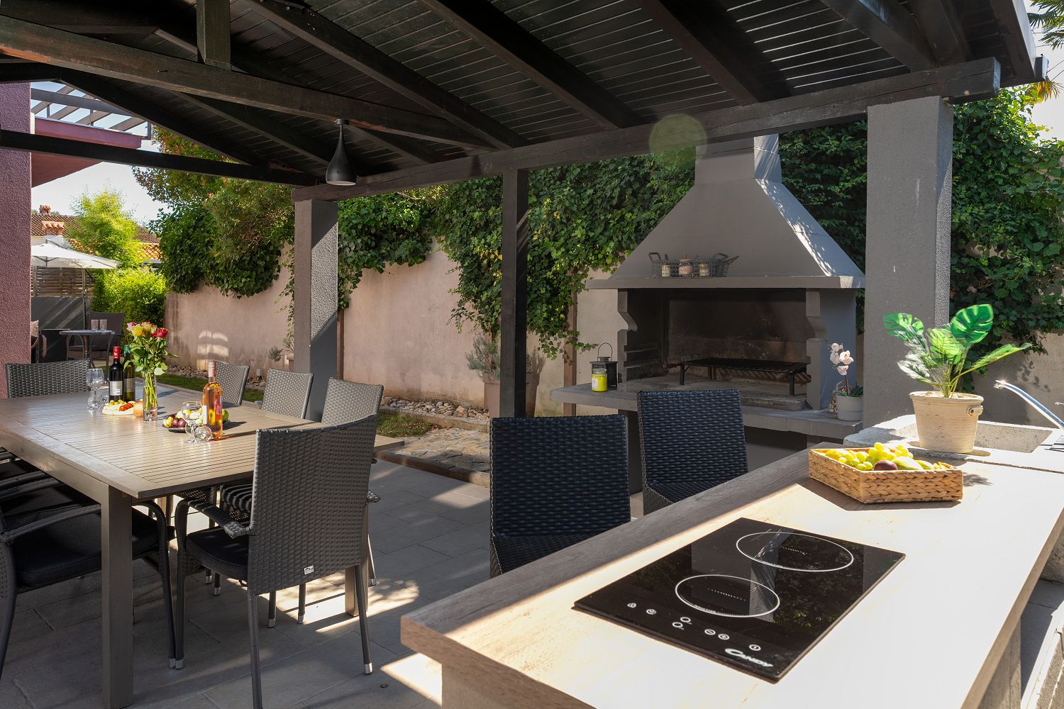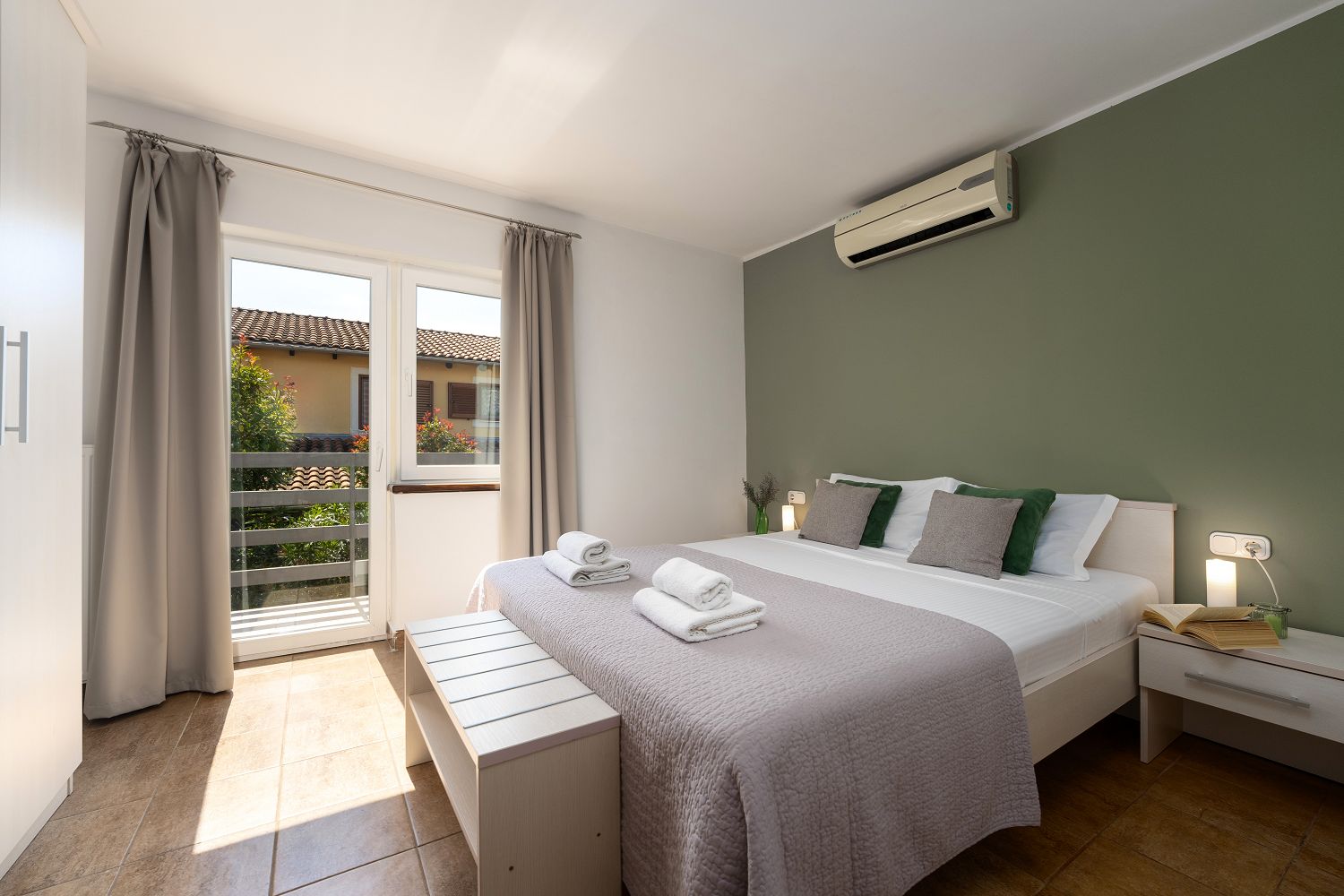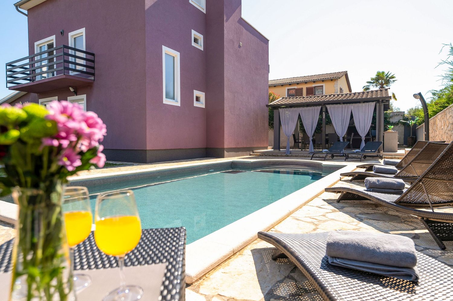 Die Casa liegt im kleinen Dorf Perci, 10 km von Porec und 4 km vom Touristenort Lanterna mit schönen Stränden und verschiedenen Sportmöglichkeiten entfernt. Geschäfte und Restaurants sind im nur wenige Autominuten entfernten Ort Tar erreichbar. Auf dem umzäunten und gepflegten Gartengrundstück (900 m²) stehen den Gästen ein 32 m² großer Pool, zehn Liegestühle mit Badetüchern, zwei Sonnenschirme, eine überdachte Sommerküche mit Grill und Esstisch für Mahlzeiten im Freien sowie ein Kinderspielplatz und vier Parkplätze zur Verfügung. Das Haus verfügt über eine Gesamtfläche von 280 m², die sich auf drei Etagen verteilen. Es ist voll klimatisiert und für bis zu zwölf Personen geeignet. Im Erdgeschoss gibt es eine voll ausgestattete Küche mit Esstisch, ein Wohnzimmer mit Ausgang zur Terrasse mit Gartenmöbeln, ein Schlafzimmer mit Doppelbett, ein Badezimmer mit Dusche/WC, ein Badezimmer mit Badewanne und Waschmaschine sowie eine separate Toilette. Im ersten Stock befinden sich zwei Doppelzimmer, beide mit Zugang zum Balkon, eines davon mit eigenem Bad, ein Zimmer mit getrennten Betten und Zugang zu einem Balkon mit wunderschönem Panoramablick sowie ein Badezimmer mit Dusche/WC im Flur. Im Dachgeschoss gibt es ein 25 m² großes Schlafzimmer mit Doppelbett und Schlafsofa für zwei Personen, ein Badezimmer mit Dusche/WC und eine schöne Dachterrasse mit Liegestühlen. Den Gästen steht außerdem ein Gemeinschaftsraum mit Tischfußball und einem Orbitrek-Fitnessgerät zur Verfügung. Jugendgruppen sind nicht gestattet.