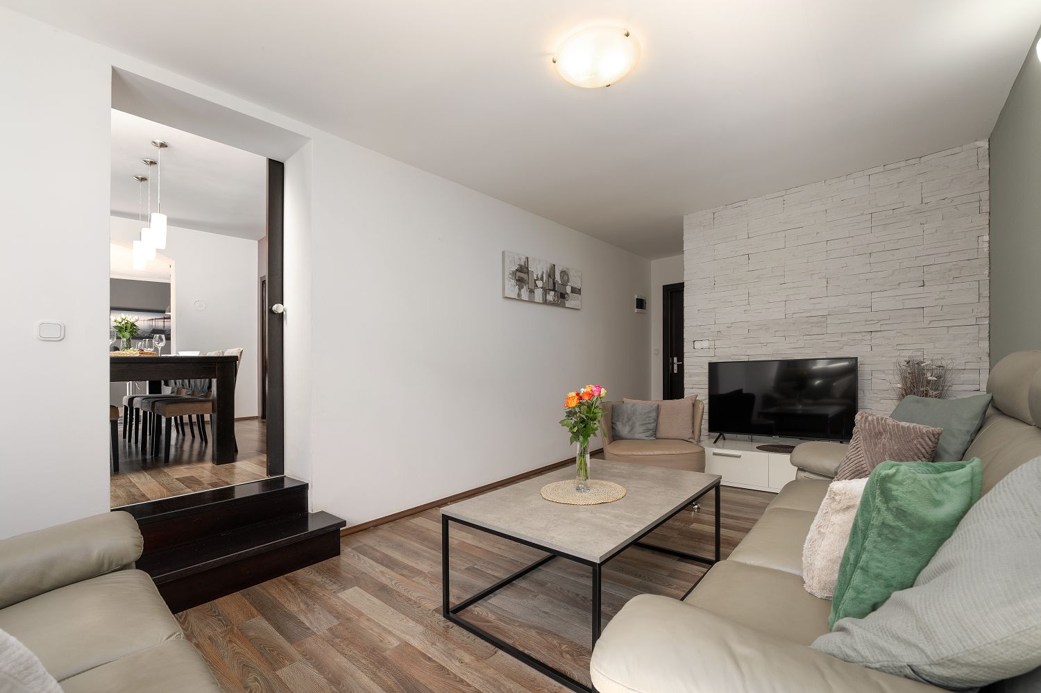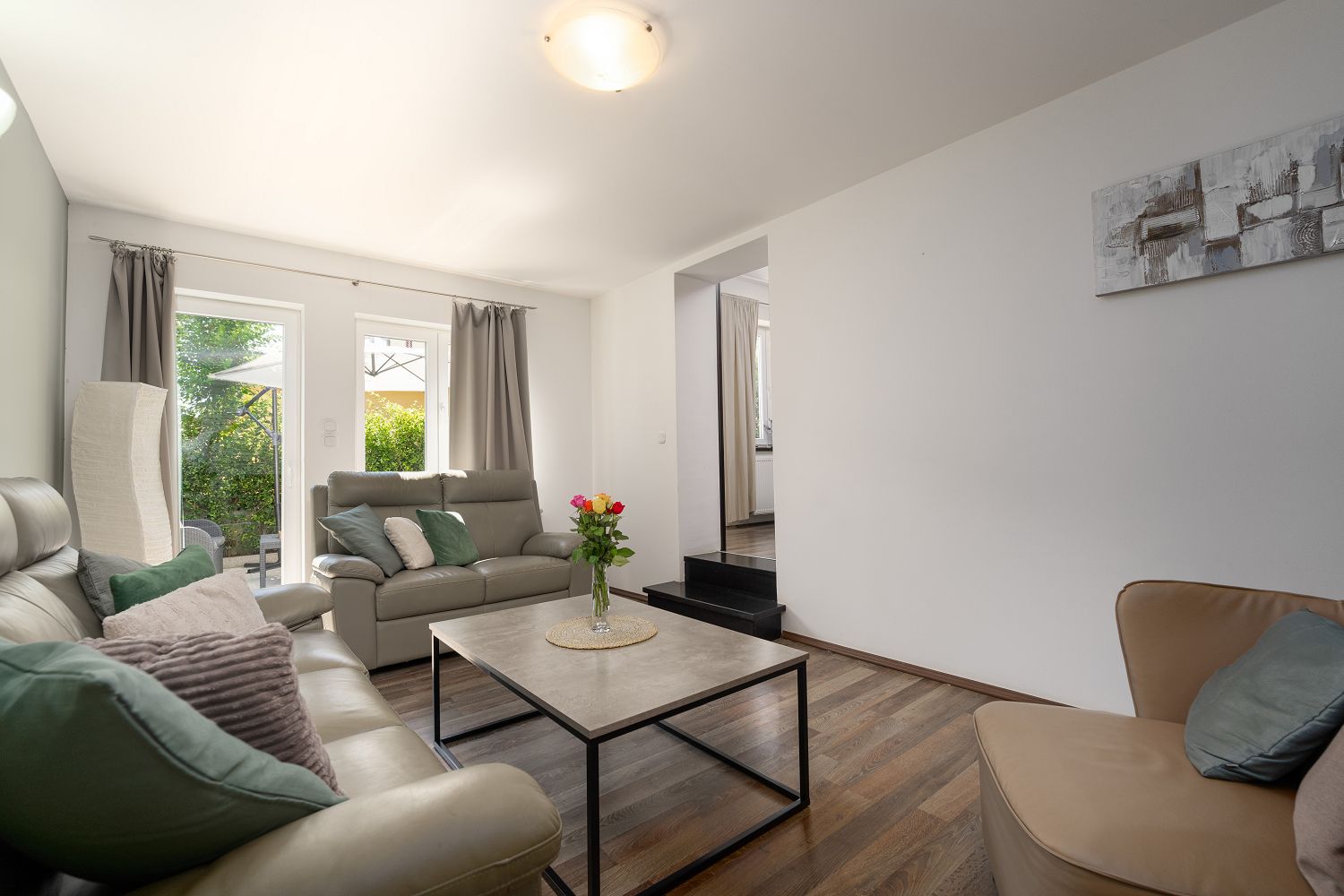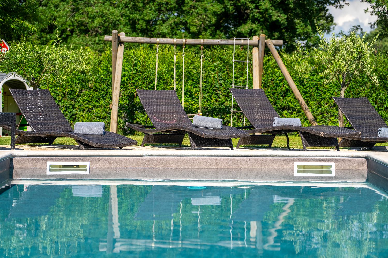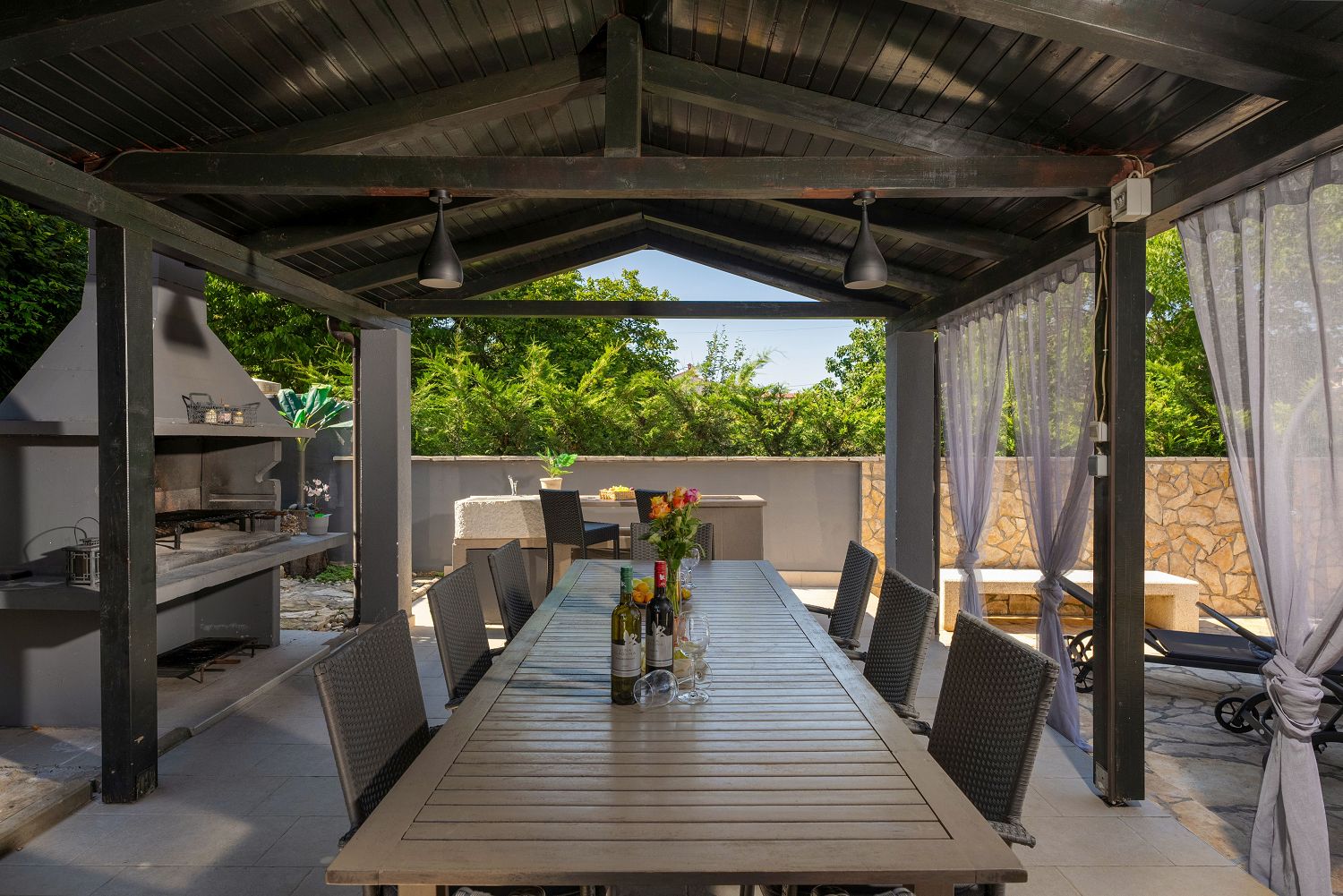 Die Casa liegt im kleinen Dorf Perci, 10 km von Porec und 4 km vom Touristenort Lanterna mit schönen Stränden und verschiedenen Sportmöglichkeiten entfernt. Geschäfte und Restaurants sind im nur wenige Autominuten entfernten Ort Tar erreichbar. Auf dem umzäunten und gepflegten Gartengrundstück (900 m²) stehen den Gästen ein 32 m² großer Pool, zehn Liegestühle mit Badetüchern, zwei Sonnenschirme, eine überdachte Sommerküche mit Grill und Esstisch für Mahlzeiten im Freien sowie ein Kinderspielplatz und vier Parkplätze zur Verfügung. Das Haus verfügt über eine Gesamtfläche von 280 m², die sich auf drei Etagen verteilen. Es ist voll klimatisiert und für bis zu zwölf Personen geeignet. Im Erdgeschoss gibt es eine voll ausgestattete Küche mit Esstisch, ein Wohnzimmer mit Ausgang zur Terrasse mit Gartenmöbeln, ein Schlafzimmer mit Doppelbett, ein Badezimmer mit Dusche/WC, ein Badezimmer mit Badewanne und Waschmaschine sowie eine separate Toilette. Im ersten Stock befinden sich zwei Doppelzimmer, beide mit Zugang zum Balkon, eines davon mit eigenem Bad, ein Zimmer mit getrennten Betten und Zugang zu einem Balkon mit wunderschönem Panoramablick sowie ein Badezimmer mit Dusche/WC im Flur. Im Dachgeschoss gibt es ein 25 m² großes Schlafzimmer mit Doppelbett und Schlafsofa für zwei Personen, ein Badezimmer mit Dusche/WC und eine schöne Dachterrasse mit Liegestühlen. Den Gästen steht außerdem ein Gemeinschaftsraum mit Tischfußball und einem Orbitrek-Fitnessgerät zur Verfügung. Jugendgruppen sind nicht gestattet.