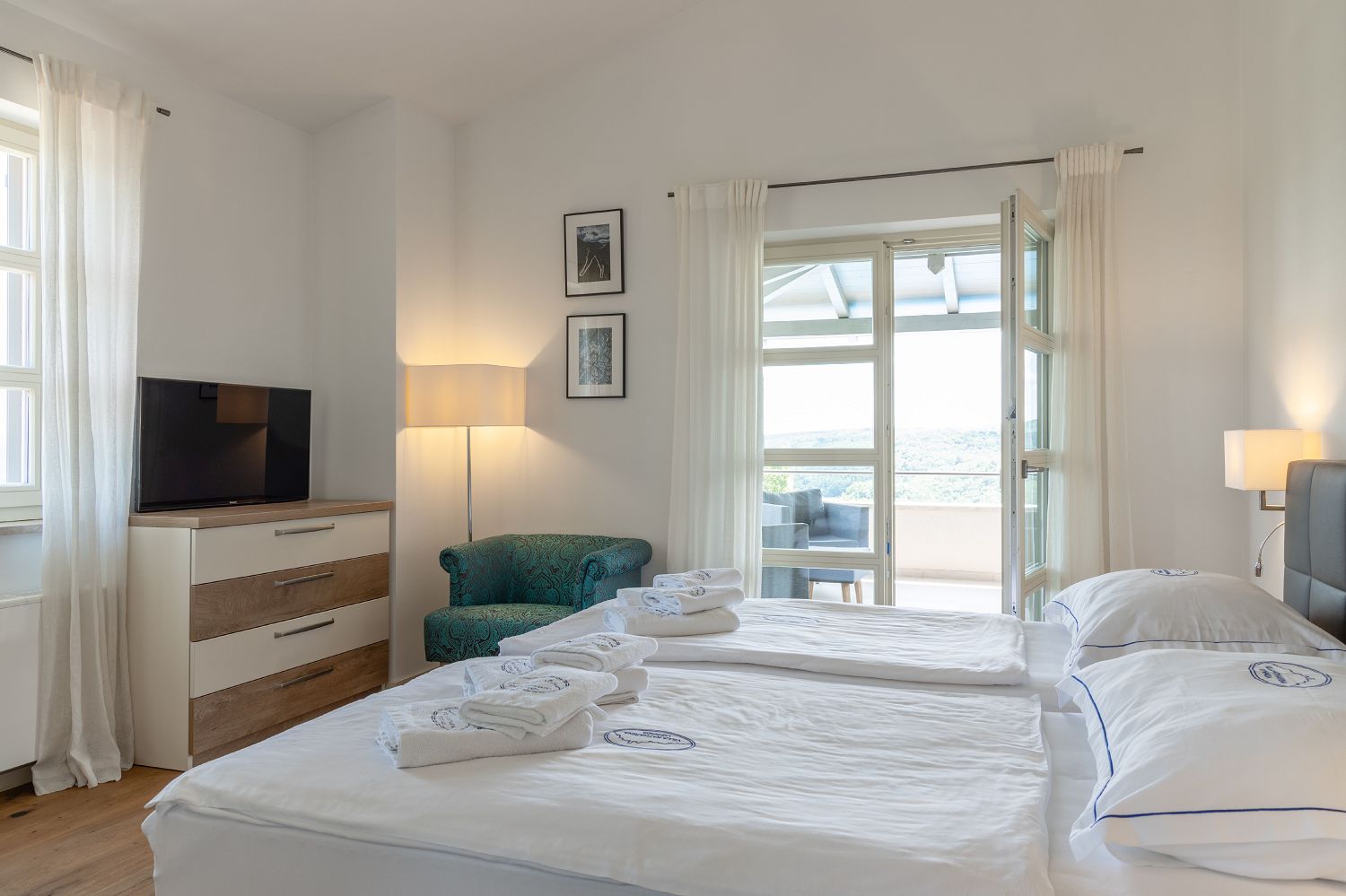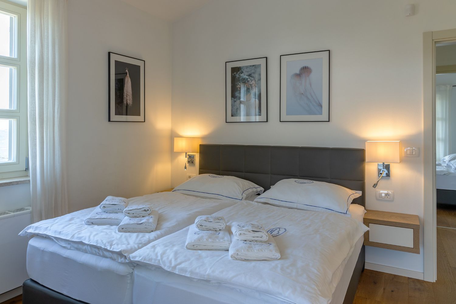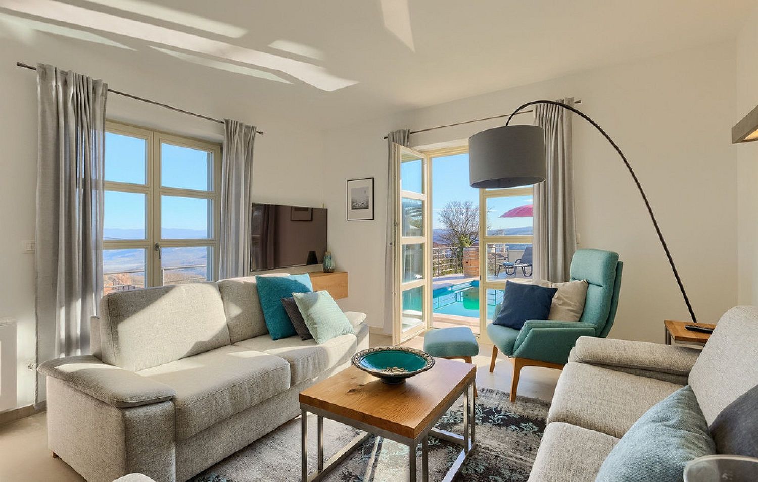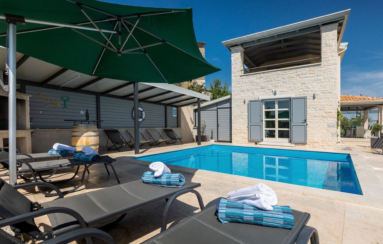 Die Villa ist ein neu erbautes Haus im istrischen Stil. Sie liegt am Rande von Vižinada und bietet einen wunderschönen Panoramablick auf Motovun und das grüne Landesinnere Istriens. Porec ist nur 20 Autominuten entfernt. Bis zum Touristenort Lanterna mit seinen schönen und gepflegten Kies- und Felsstränden sind es nur 17 Kilometer. In der Nähe gibt es mehrere Wein- und Olivenölstraßen sowie bekannte Weingüter. Für Radsportfans befindet sich in der Nähe auch der Parenzana-Rad-/Wanderweg. Das komplett eingezäunte 850 m² große Grundstück verfügt über einen 33 m² großen Pool, eine überdachte Terrasse mit Esstisch zum Verweilen und Essen im Freien, Liegestühle und einen gemauerten Grill. Im Hof befinden sich Parkplätze für zwei Fahrzeuge, außerdem ist ein Fahrradabstellraum vorhanden. Das schöne Ferienhaus mit Pool erstreckt sich über insgesamt 168 m² auf zwei vollklimatisierten Etagen. Im Erdgeschoss befindet sich ein Wohnraum mit einer voll ausgestatteten Küche, einem Esstisch, einem Wohnzimmer mit Schlafsofa für zwei Personen und einem Kamin sowie eine separate Toilette. Vom Esszimmer aus haben Sie Zugang zur schönen, überdachten Terrasse, die einen herrlichen Blick auf Motovun und die grüne Umgebung bietet. Ein Schlafzimmer mit Doppelbett und eigenem Bad mit Dusche und WC befindet sich ebenfalls im Erdgeschoss. In der ersten Etage befinden sich zwei geräumige Schlafzimmer mit jeweils eigenem Bad mit Dusche und einem geräumigen Balkon mit Sitzgelegenheiten, von dem aus Sie einen herrlichen Blick auf die grüne Landschaft haben. Kleinere Haustiere sind auf Anfrage möglich. Jugendgruppen sind nicht gestattet.