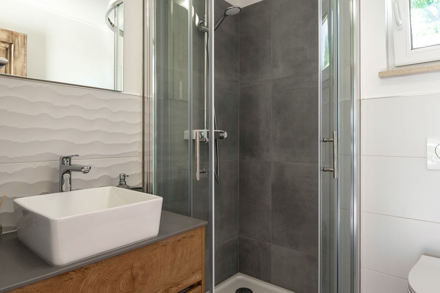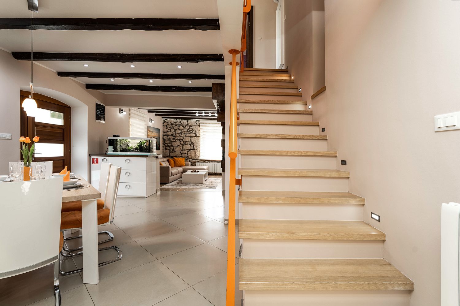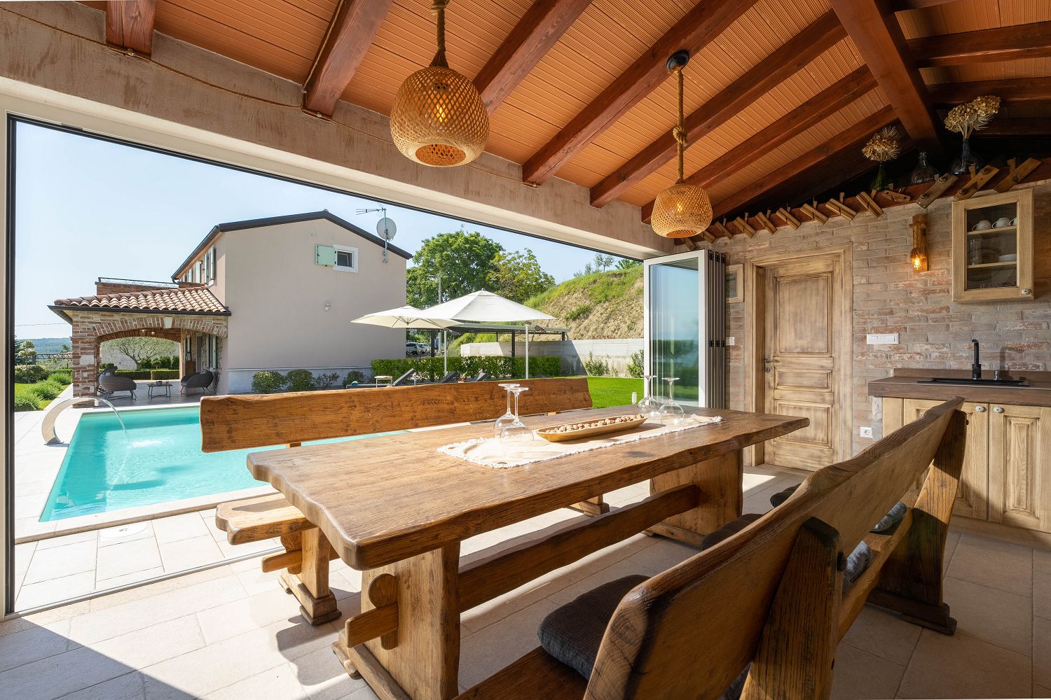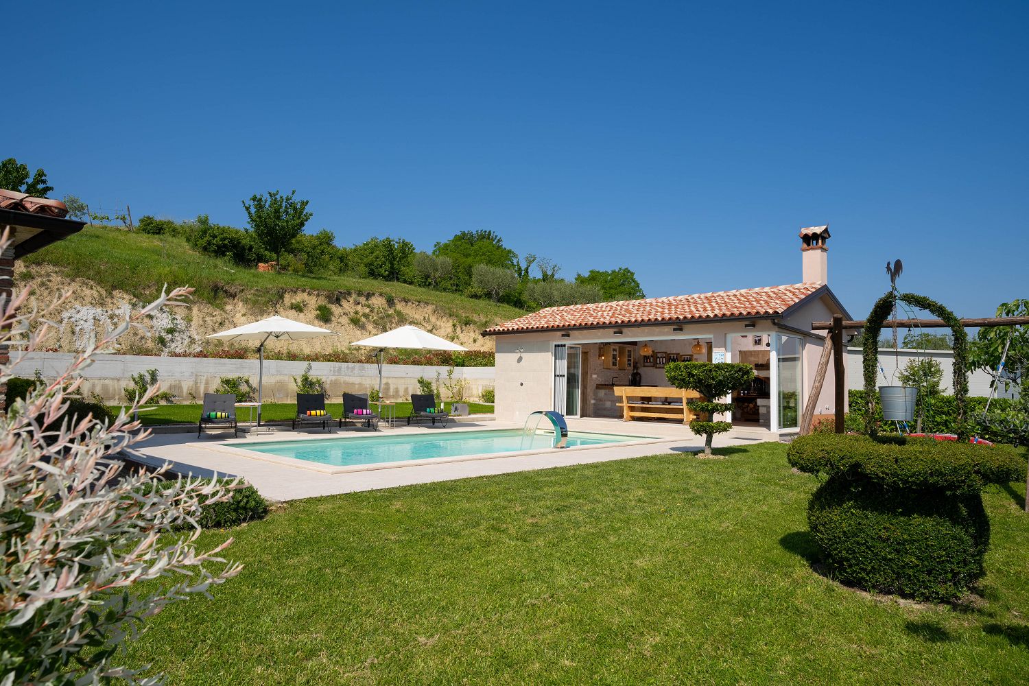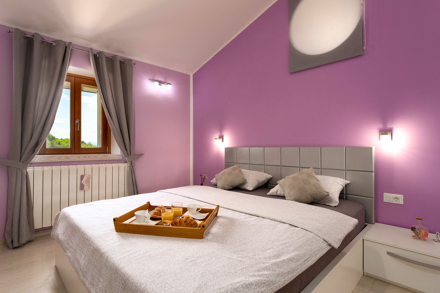 Die Villa ist ein komplett renoviertes istrisches Steinhaus am Rande von Vižinada. Von dort aus hat man einen wunderschönen Panoramablick auf Motovun und das grüne Landesinnere Istriens. Die Stadt Porec ist nur 20 Autominuten entfernt. Bis zum Touristenort Lanterna mit seinen schönen und gepflegten Kies- und Felsstränden sind es nur 17 Kilometer. In der Nähe des Hauses befinden sich mehrere Wein- und Olivenölstraßen sowie bekannte Weingüter. Das Haus liegt in einem 700 m² großen, gepflegten und vollständig eingezäunten Garten und bietet seinen Gästen einen 32 m² großen Pool, Liegestühle, Schaukeln für Kinder, zwei überdachte Terrassen zum Verweilen und Essen im Freien sowie eine Taverne in einem separaten Gebäude mit ausgestatteter Küche, Kamin und Dusche/WC. Im Hof stehen auch überdachte Parkplätze für zwei Fahrzeuge zur Verfügung. Die Villa erstreckt sich über insgesamt 100 m² auf zwei klimatisierten Etagen. Im Erdgeschoss befindet sich ein Wohnbereich mit einer voll ausgestatteten Küche, einem Esstisch und einem Wohnzimmer sowie eine separate Toilette. Am Eingang des Hauses befindet sich eine schöne, überdachte Terrasse mit Loungemöbeln und schöner Aussicht. Im ersten Stock befinden sich ein Schlafzimmer mit Doppelbett, zwei Einzelzimmer und ein Badezimmer mit Dusche und WC. Von einem der Zimmer aus gelangt man auf einen geräumigen Balkon mit Sitzgelegenheiten, von dem aus sich ein herrlicher Blick auf Motovun und die grüne Landschaft bietet. Jugendgruppen sind nicht gestattet.