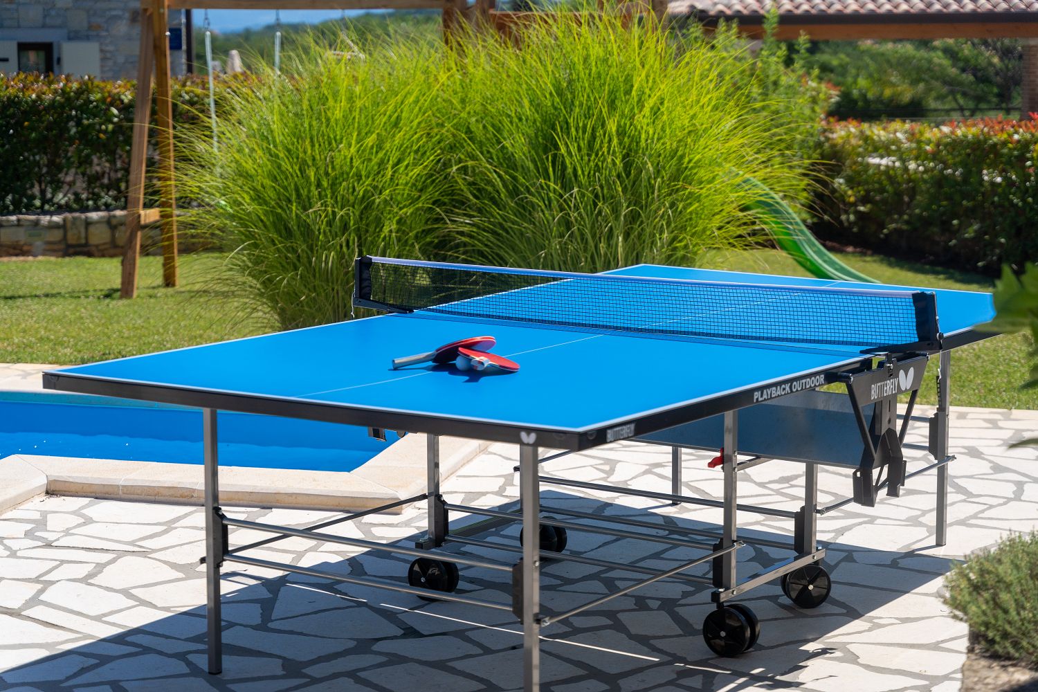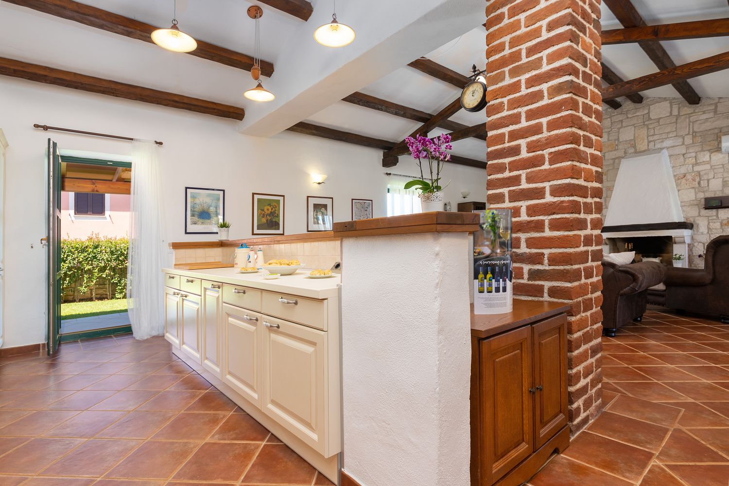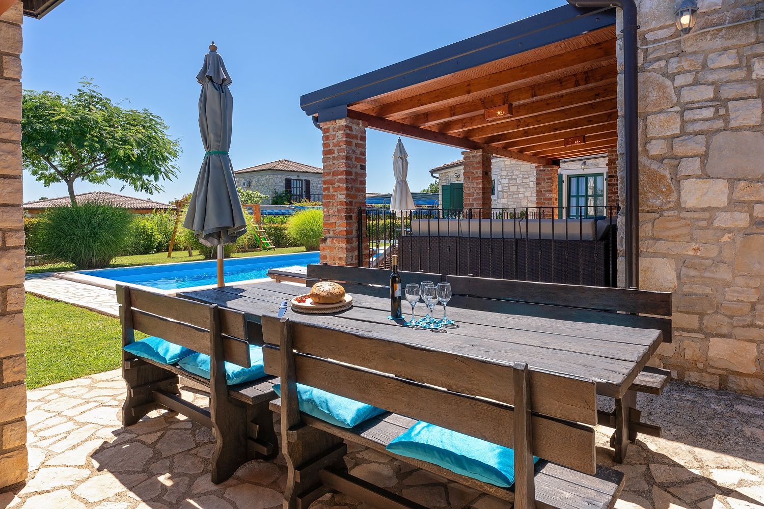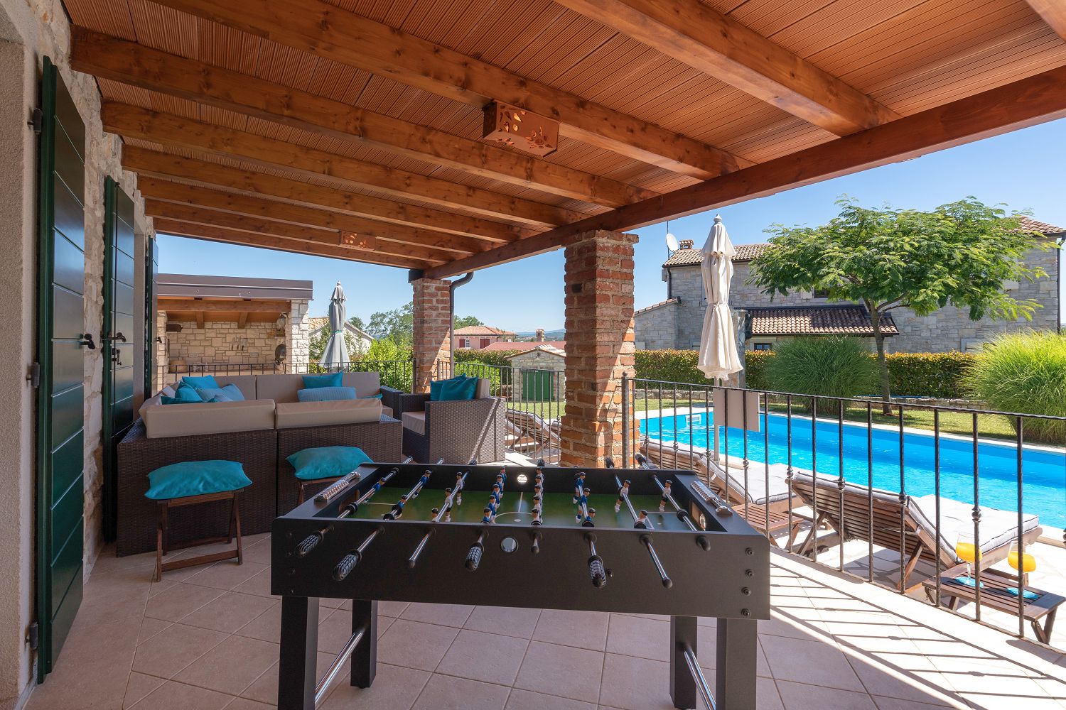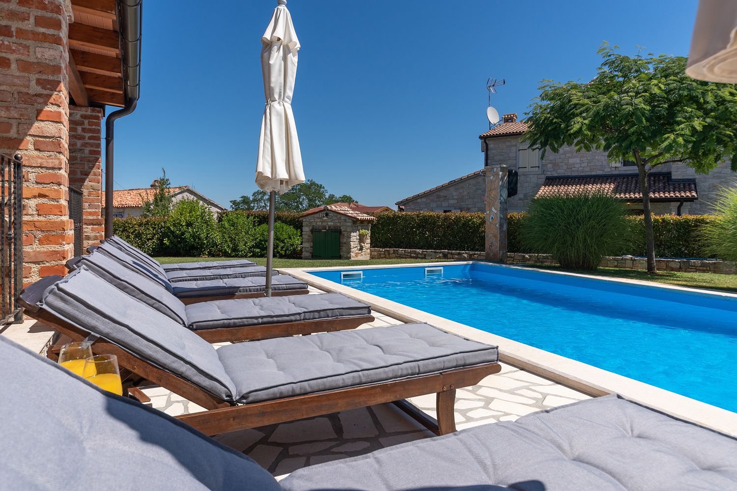 Die wunderschöne Villa befindet sich am Rande des malerischen Städtchens Vižinada, ca. 18 km von der Küste zwischen Tar und Vabriga entfernt. Das im Jahr 2008 mit viel Liebe zum Detail im istrischen Landhausstil erbaute Haus verfügt über einen Außenpool. Auf dem 1.200 m² großen, geschlossenen und gepflegten Grundstück stehen den Gästen ein 34 m² großer Pool mit Liegen, ein gemauerter Grill mit Esstisch, ein Tischfußballspiel, ein Kinderspielplatz, eine Tischtennisplatte und drei überdachte Parkplätze zur Verfügung. Das nächste Geschäft, eine Kaffeebar und ein Geldautomat befinden sich im vier Kilometer entfernten Dorf Vižinada, während eine Pizzeria und eine typische Taverne nur drei Kilometer vom Haus entfernt sind. Der Touristenort Lanterna mit seinen wunderschönen Stränden liegt nur 15 km von der Villa entfernt. Für Radsportbegeisterte befindet sich in der Nähe auch der Rad-/Wanderweg Parenzana. Die Villa verfügt über eine Wohnfläche von 250 m² auf zwei Etagen und bietet Platz für acht Personen. Über den Haupteingang erreichen Sie das große Wohnzimmer mit Zugang zu einer überdachten Terrasse mit Loungemöbeln und Garten sowie eine Landhausküche mit Esstisch und Zugang zu einer weiteren überdachten Terrasse. Im Erdgeschoss gibt es außerdem drei Schlafzimmer, eines davon mit eigenem Bad mit Badewanne/Dusche. Im Flur befindet sich ein Badezimmer mit Badewanne/Dusche und ein separates WC. Im ersten Stock befindet sich ein geräumiges Schlafzimmer mit Doppelbett, einem eigenen Badezimmer mit Badewanne und einem Balkon. Von diesem Schlafzimmer aus haben Sie einen wunderschönen Blick auf die Umgebung.