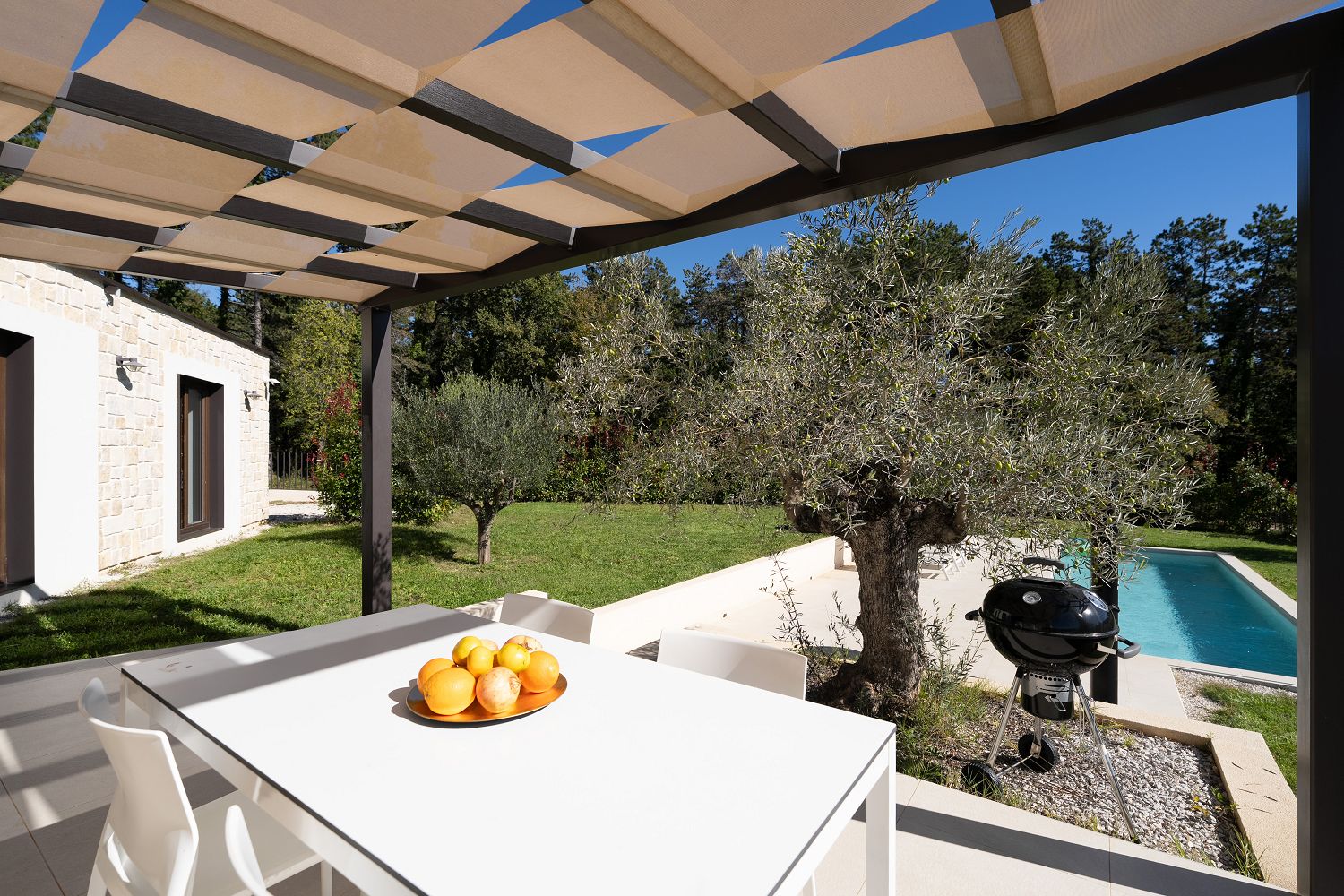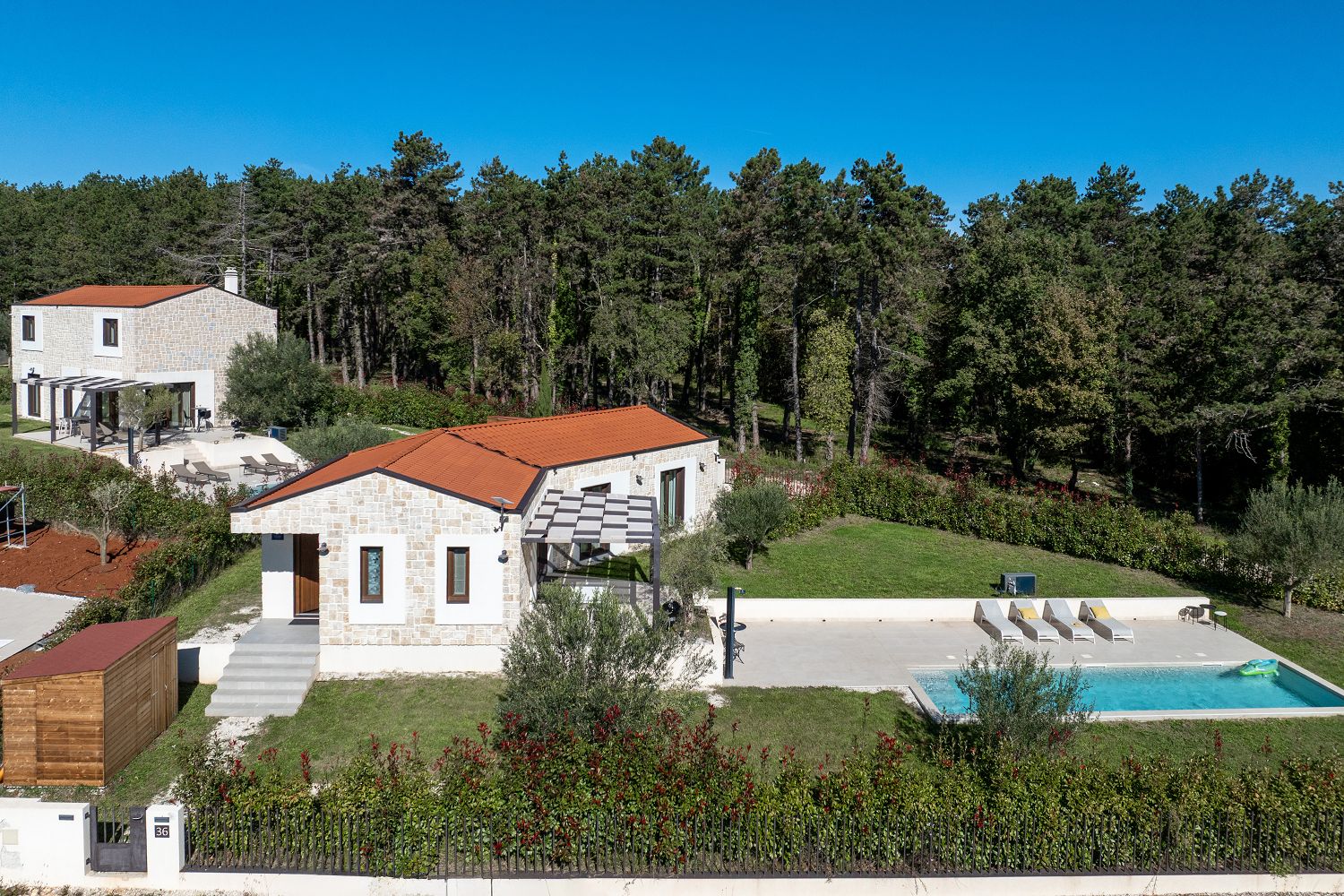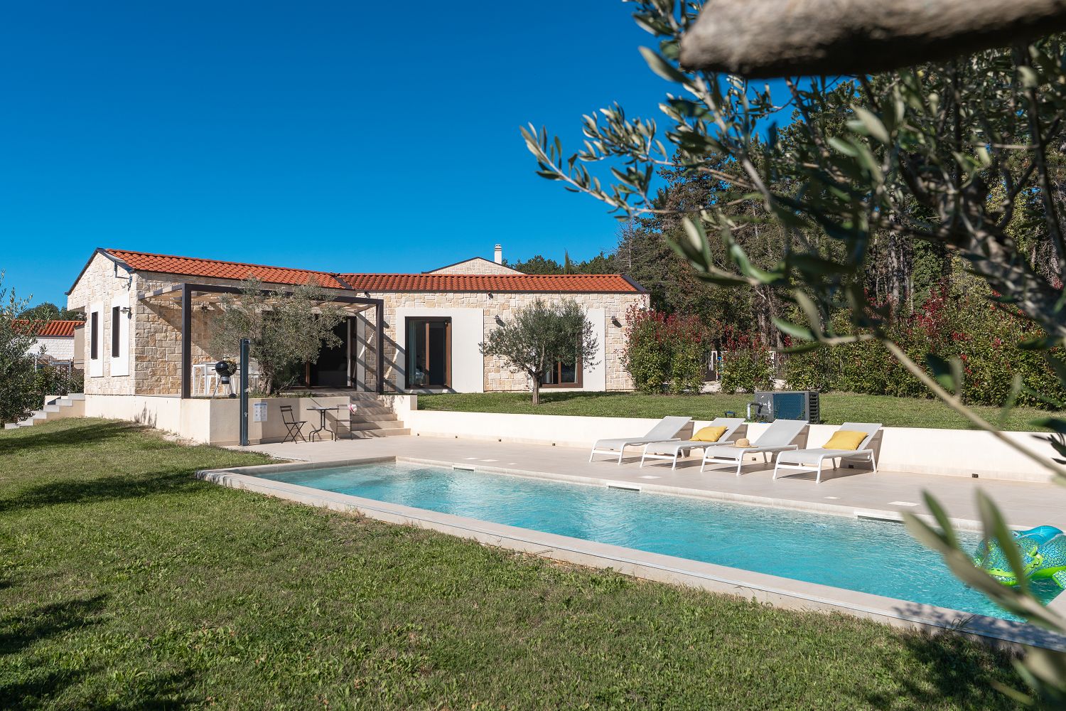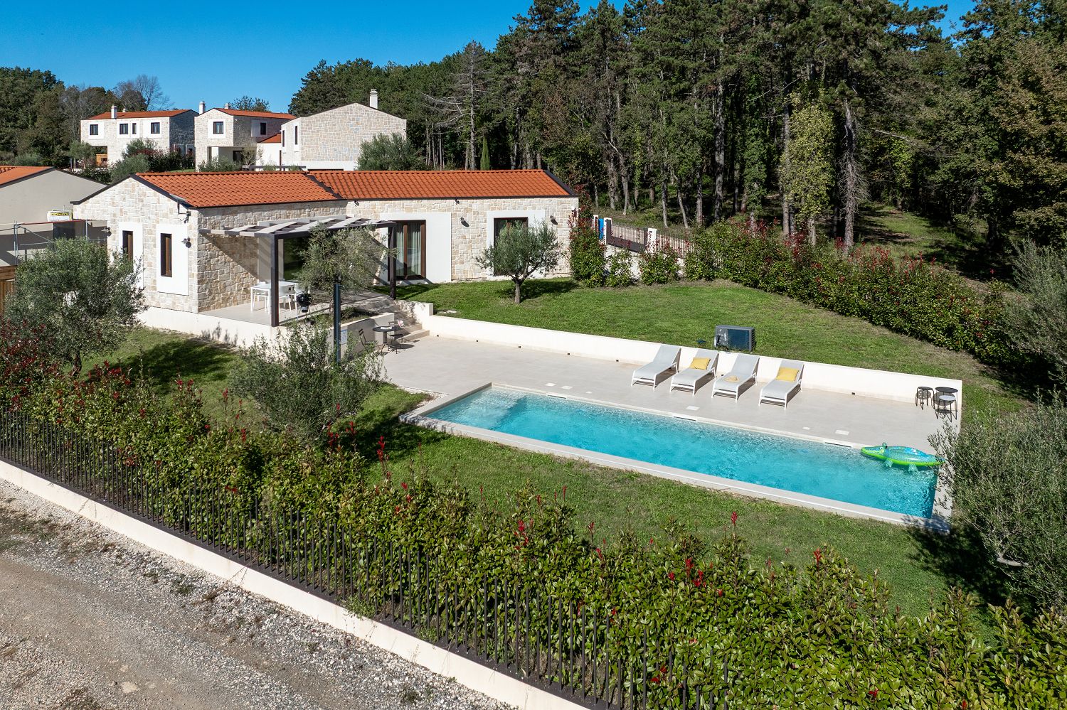 Die Villa liegt im Dorf Majkusi im grünen Landesinneren Istriens, ca. 17 km von Porec und den Stränden entfernt. Das nächste Restaurant und Geschäft befindet sich im 5 km entfernten Baderna. In der Nähe gibt es zahlreiche Sehenswürdigkeiten in Porec, Novigrad, Motovun und Pazin. Das Haus liegt am Waldrand auf einem 784 m² großen, eingezäunten Grundstück und bietet den Gästen folgende Außenausstattung: einen 40 m² großen Pool, Liegestühle, einen gepflegten Rasen, eine überdachte Terrasse am Pool mit Grill sowie zwei Parkplätze. Auf Anfrage kann der Pool beheizt werden, sodass auch in den nicht zu heißen Monaten vor oder nach der Saison ein erfrischendes Bad möglich ist. Die Villa für vier Personen ist ein modernes, neu erbautes Ferienhaus mit einer Wohnfläche von 110 m², die sich alle im Erdgeschoss befinden. Diese wunderschöne Villa verbindet eine rustikale Steinfassade mit einem modernen Interieur in neutralen Farben und mit stilvollen Details. Sie verfügt über ein geräumiges Wohnzimmer mit Zugang zum Außenbereich, einen Esstisch und eine voll ausgestattete Küche, die sich alle in einem Raum befinden, zwei Schlafzimmer, jeweils mit Bad und Ausgang zum Pool, sowie ein separates WC. Das gesamte Haus ist klimatisiert und verfügt über ein starkes Starlink-WLAN. Wenn Sie einen besonderen Urlaub verbringen möchten, an den Sie sich gerne erinnern werden, ist diese Villa die richtige Wahl für Sie. Jugendgruppen sind nicht gestattet.