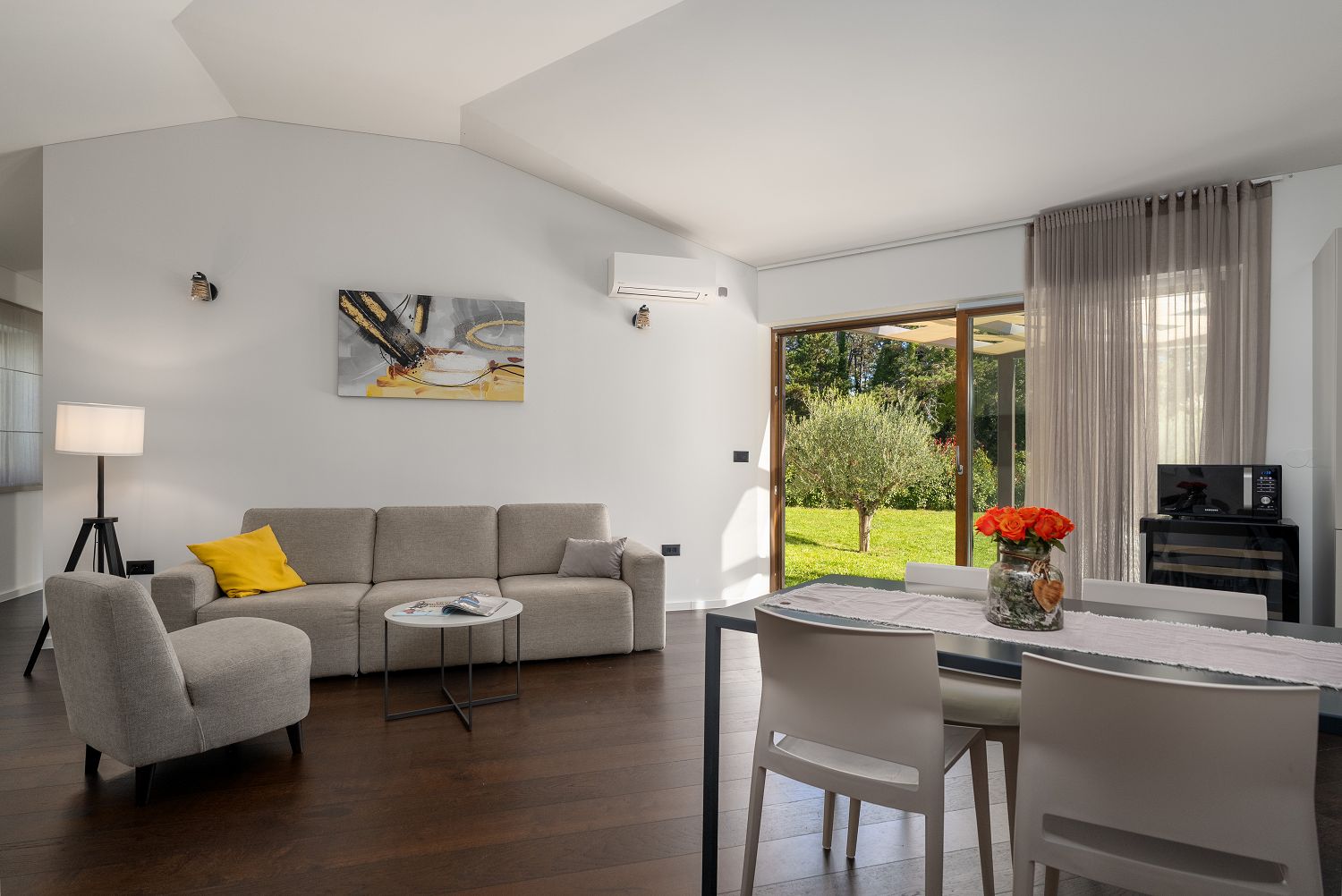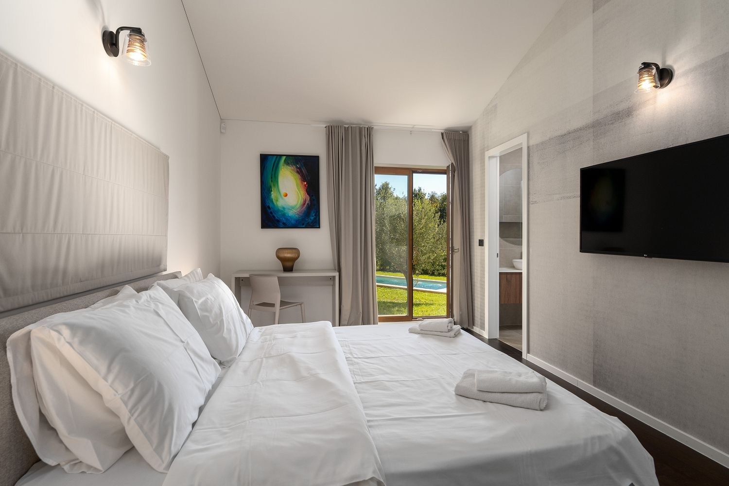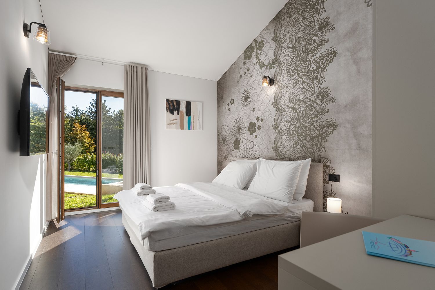 Die Villa liegt im Dorf Majkusi im grünen Landesinneren Istriens, ca. 17 km von Porec und den Stränden entfernt. Das nächste Restaurant und Geschäft befindet sich im 5 km entfernten Baderna. In der Nähe gibt es zahlreiche Sehenswürdigkeiten in Porec, Novigrad, Motovun und Pazin. Das Haus liegt am Waldrand auf einem 784 m² großen, eingezäunten Grundstück und bietet den Gästen folgende Außenausstattung: einen 40 m² großen Pool, Liegestühle, einen gepflegten Rasen, eine überdachte Terrasse am Pool mit Grill sowie zwei Parkplätze. Auf Anfrage kann der Pool beheizt werden, sodass auch in den nicht zu heißen Monaten vor oder nach der Saison ein erfrischendes Bad möglich ist. Die Villa für vier Personen ist ein modernes, neu erbautes Ferienhaus mit einer Wohnfläche von 110 m², die sich alle im Erdgeschoss befinden. Diese wunderschöne Villa verbindet eine rustikale Steinfassade mit einem modernen Interieur in neutralen Farben und mit stilvollen Details. Sie verfügt über ein geräumiges Wohnzimmer mit Zugang zum Außenbereich, einen Esstisch und eine voll ausgestattete Küche, die sich alle in einem Raum befinden, zwei Schlafzimmer, jeweils mit Bad und Ausgang zum Pool, sowie ein separates WC. Das gesamte Haus ist klimatisiert und verfügt über ein starkes Starlink-WLAN. Wenn Sie einen besonderen Urlaub verbringen möchten, an den Sie sich gerne erinnern werden, ist diese Villa die richtige Wahl für Sie. Jugendgruppen sind nicht gestattet.