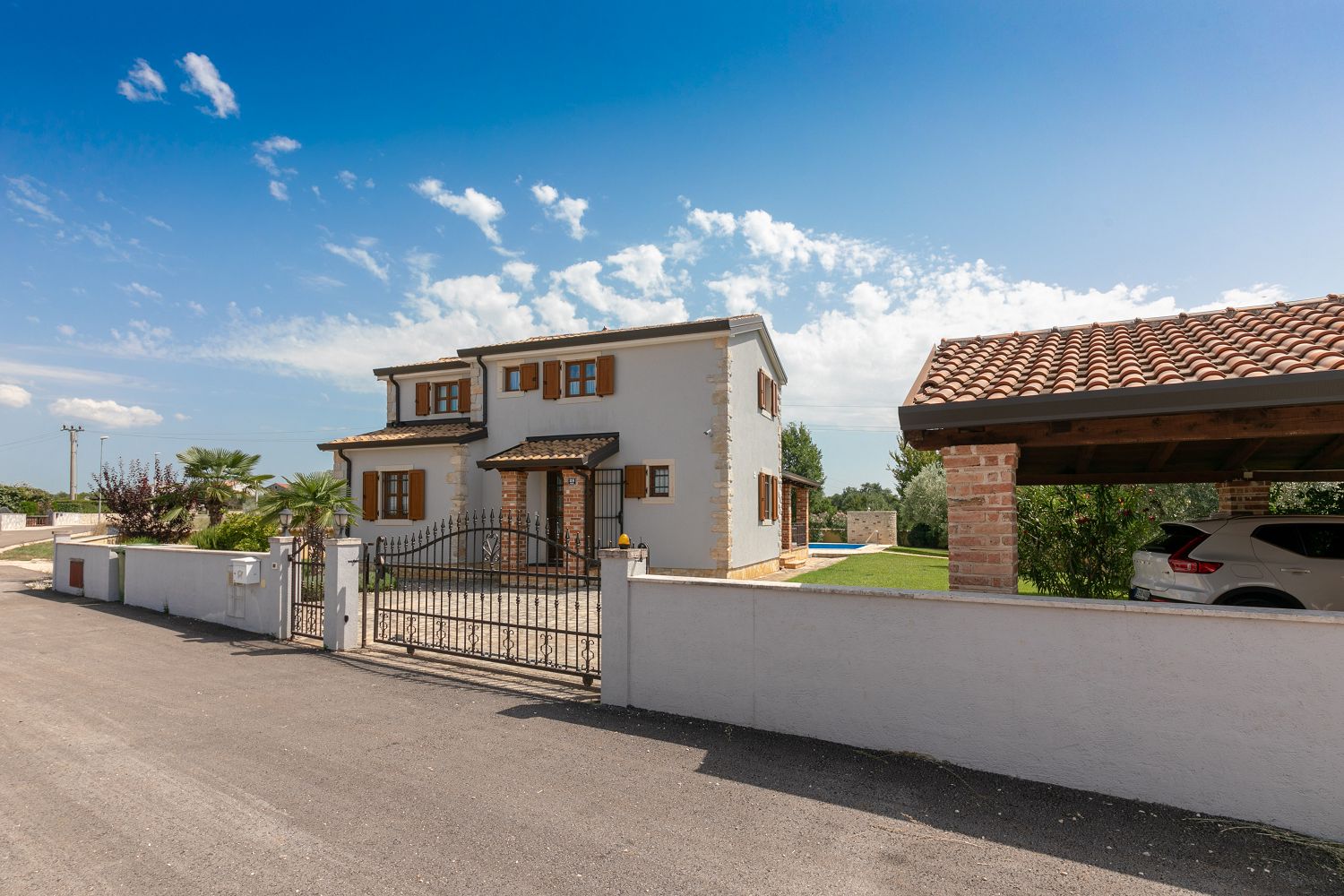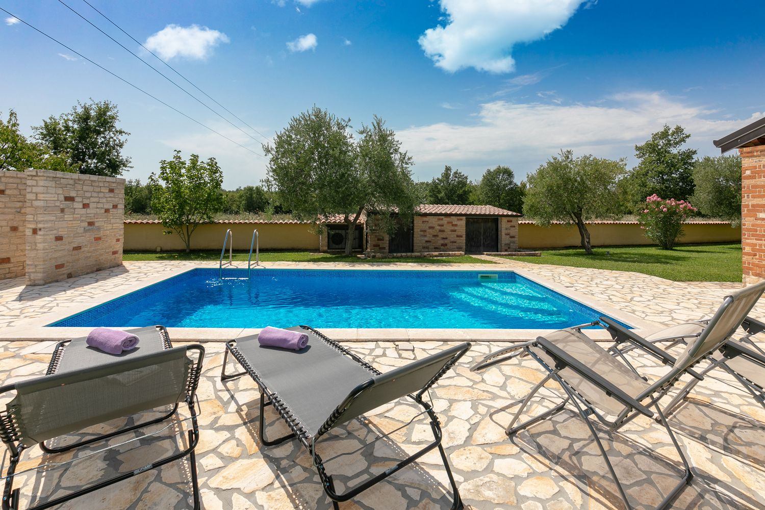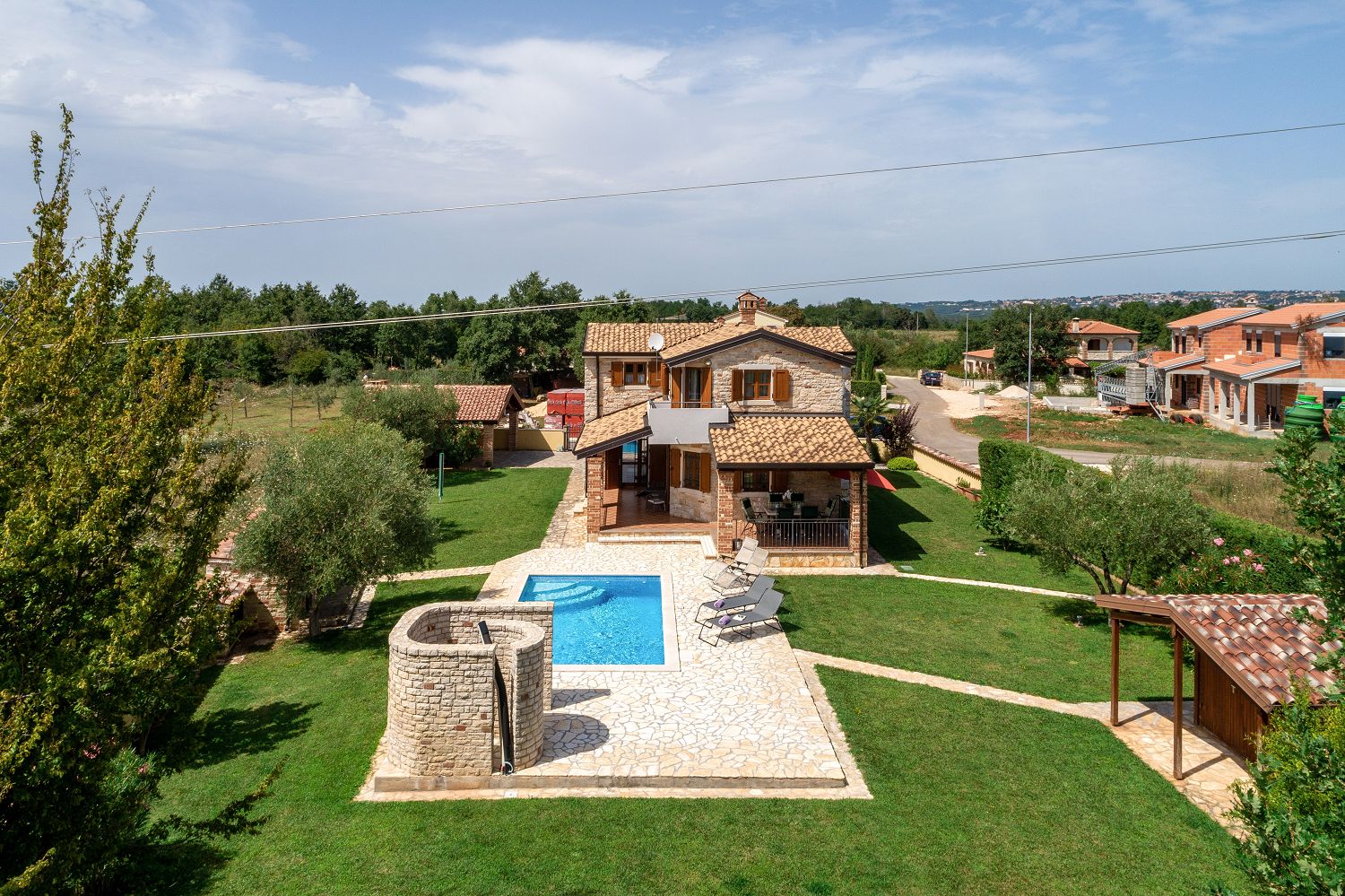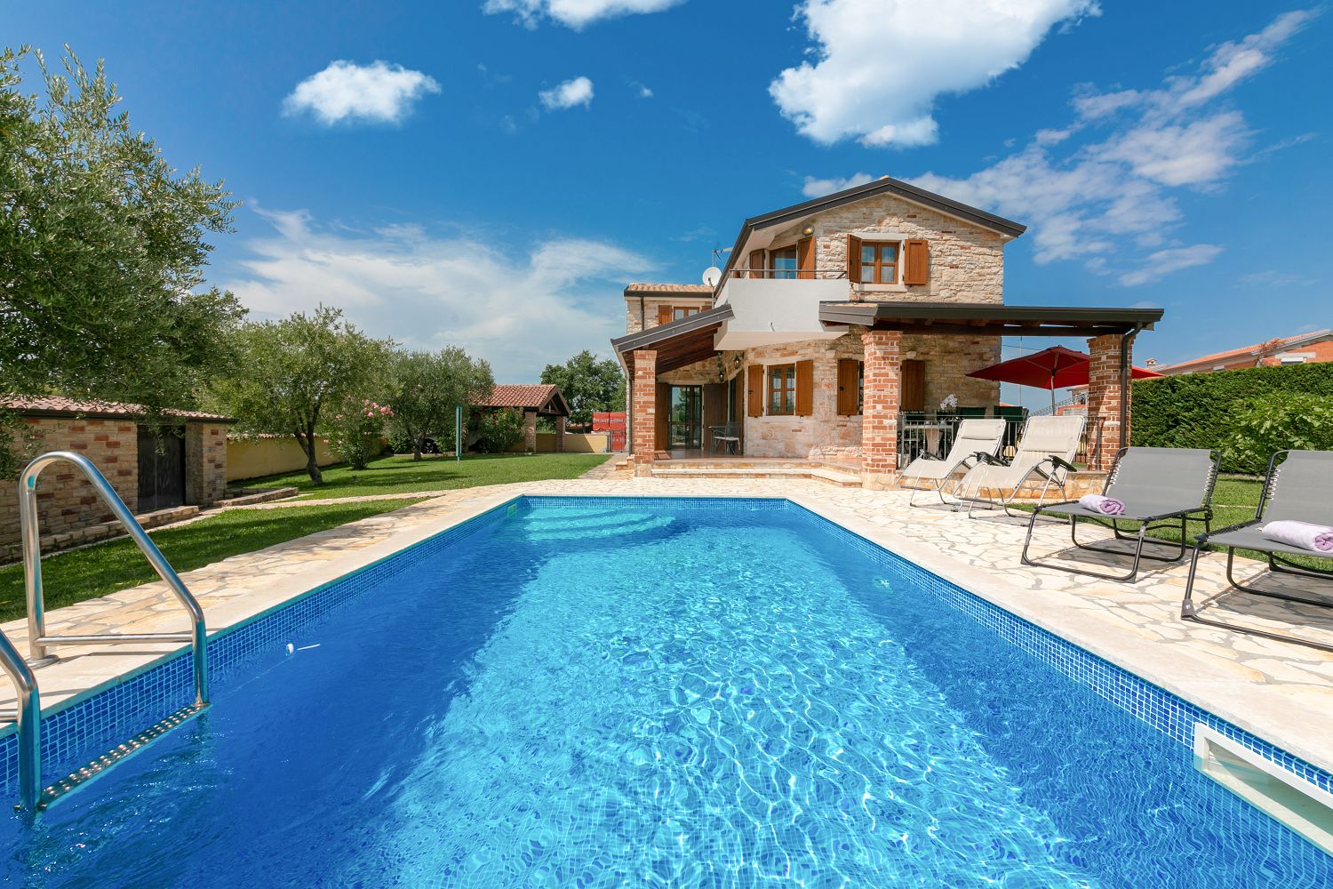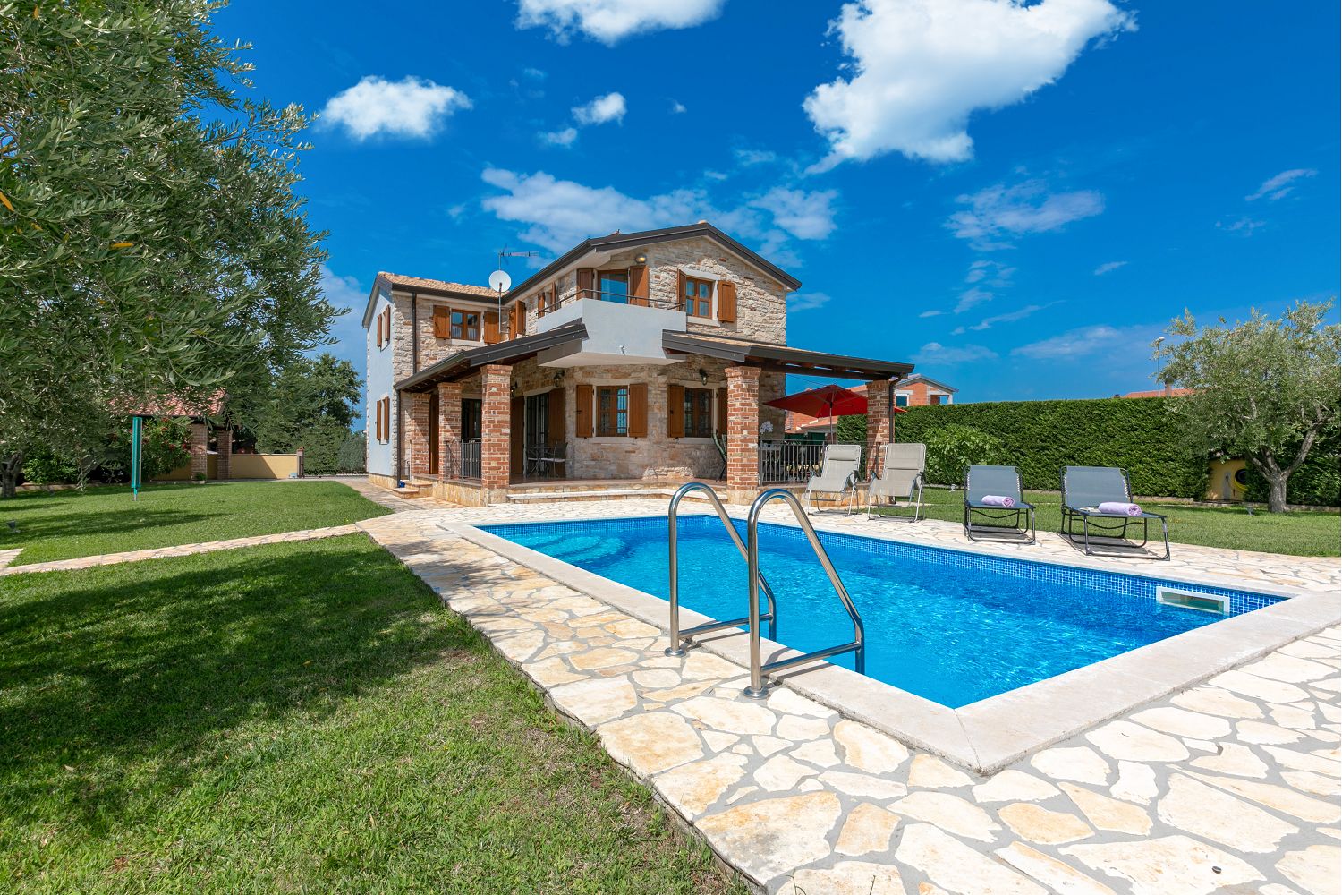 Die Villa liegt am Rande des Dorfes Radosi, unweit von Porec und ca. 8 km von den ersten Stränden entfernt. Geschäfte, Restaurants und Ähnliches befinden sich in Višnjan bzw. Nova Vas. Das Ferienhaus liegt in einer sehr ruhigen Lage auf einem 1.300 m² großen, umzäunten Grundstück. Den Gästen stehen ein 28 m² großer Salzwasser-Außenpool mit Liegen, ein Jacuzzi, eine überdachte Terrasse mit Esstisch, ein gemauerter Grill, ein gepflegter Garten mit Blumen, ein Kinderspielplatz, eine Tischtennisplatte und ein Parkplatz für zwei Autos zur Verfügung. Das Haus bietet auf zwei Etagen eine Wohnfläche von 185 m² und Platz für 6–8 Personen. Im Erdgeschoss befindet sich der geschmackvoll eingerichtete Wohnbereich mit Kamin, die moderne Küche mit Esstisch und Ausgang auf die überdachte Terrasse und in den Garten, ein Schlafzimmer mit Doppelbett und ein Badezimmer mit Dusche. Im ersten Stock befindet sich ein geräumiges Schlafzimmer mit Doppelbett und eigenem Badezimmer mit Dusche. Von hier aus hat man Zugang zu einem Balkon mit traumhaftem Ausblick. Zwei weitere Schlafzimmer teilen sich ein Badezimmer mit Wanne im Flur. Wenn Sie einen erholsamen, ruhigen Urlaub mit Ihren Liebsten verbringen möchten, ist die Villa die richtige Wahl. Jugendgruppen sind nicht erlaubt.