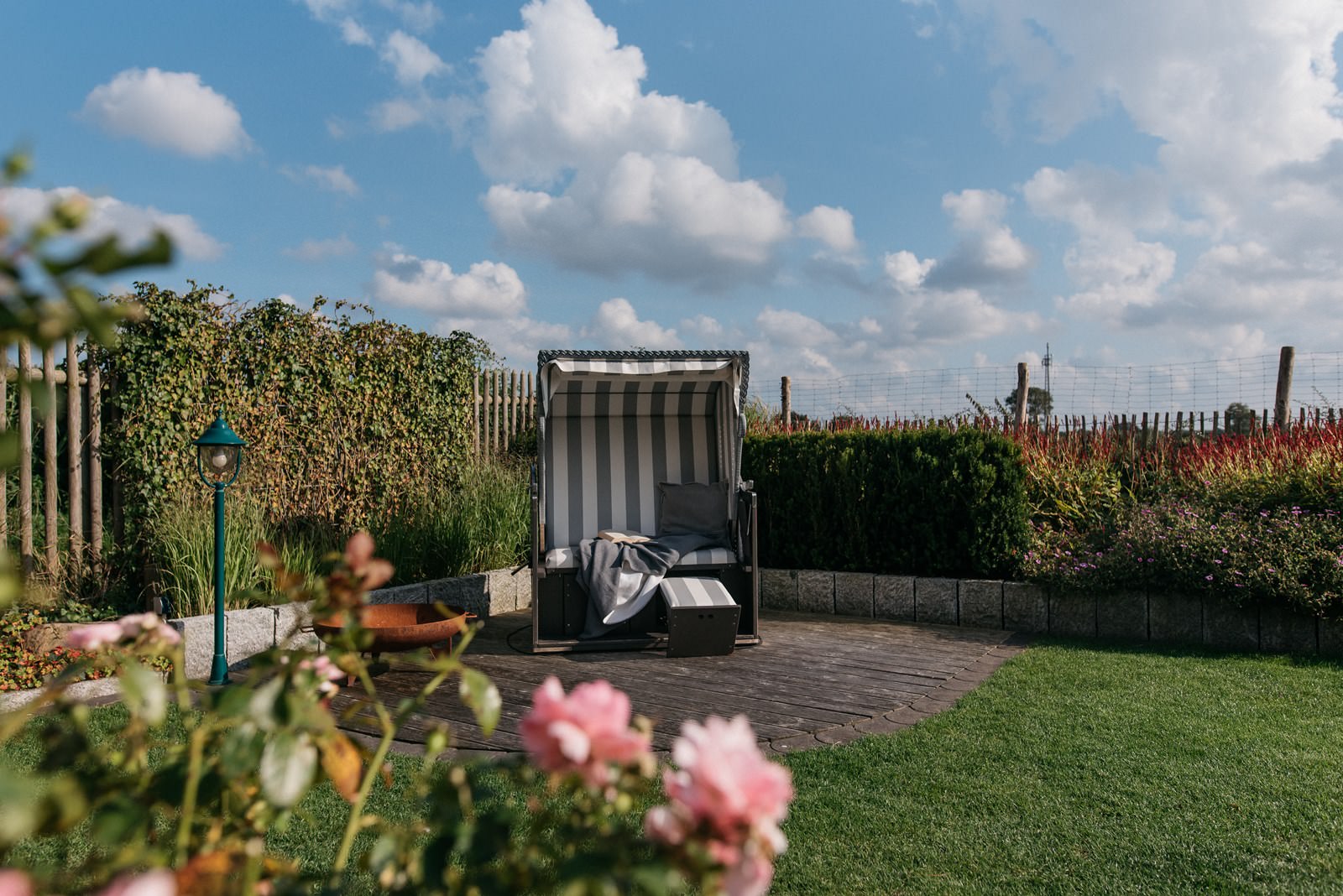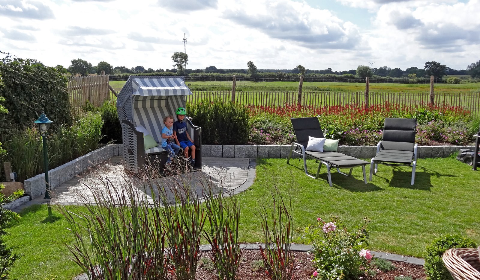 Schöner Garten mit Strandkorb und Gartenliegen.