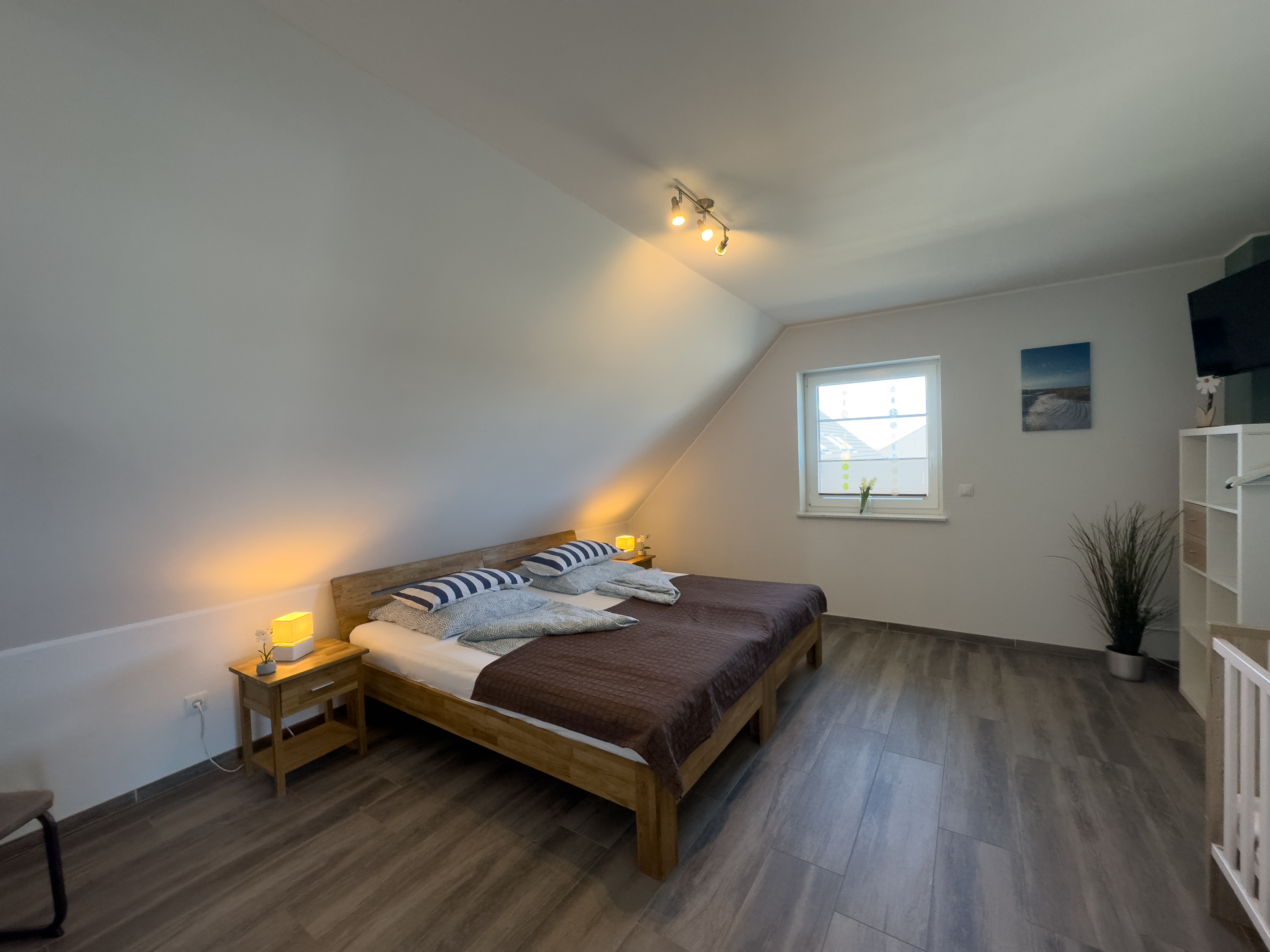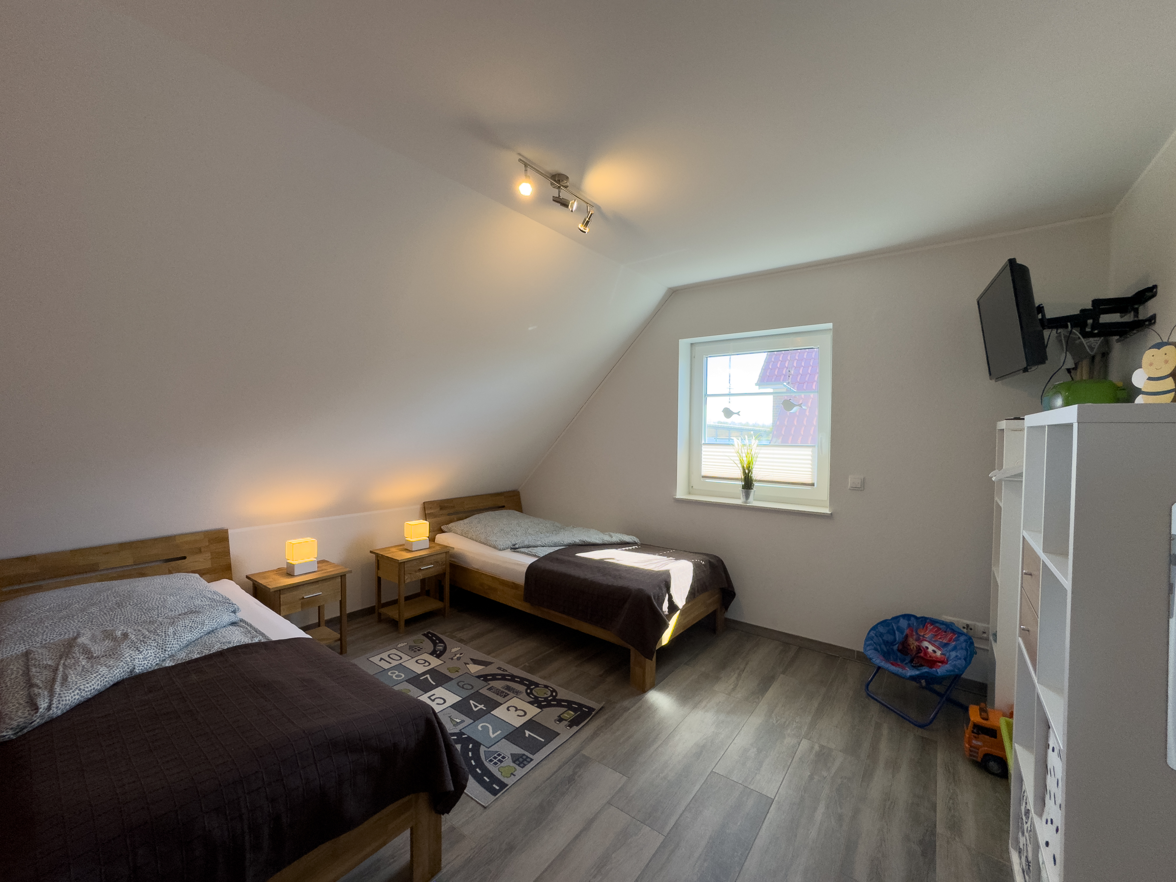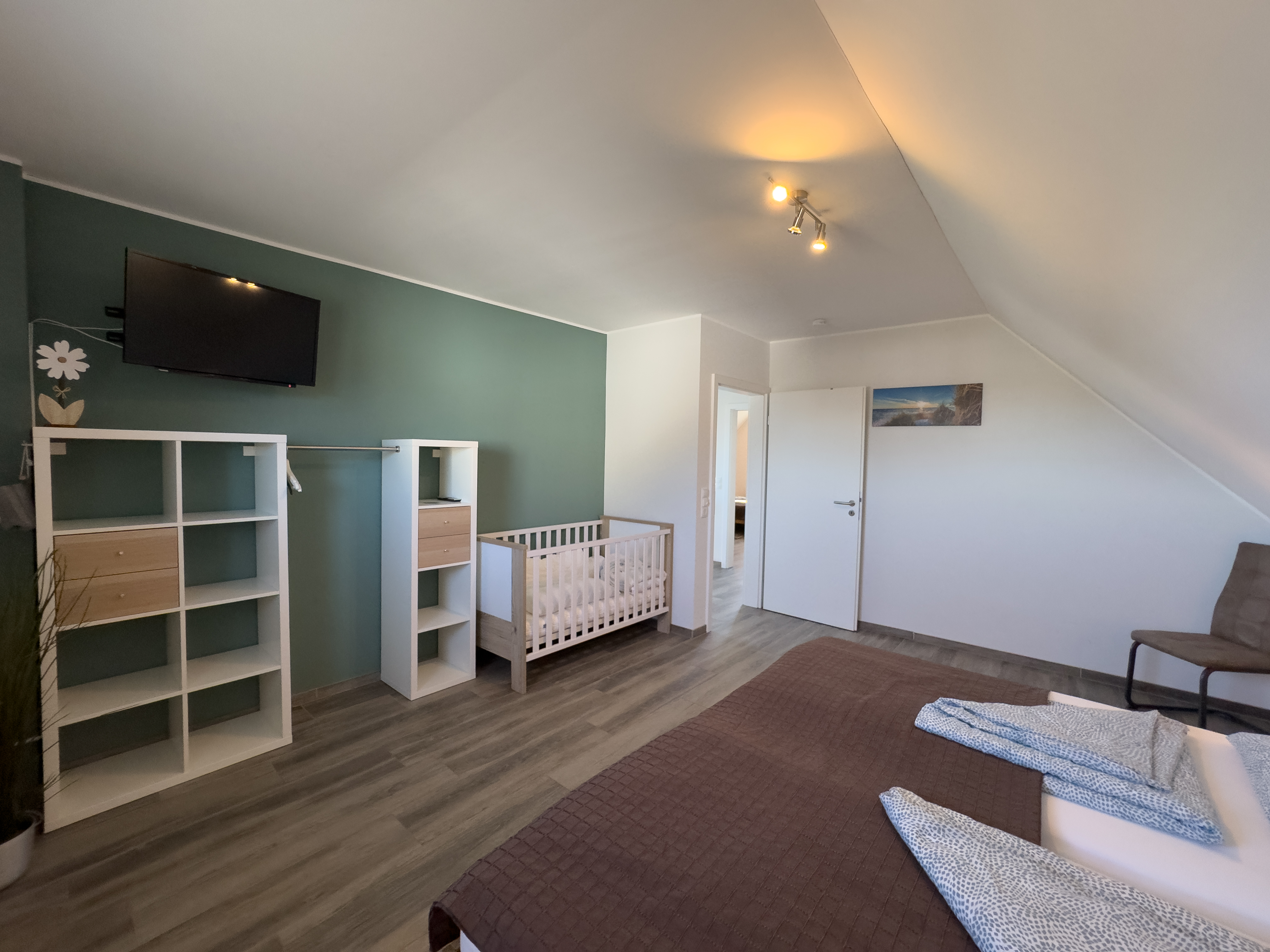 Im Obergeschoss erwartet Sie ein weiteres Schlafzimmer mit Doppelbett und Babybett, ein liebevoll eingerichtetes Kinderzimmer mit zwei Einzelbetten sowie ein großzügiges Badezimmer mit Dusche und Badewanne – perfekt für Familien mit Kindern oder befreundete Paare.