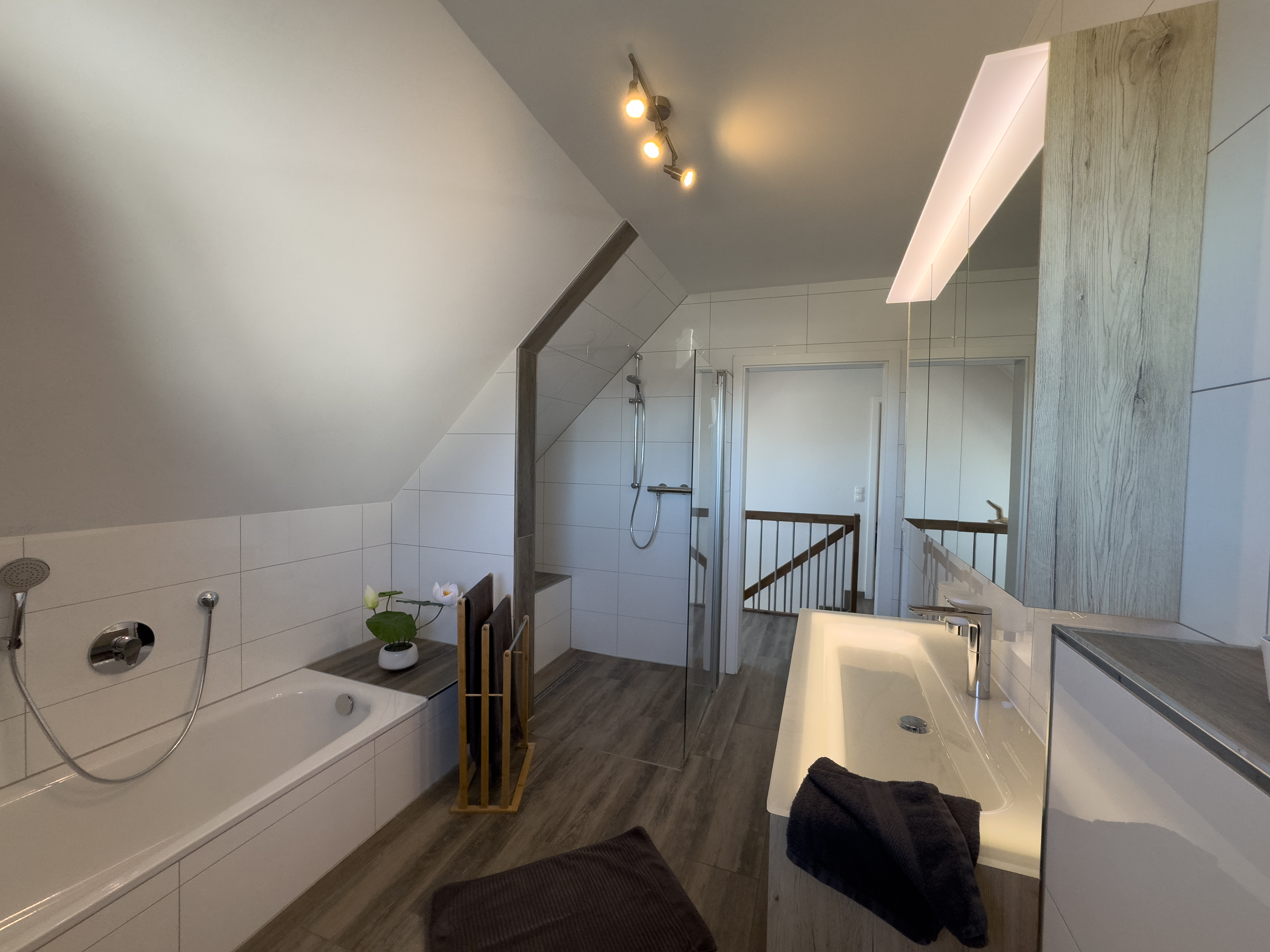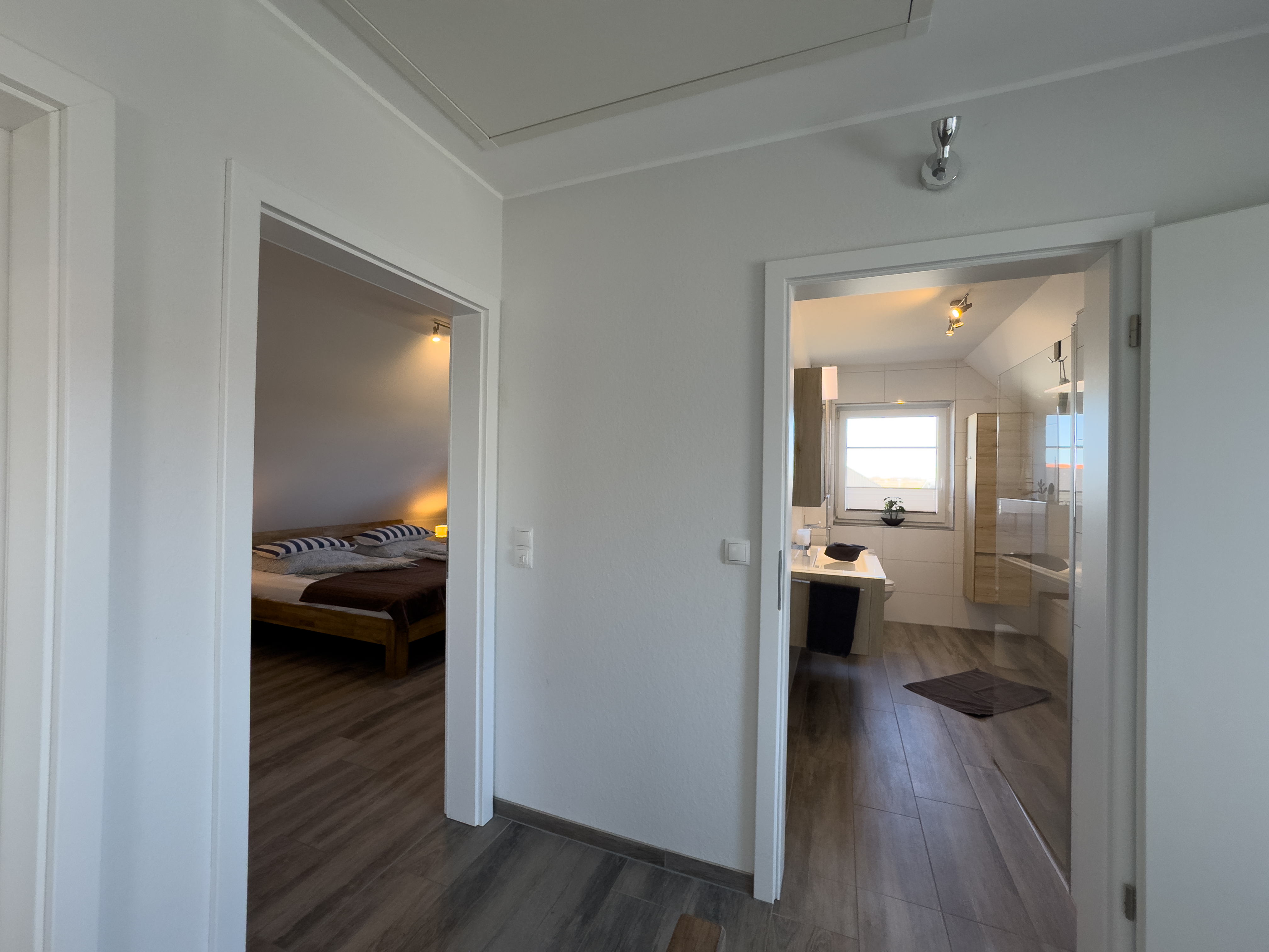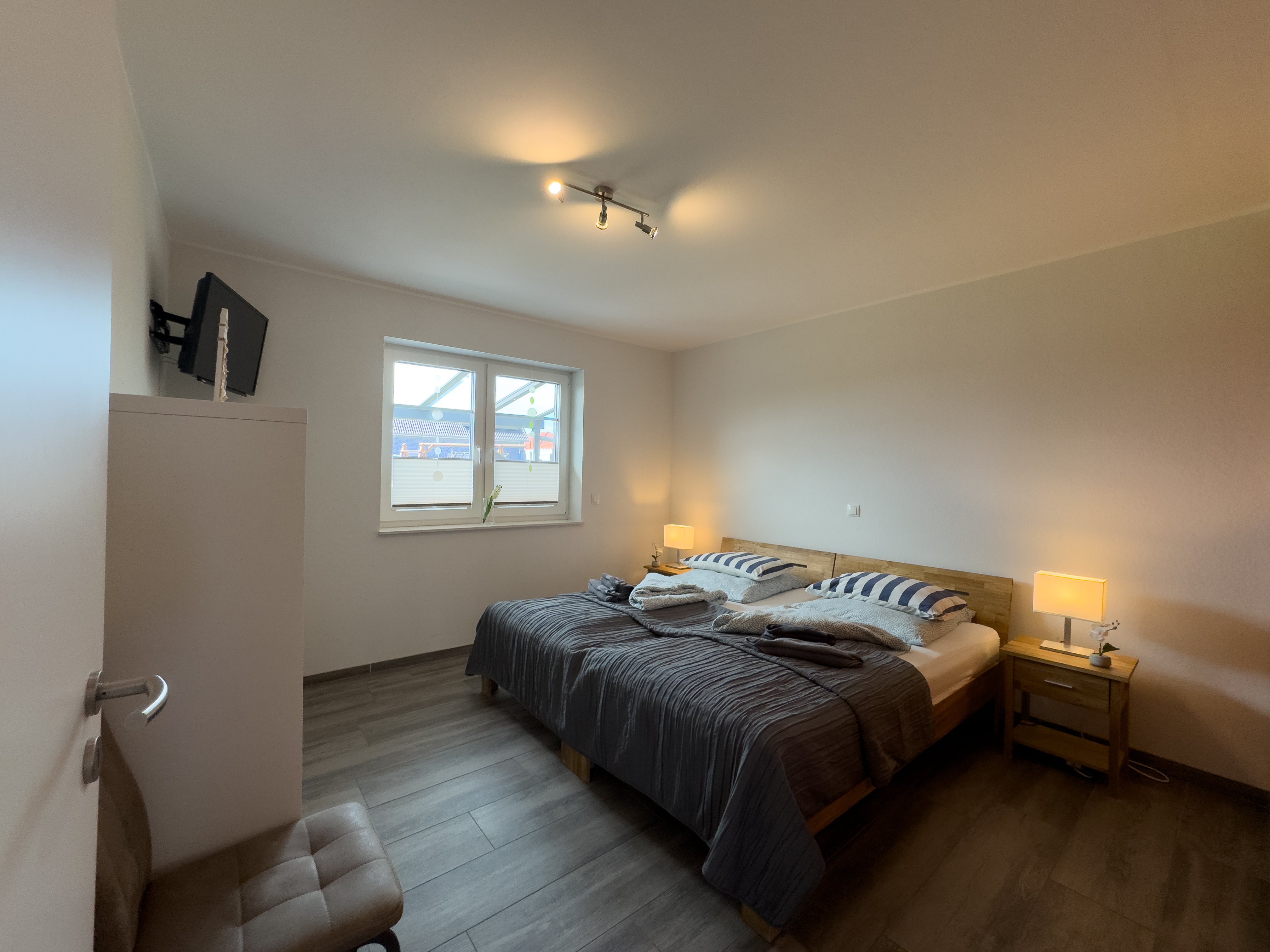 Im Obergeschoss erwartet Sie ein weiteres Schlafzimmer mit Doppelbett und Babybett, ein liebevoll eingerichtetes Kinderzimmer mit zwei Einzelbetten sowie ein großzügiges Badezimmer mit Dusche und Badewanne – perfekt für Familien mit Kindern oder befreundete Paare.
