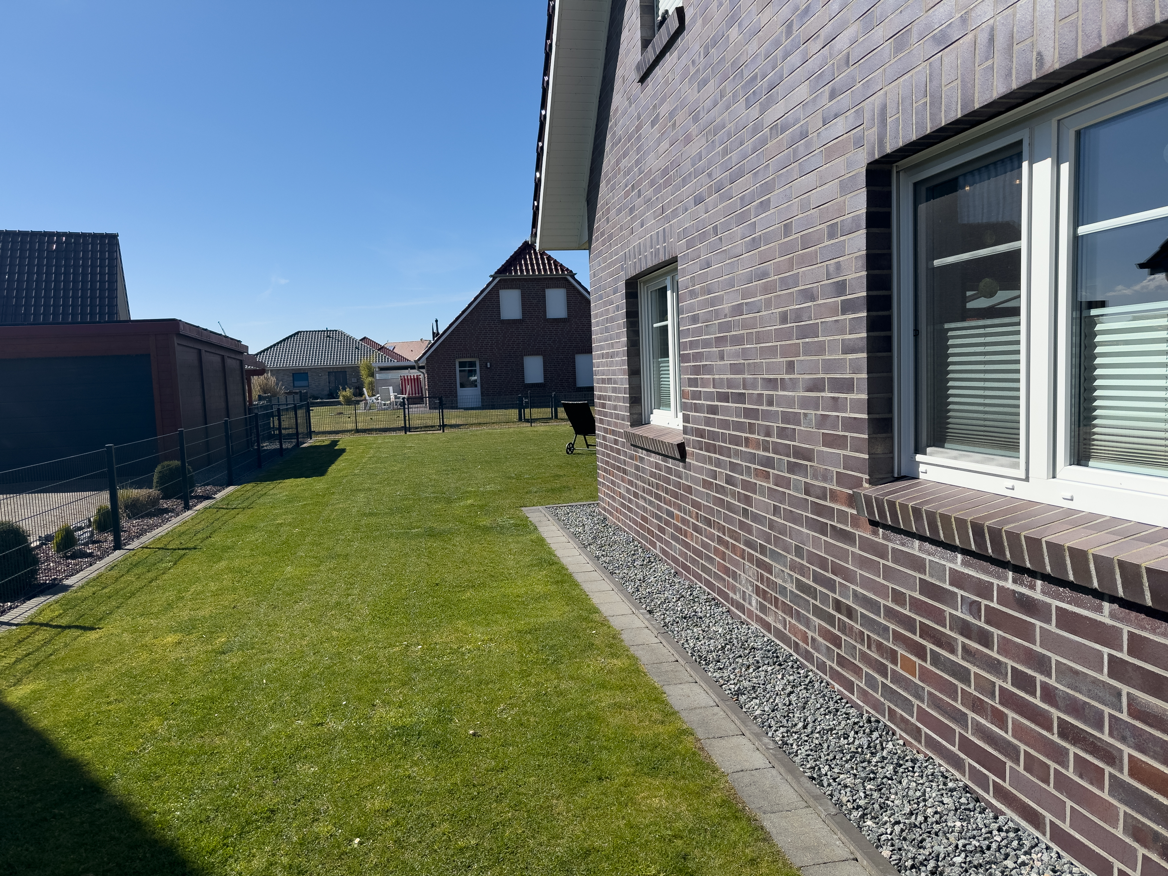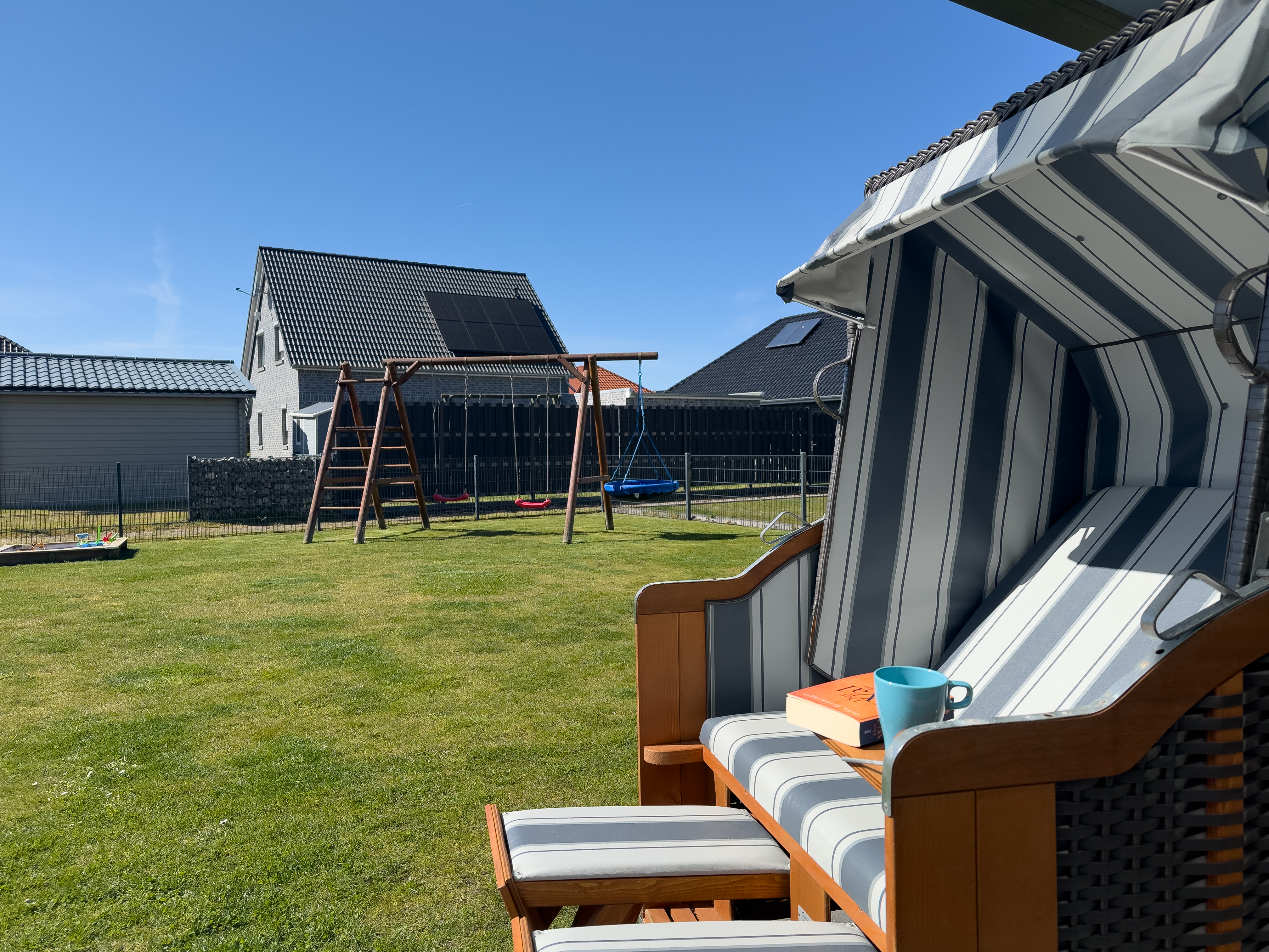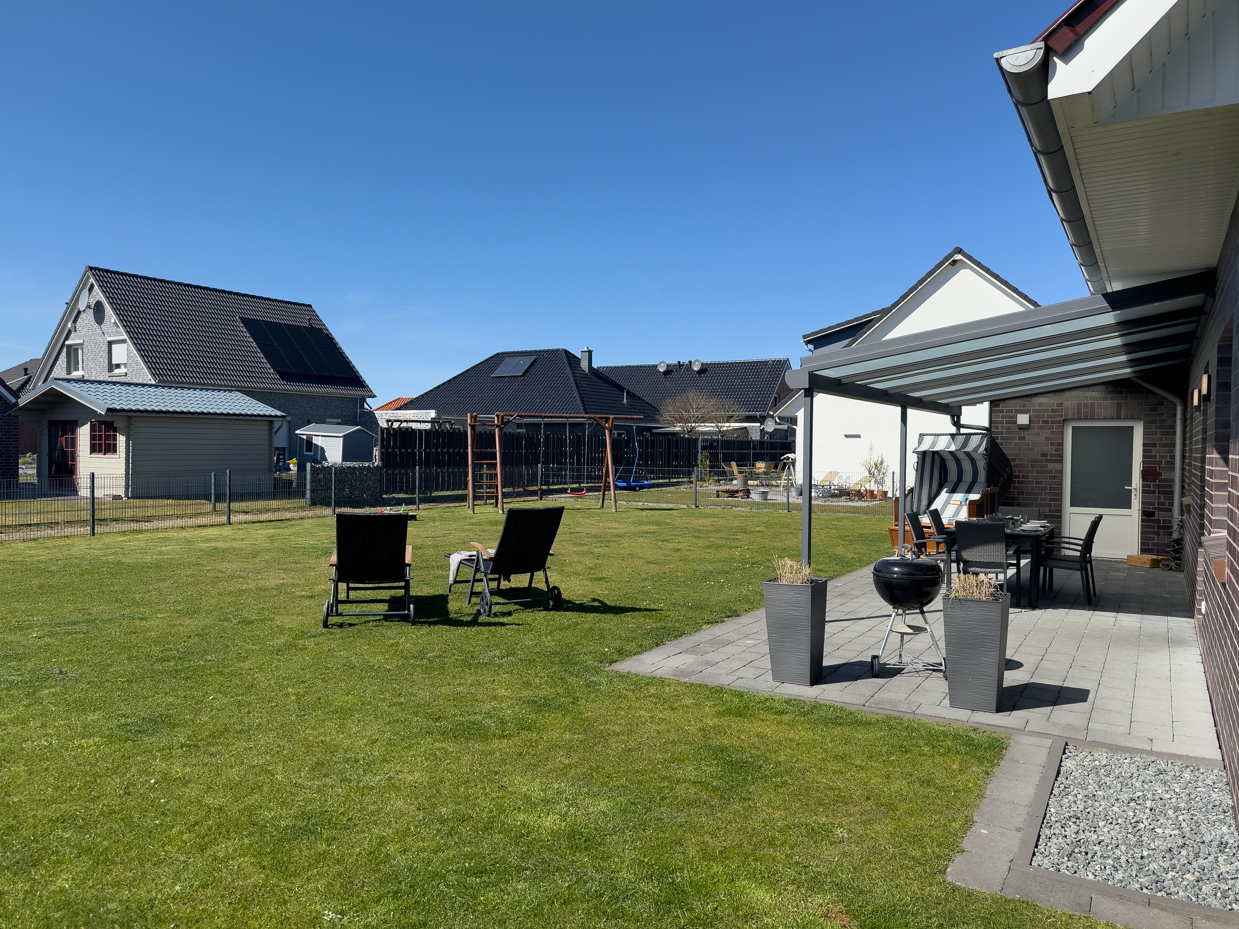 Der große Garten ist komplett eingezäunt und bietet mit einer überdachten Terrasse, Sonnenliegen und einem Grill die besten Voraussetzungen für entspannte Stunden im Freien. Kinder freuen sich über den Sandkasten und die Schaukel, während Hunde sicher toben und sich frei bewegen können.