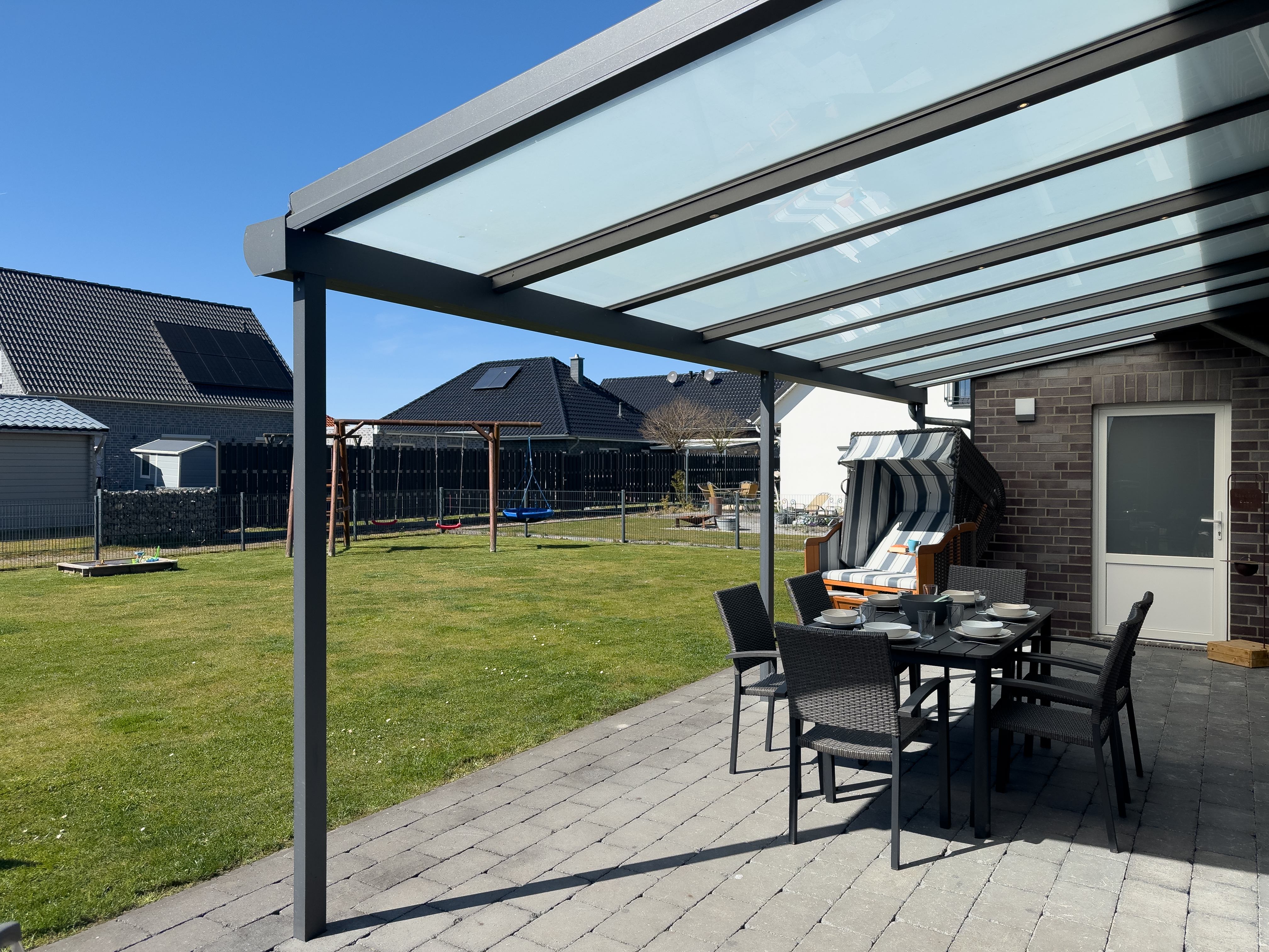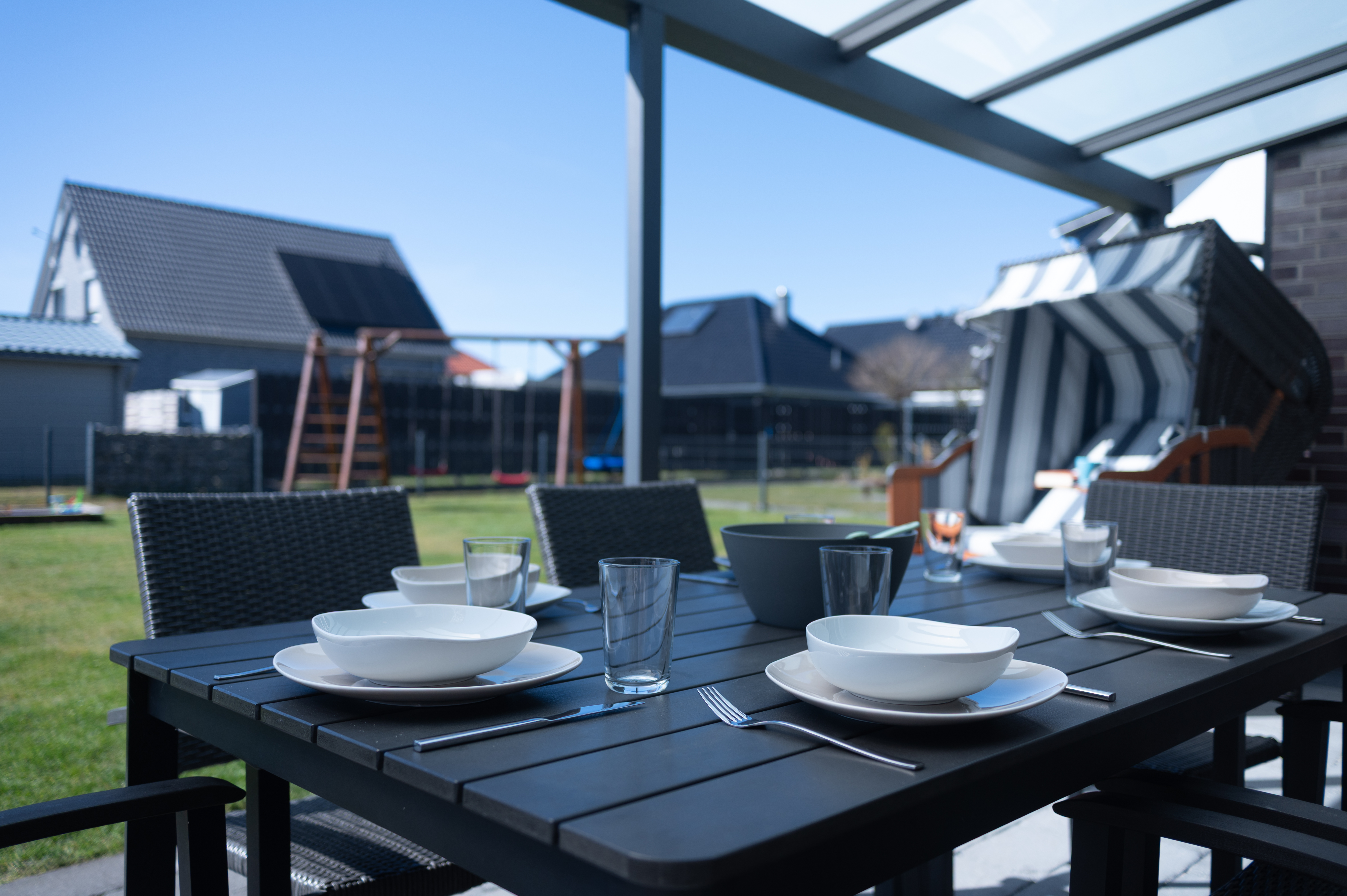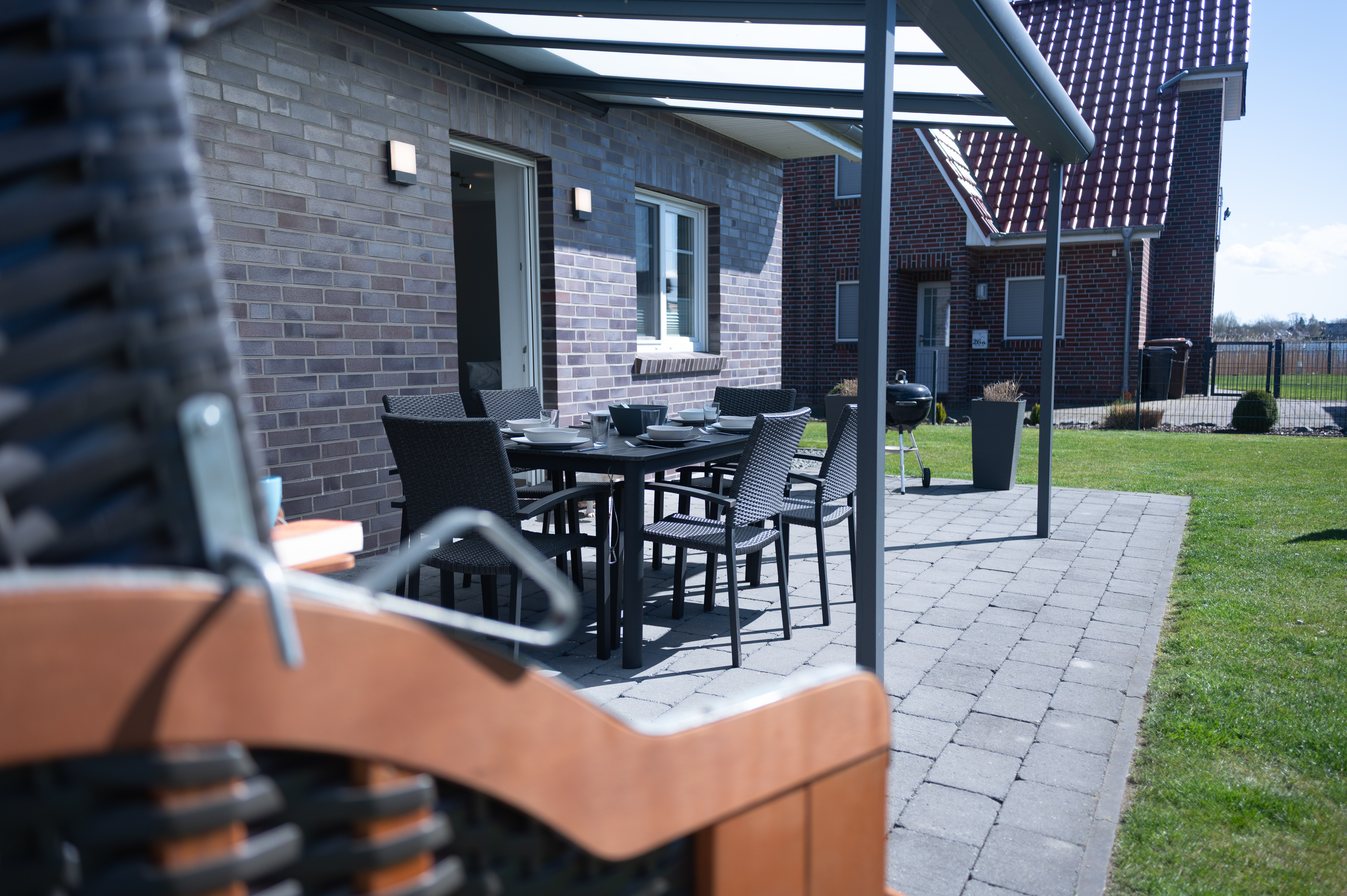 Der große Garten ist komplett eingezäunt und bietet mit einer überdachten Terrasse, Sonnenliegen und einem Grill die besten Voraussetzungen für entspannte Stunden im Freien. Kinder freuen sich über den Sandkasten und die Schaukel, während Hunde sicher toben und sich frei bewegen können.