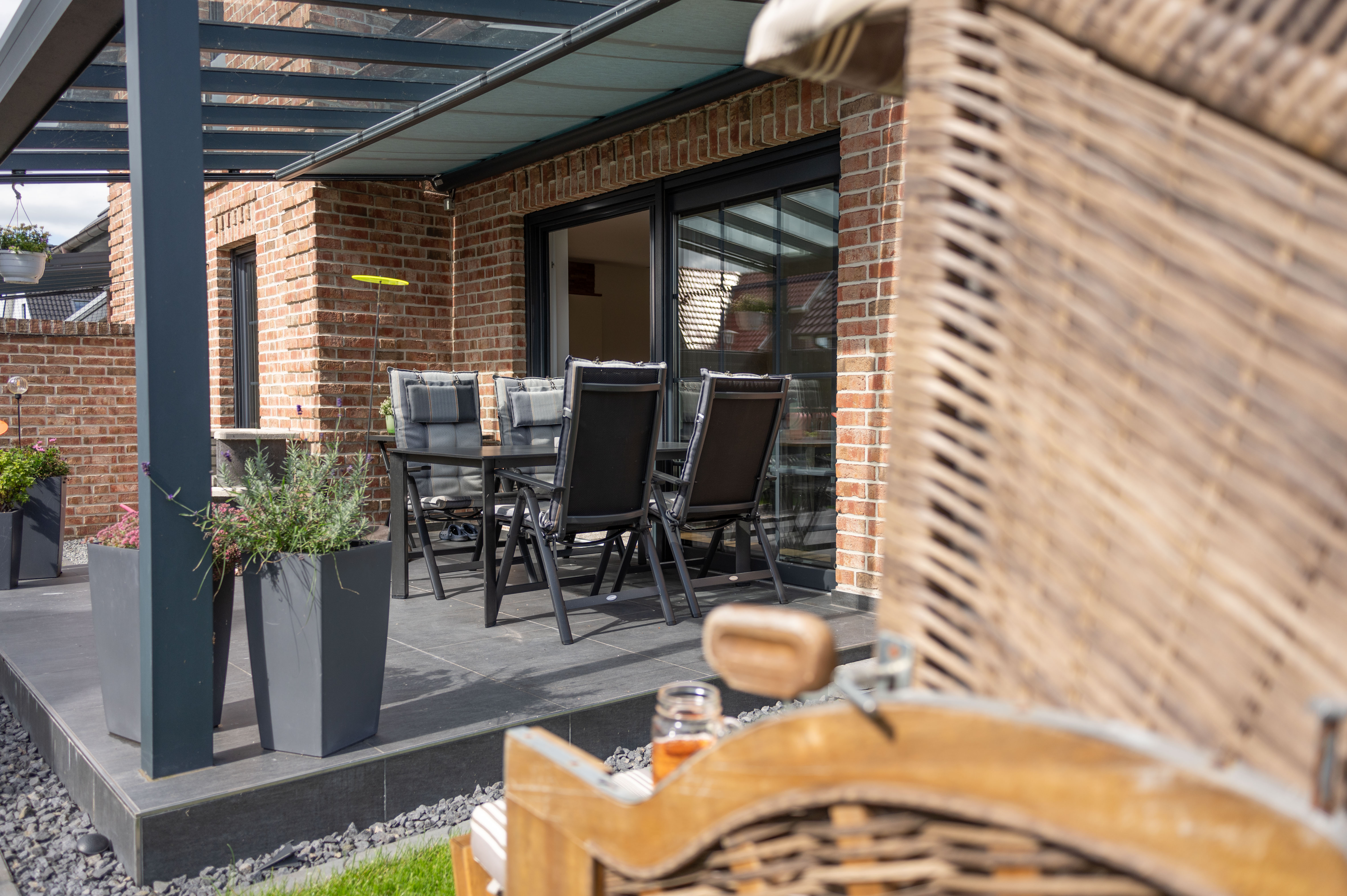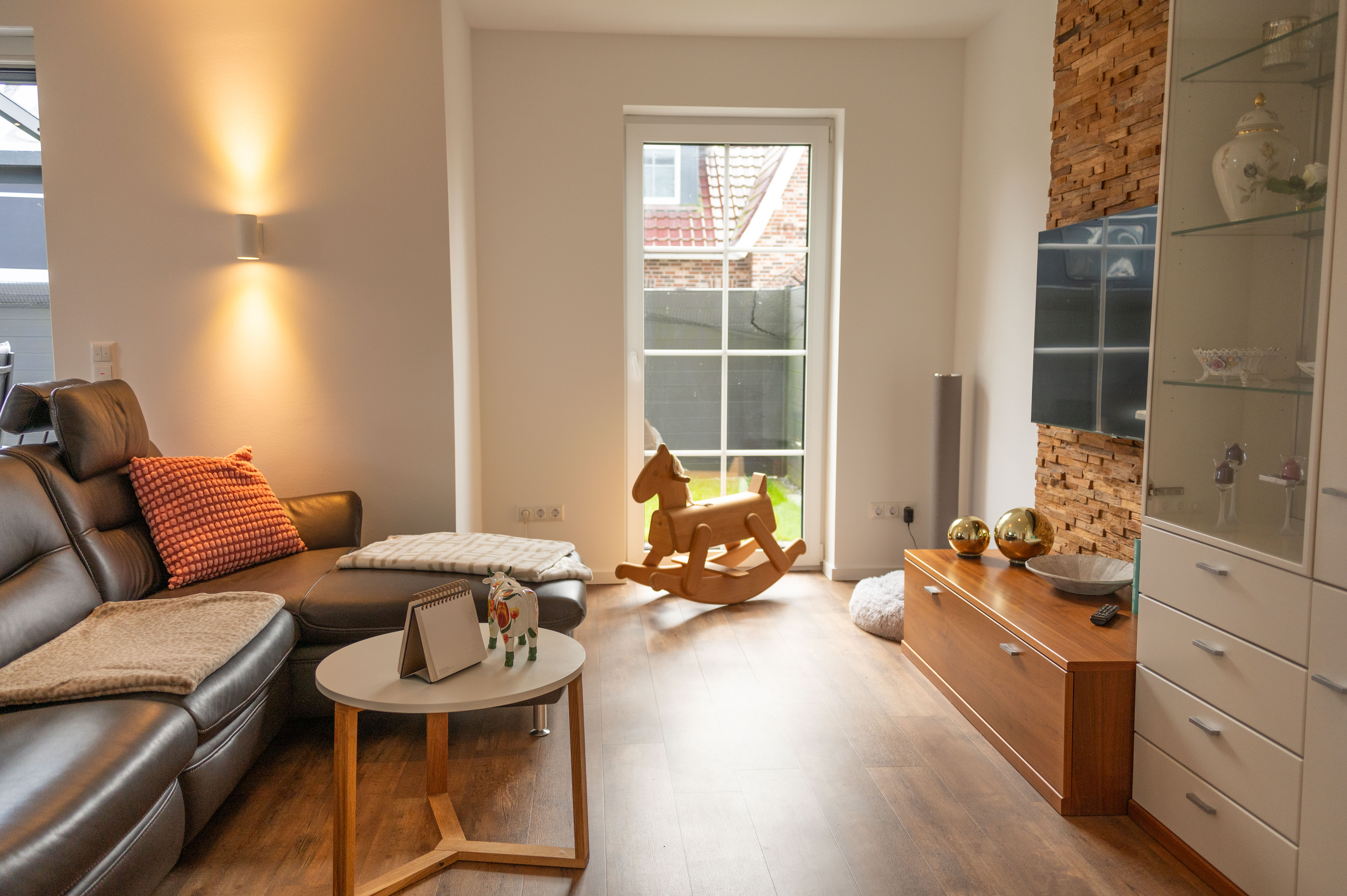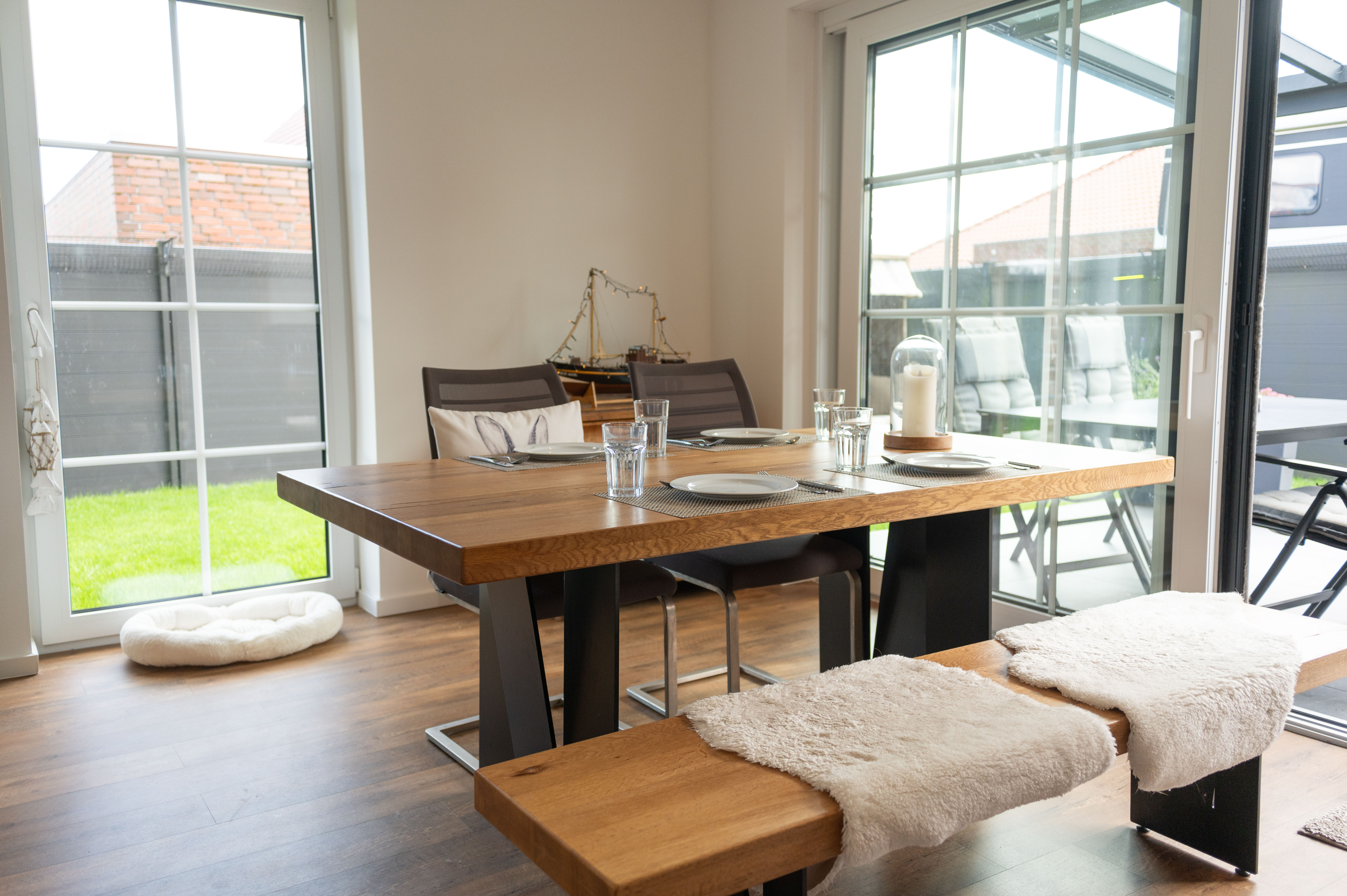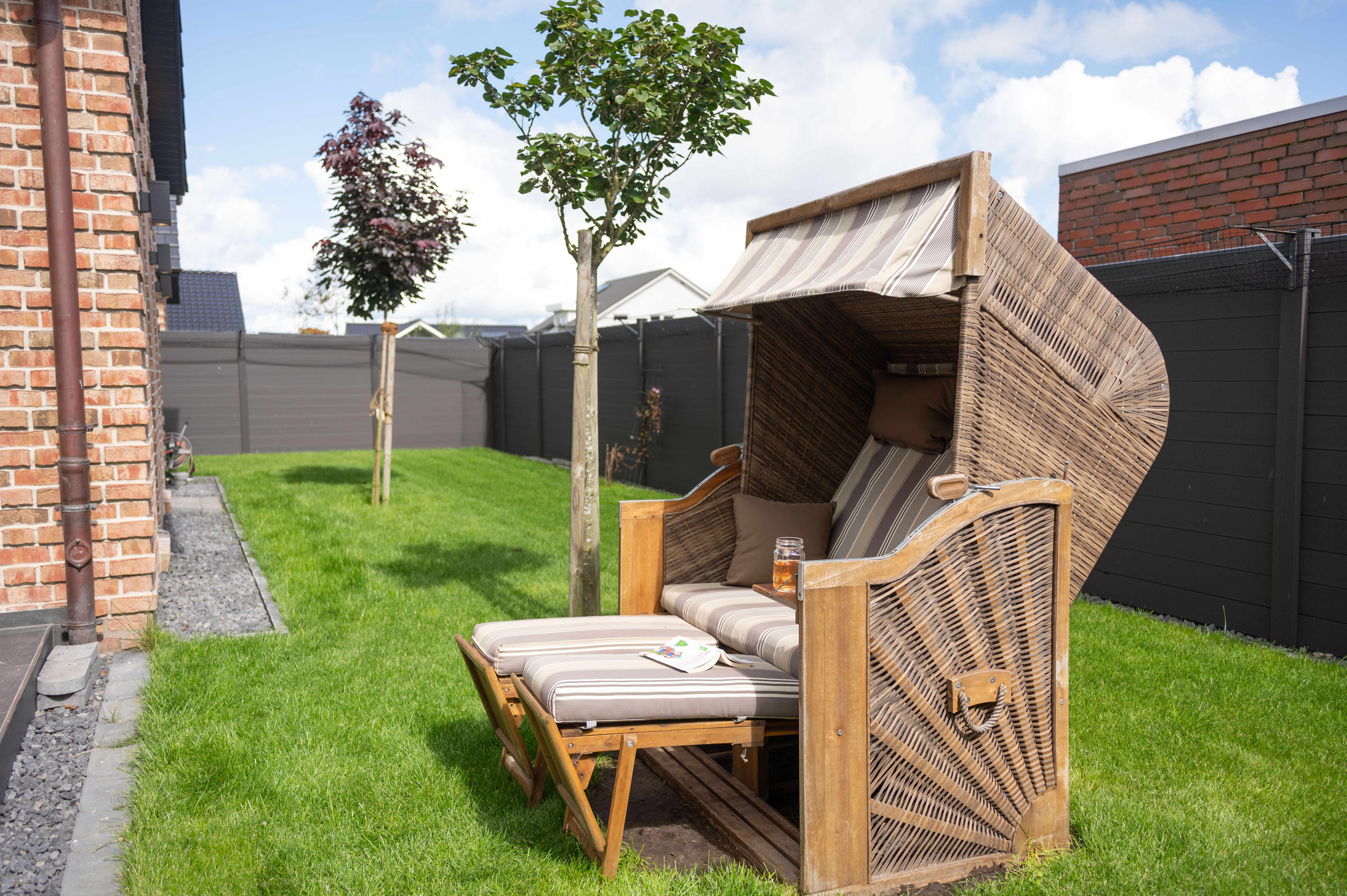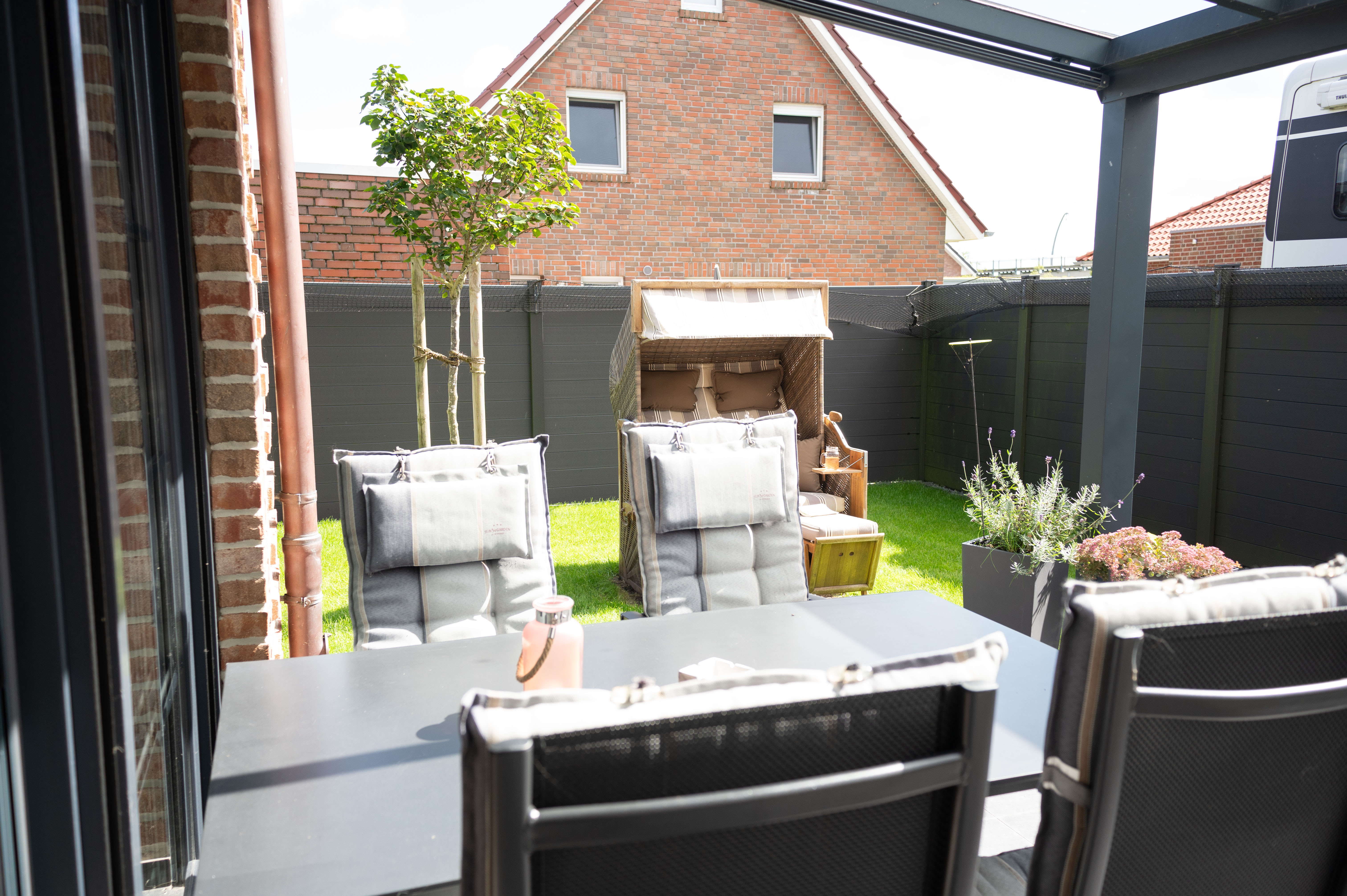 Der lichtdurchflutete Wohn- und Essbereich bildet das Herzstück des Hauses. Eine bequeme Sofaecke, ein großzügiger Esstisch und die voll ausgestattete, moderne Küche laden zum Verweilen und Genießen ein. Vom Wohnbereich aus gelangen Sie direkt in den eingezäunten Garten – perfekt für Familien mit Kindern oder Hund. Dort erwartet Sie eine überdachte Terrasse mit Glasdach sowie ein gemütlicher Strandkorb – ideal zum Entspannen, Grillen und Genießen sonniger Stunden. Eine elektrische Markise sorgt bei Bedarf für angenehmen Schatten.