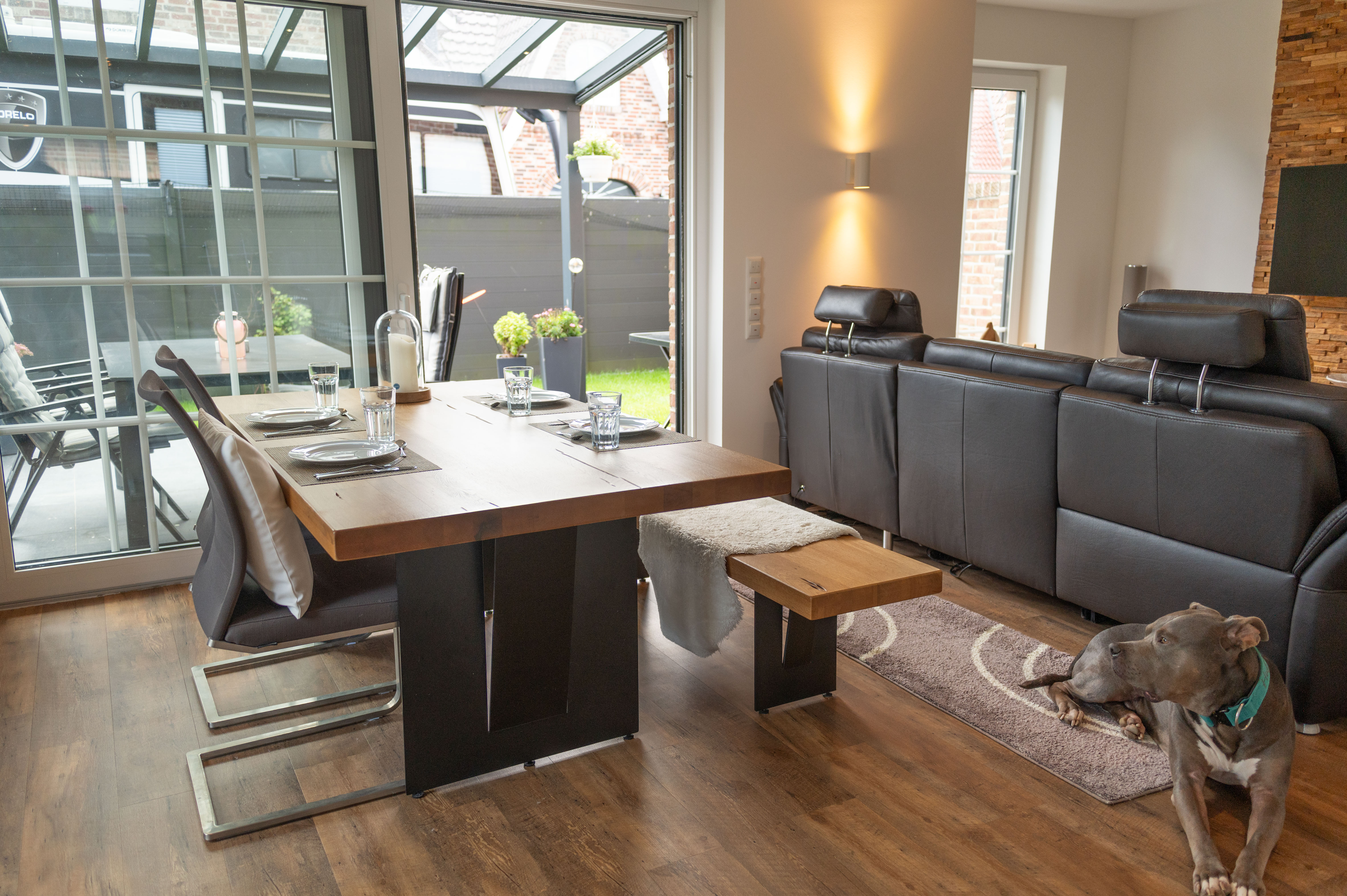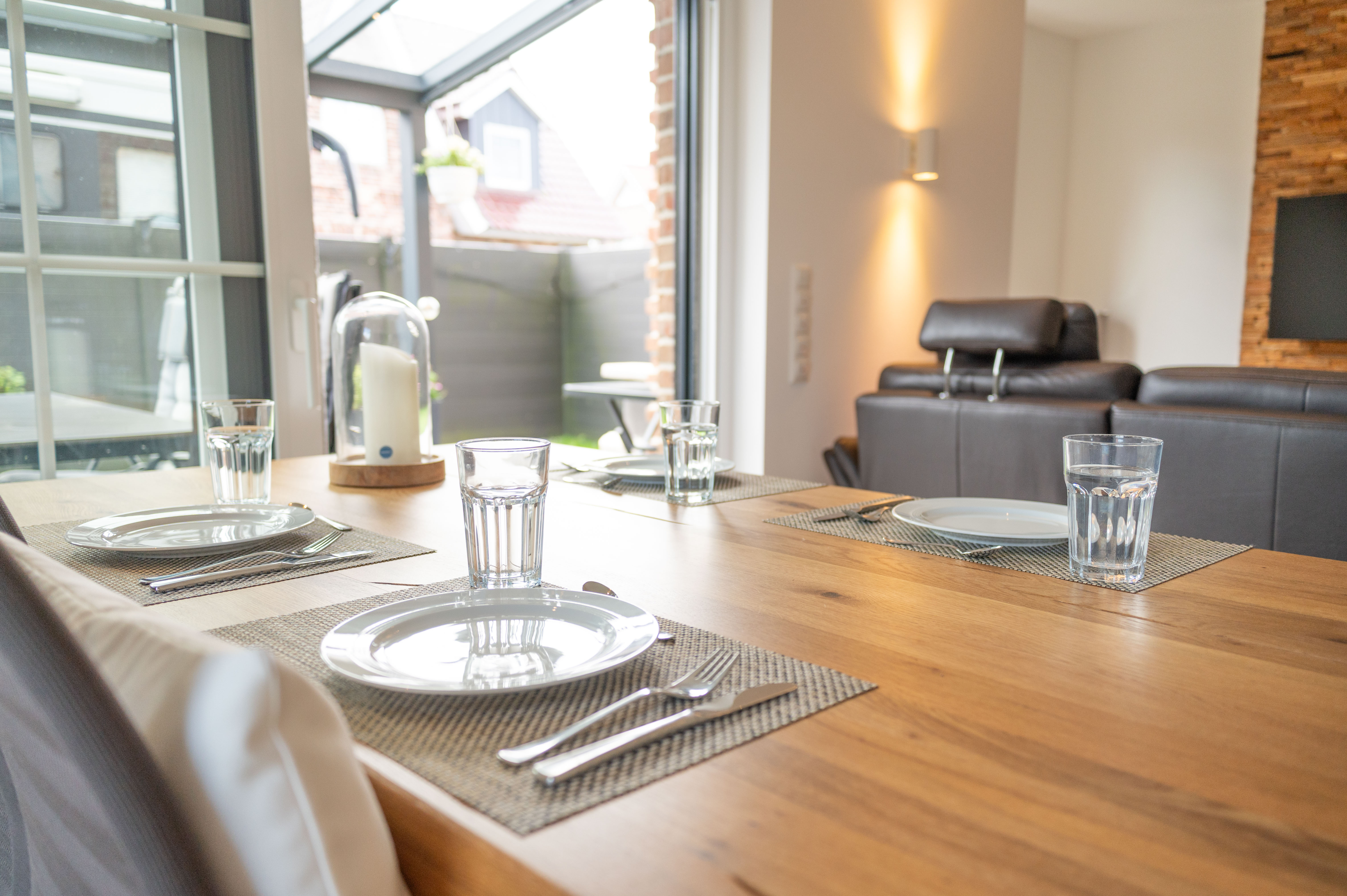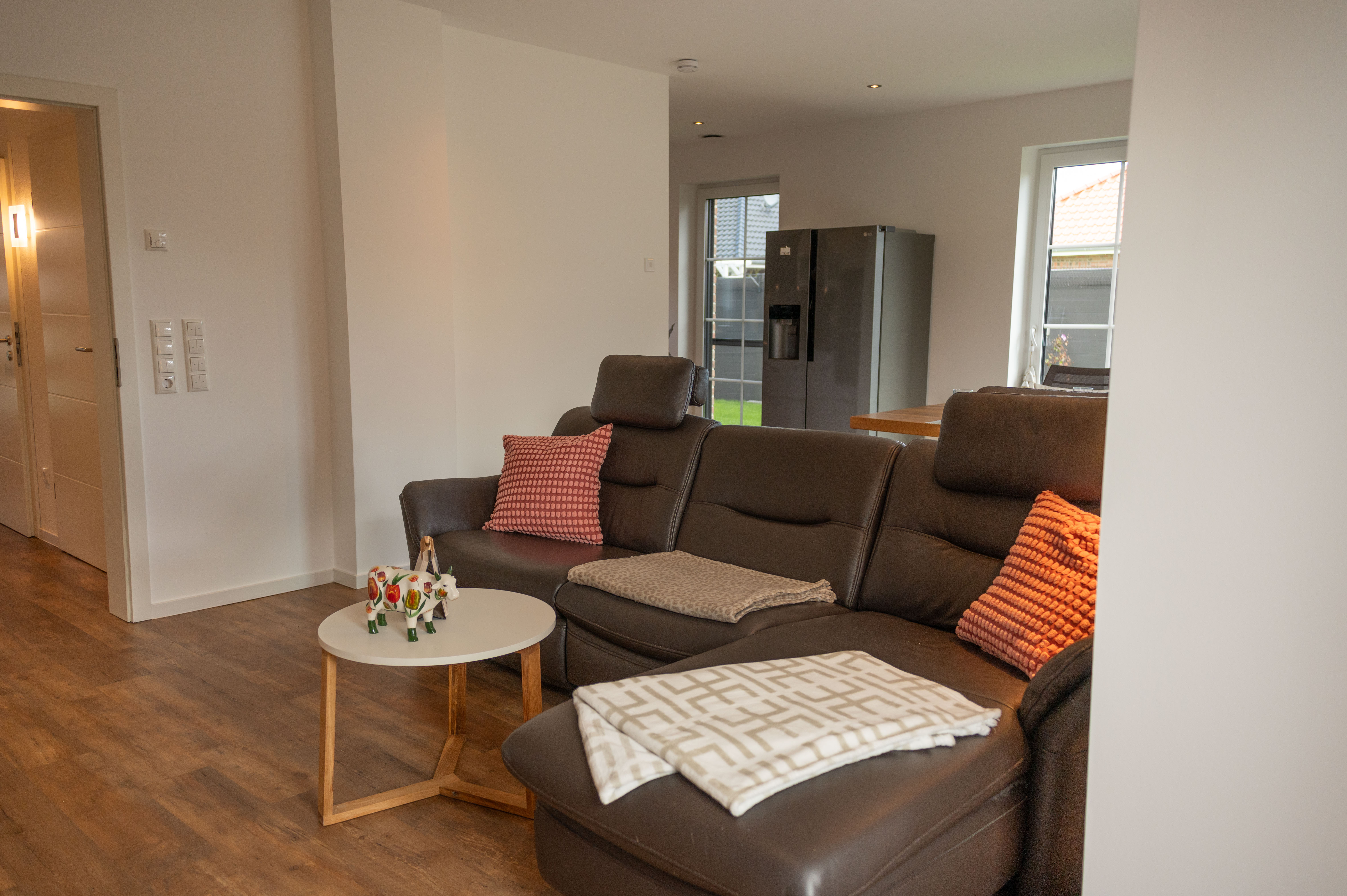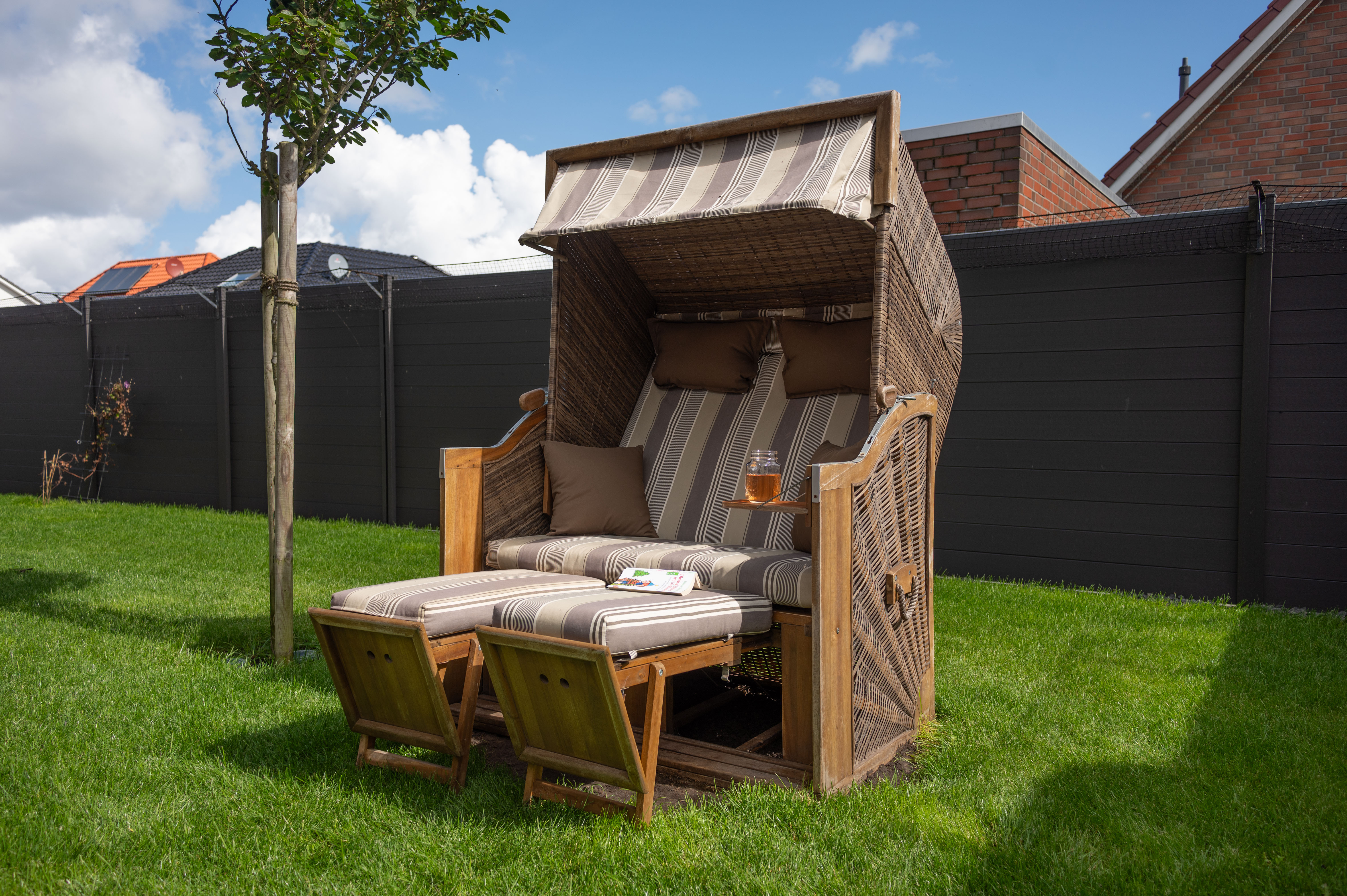 Der lichtdurchflutete Wohn- und Essbereich bildet das Herzstück des Hauses. Eine bequeme Sofaecke, ein großzügiger Esstisch und die voll ausgestattete, moderne Küche laden zum Verweilen und Genießen ein. Vom Wohnbereich aus gelangen Sie direkt in den eingezäunten Garten – perfekt für Familien mit Kindern oder Hund. Dort erwartet Sie eine überdachte Terrasse mit Glasdach sowie ein gemütlicher Strandkorb – ideal zum Entspannen, Grillen und Genießen sonniger Stunden. Eine elektrische Markise sorgt bei Bedarf für angenehmen Schatten.