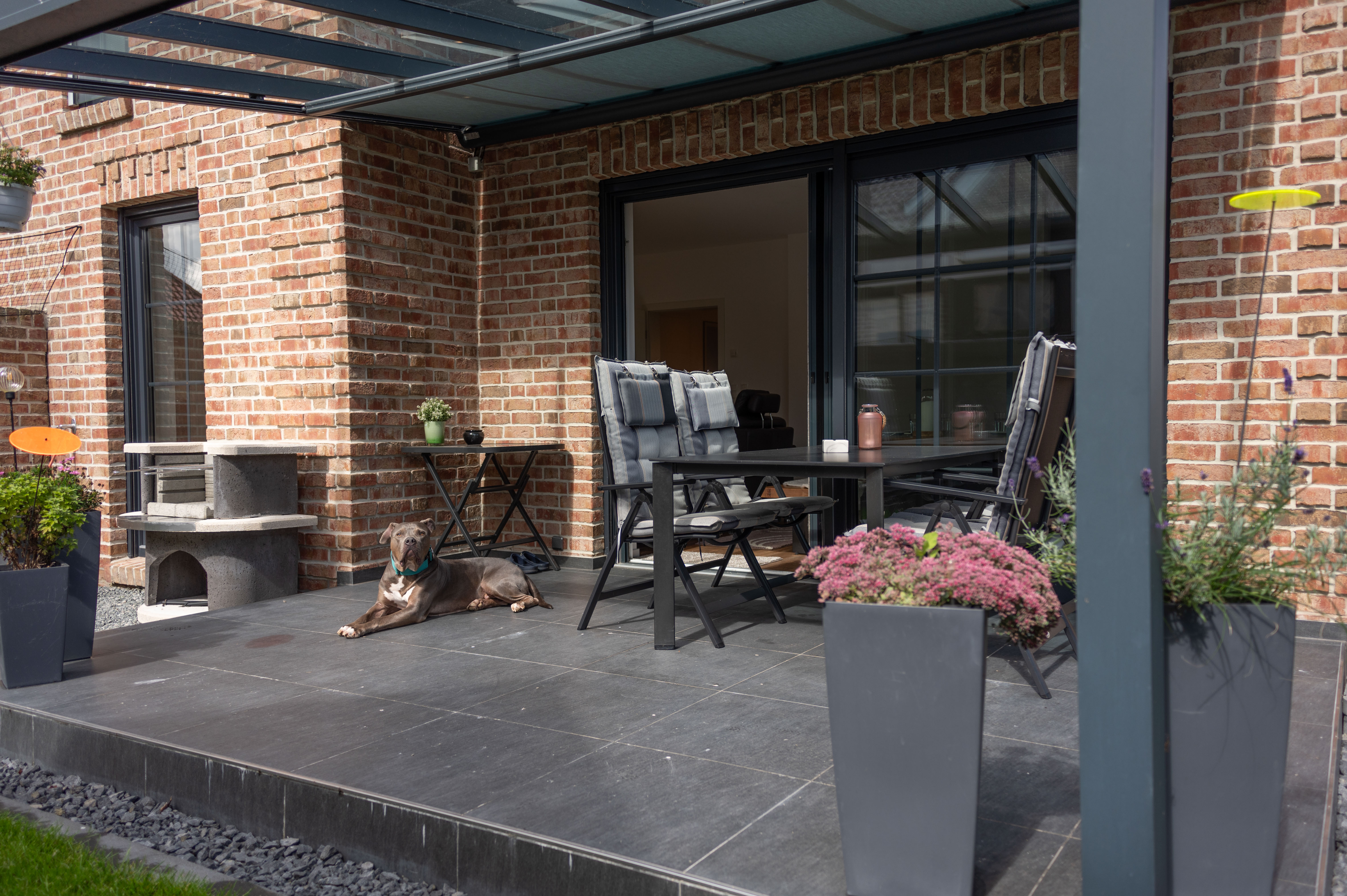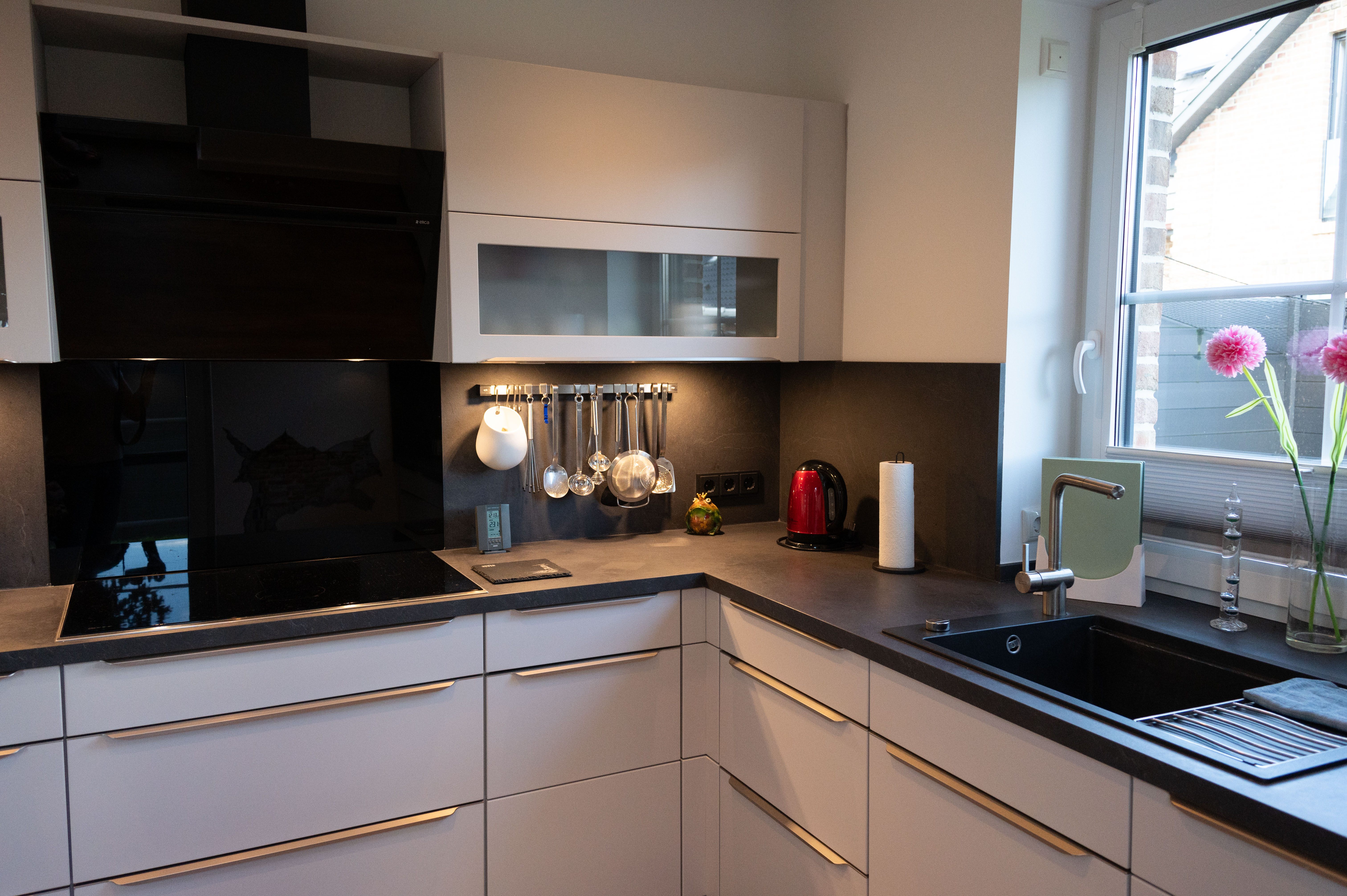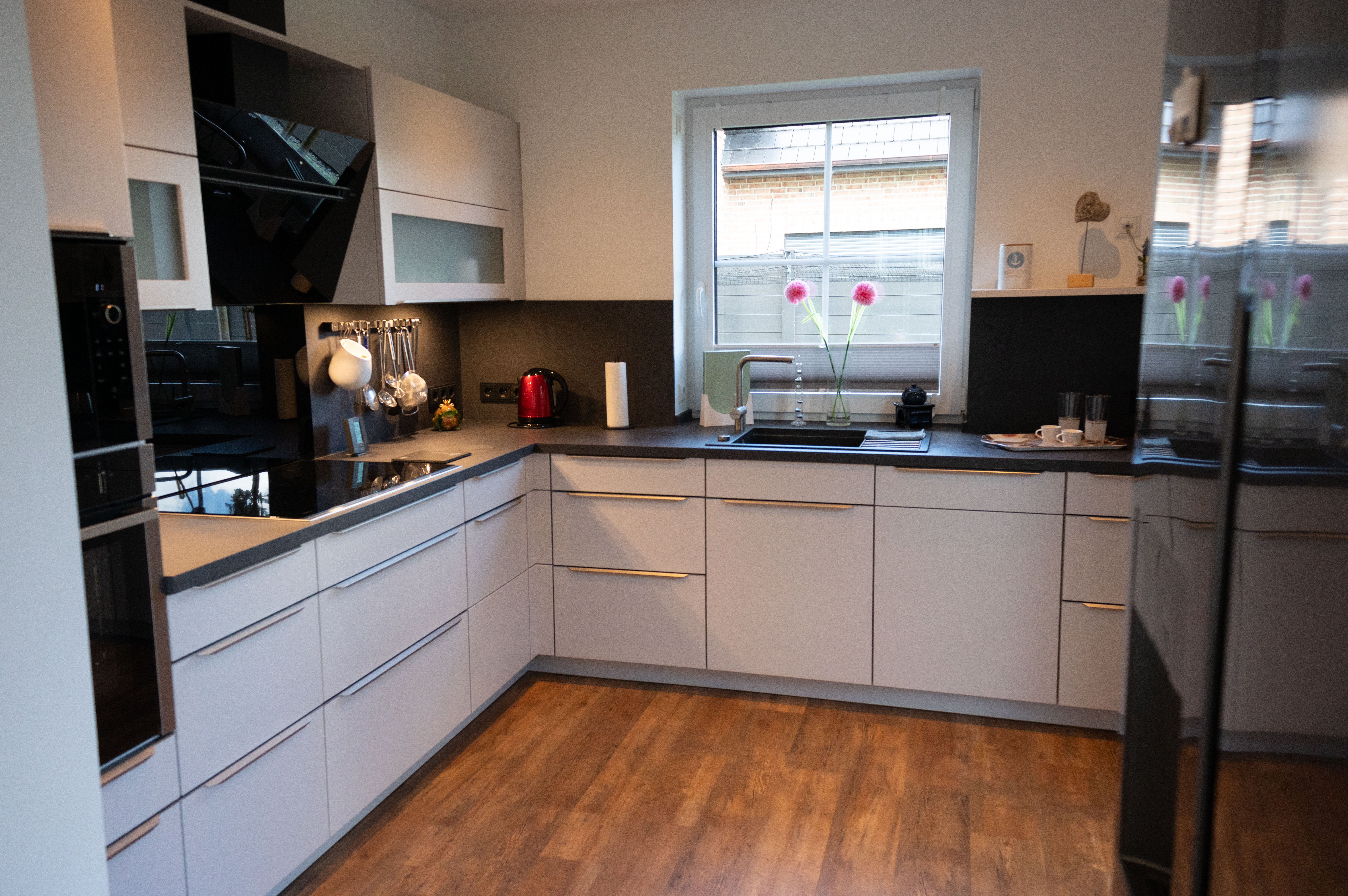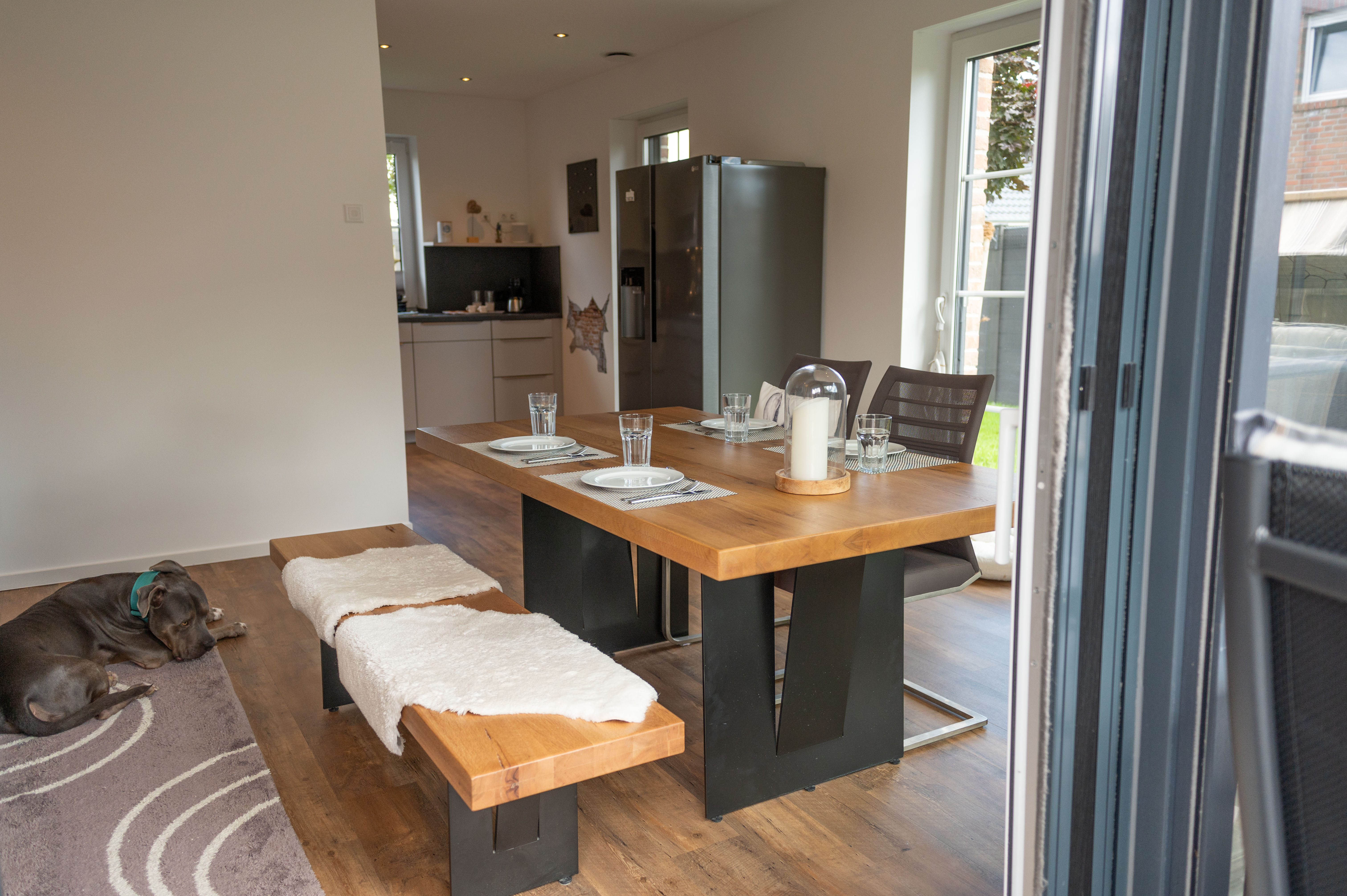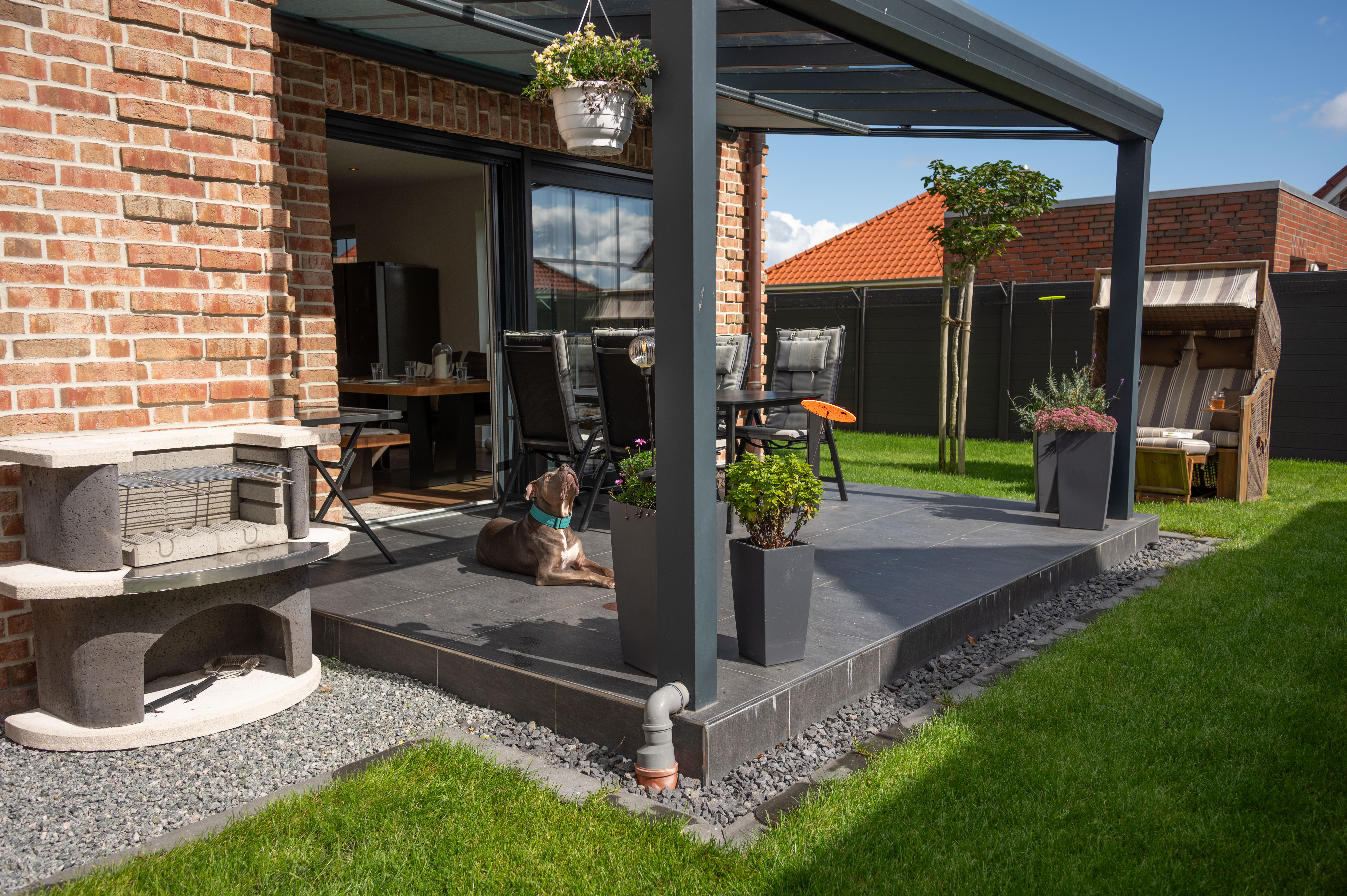 Der lichtdurchflutete Wohn- und Essbereich bildet das Herzstück des Hauses. Eine bequeme Sofaecke, ein großzügiger Esstisch und die voll ausgestattete, moderne Küche laden zum Verweilen und Genießen ein. Vom Wohnbereich aus gelangen Sie direkt in den eingezäunten Garten – perfekt für Familien mit Kindern oder Hund. Dort erwartet Sie eine überdachte Terrasse mit Glasdach sowie ein gemütlicher Strandkorb – ideal zum Entspannen, Grillen und Genießen sonniger Stunden. Eine elektrische Markise sorgt bei Bedarf für angenehmen Schatten.