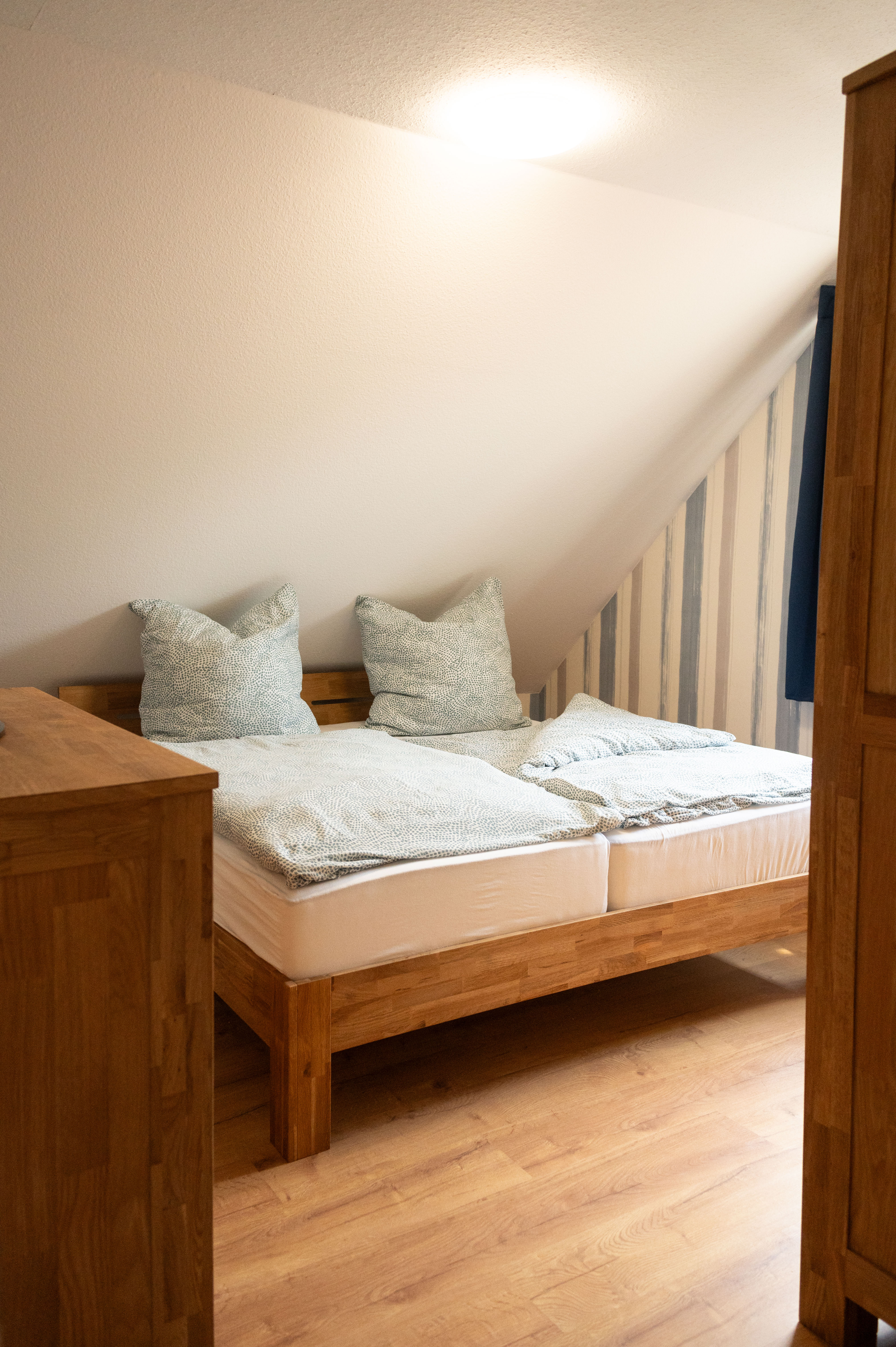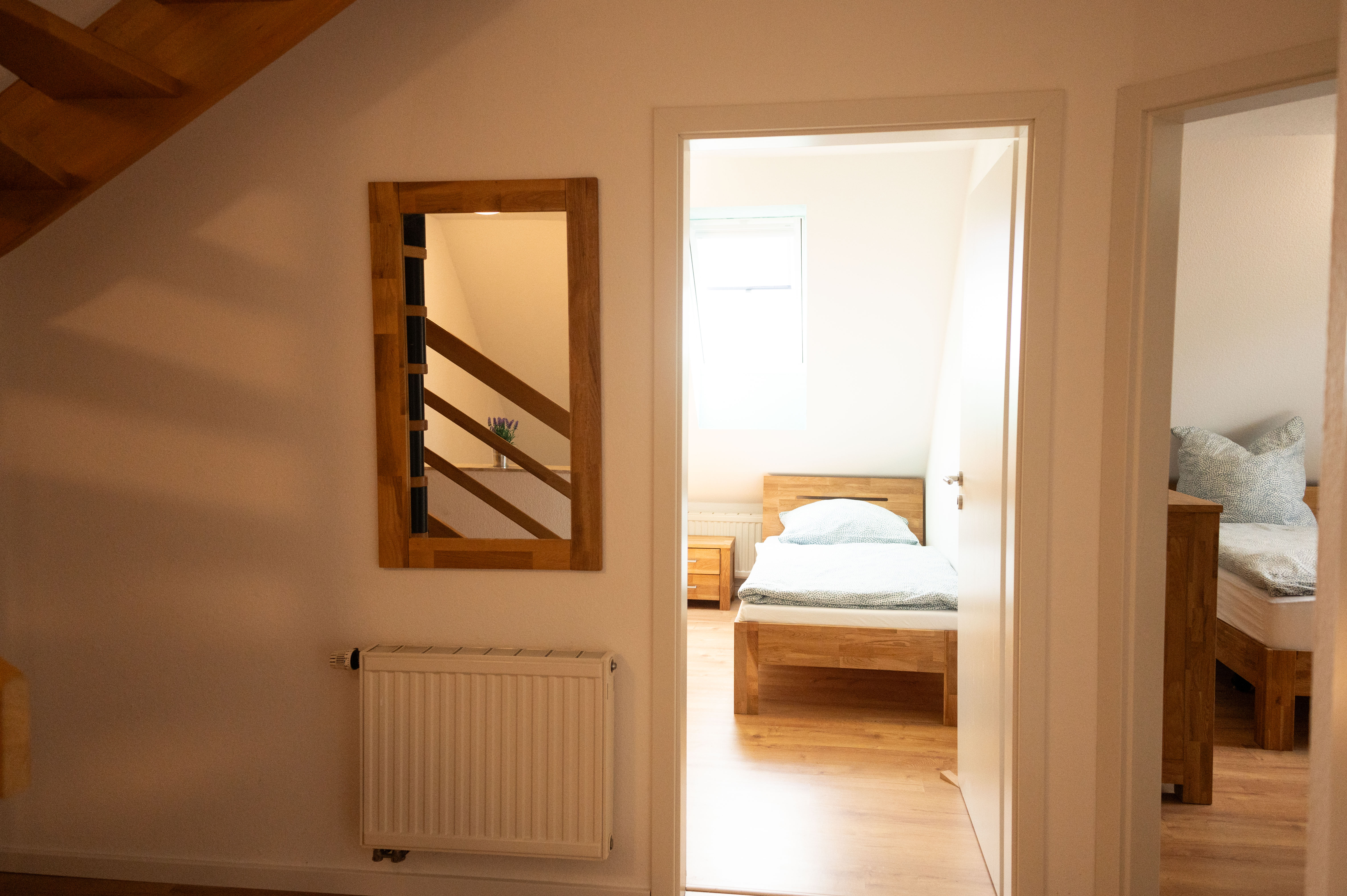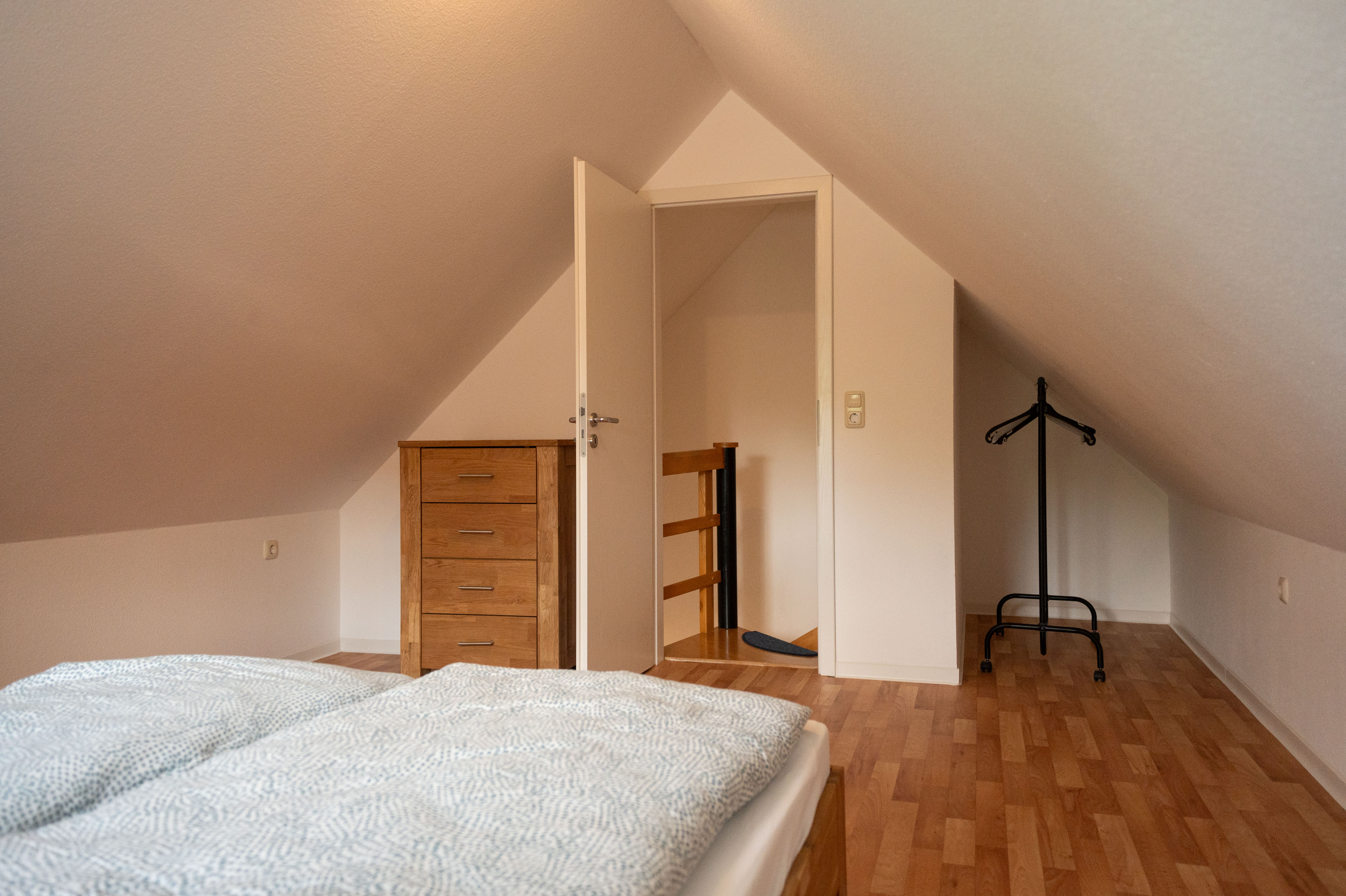 Über eine Wendeltreppe im oberen Flur erreichen Sie den ausgebauten Dachboden, der als viertes Schlafzimmer mit einem gemütlichen Doppelbett und Kommode eingerichtet ist – perfekt für größere Familien oder befreundete Gäste.