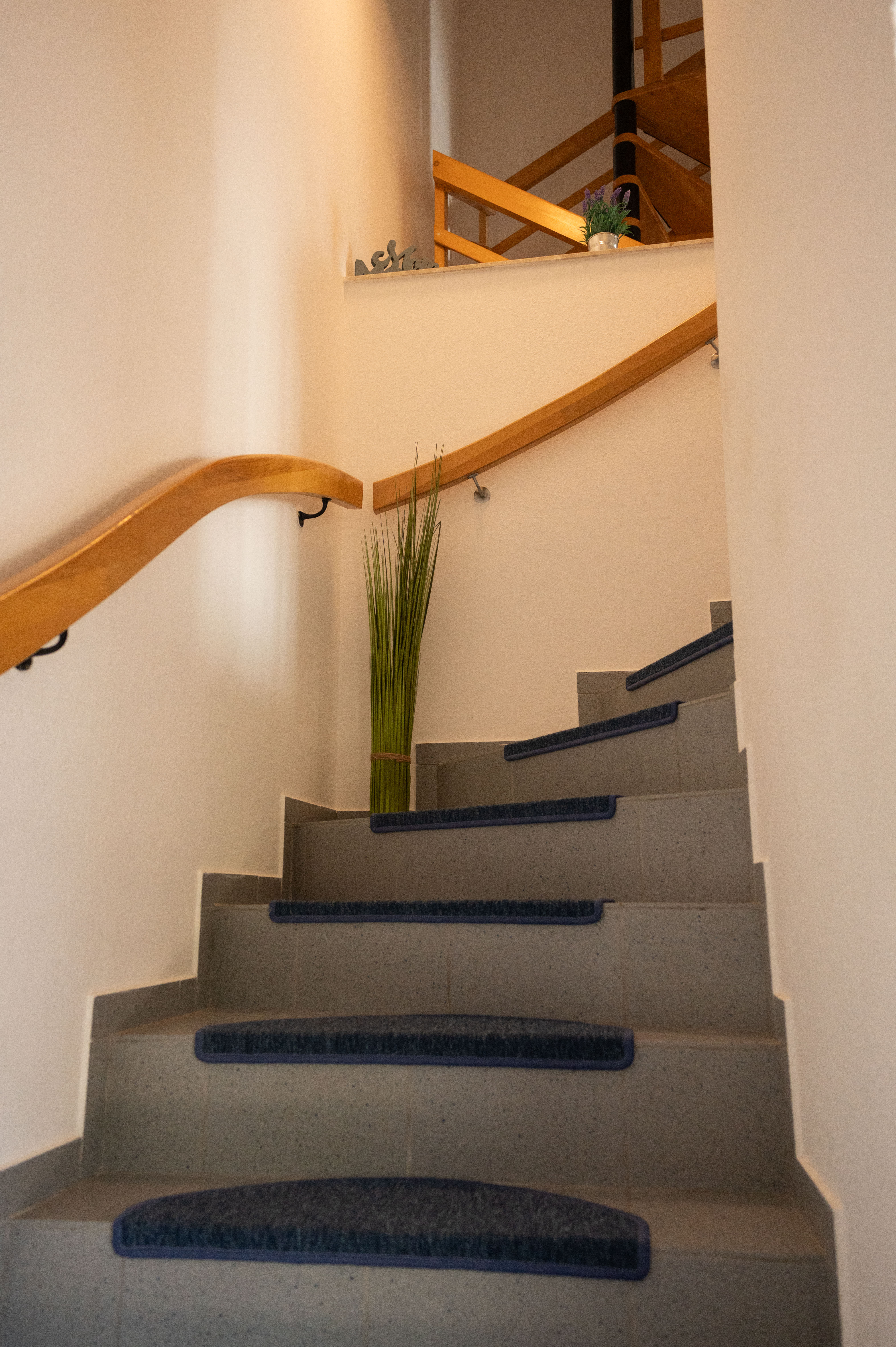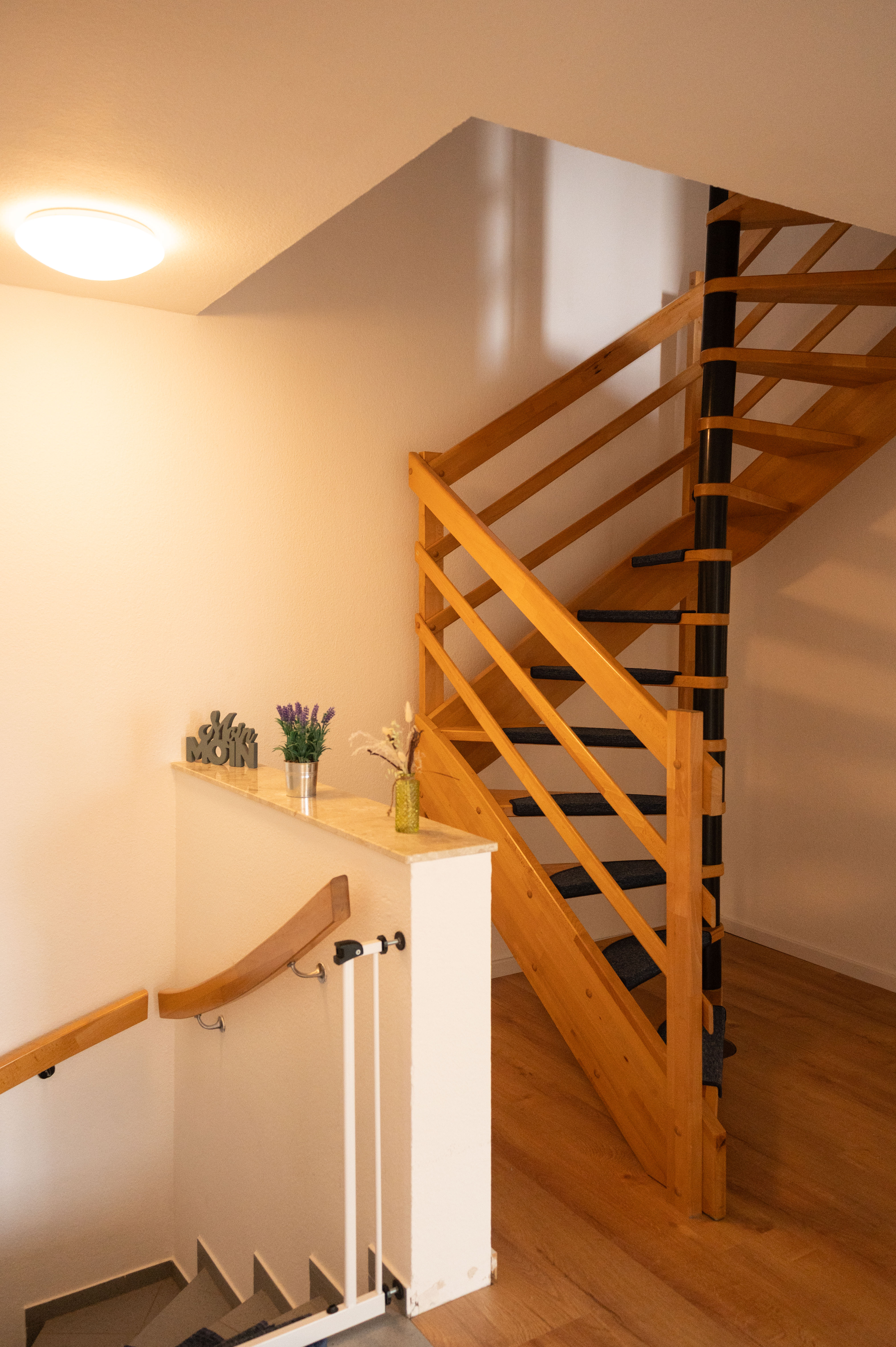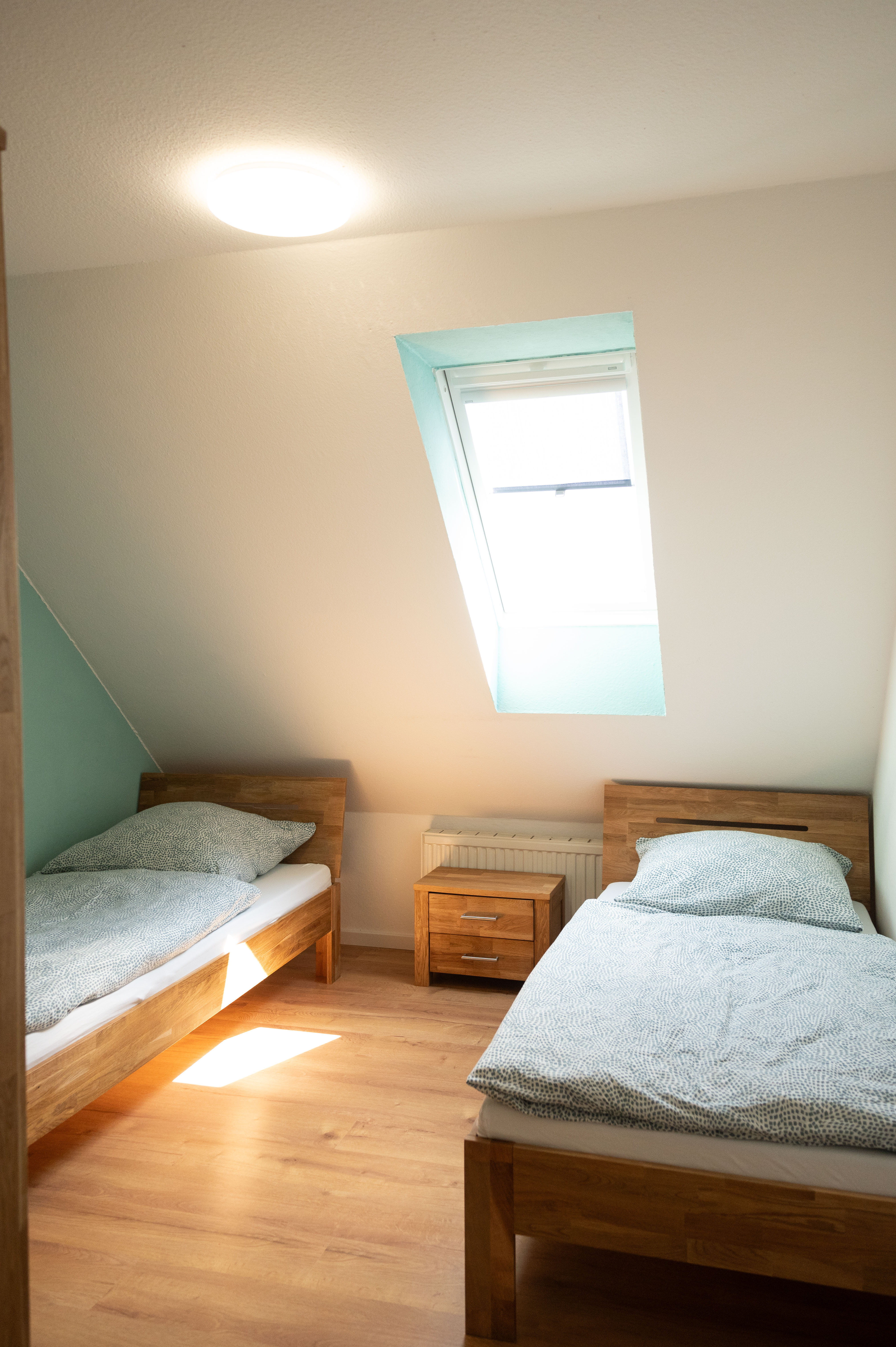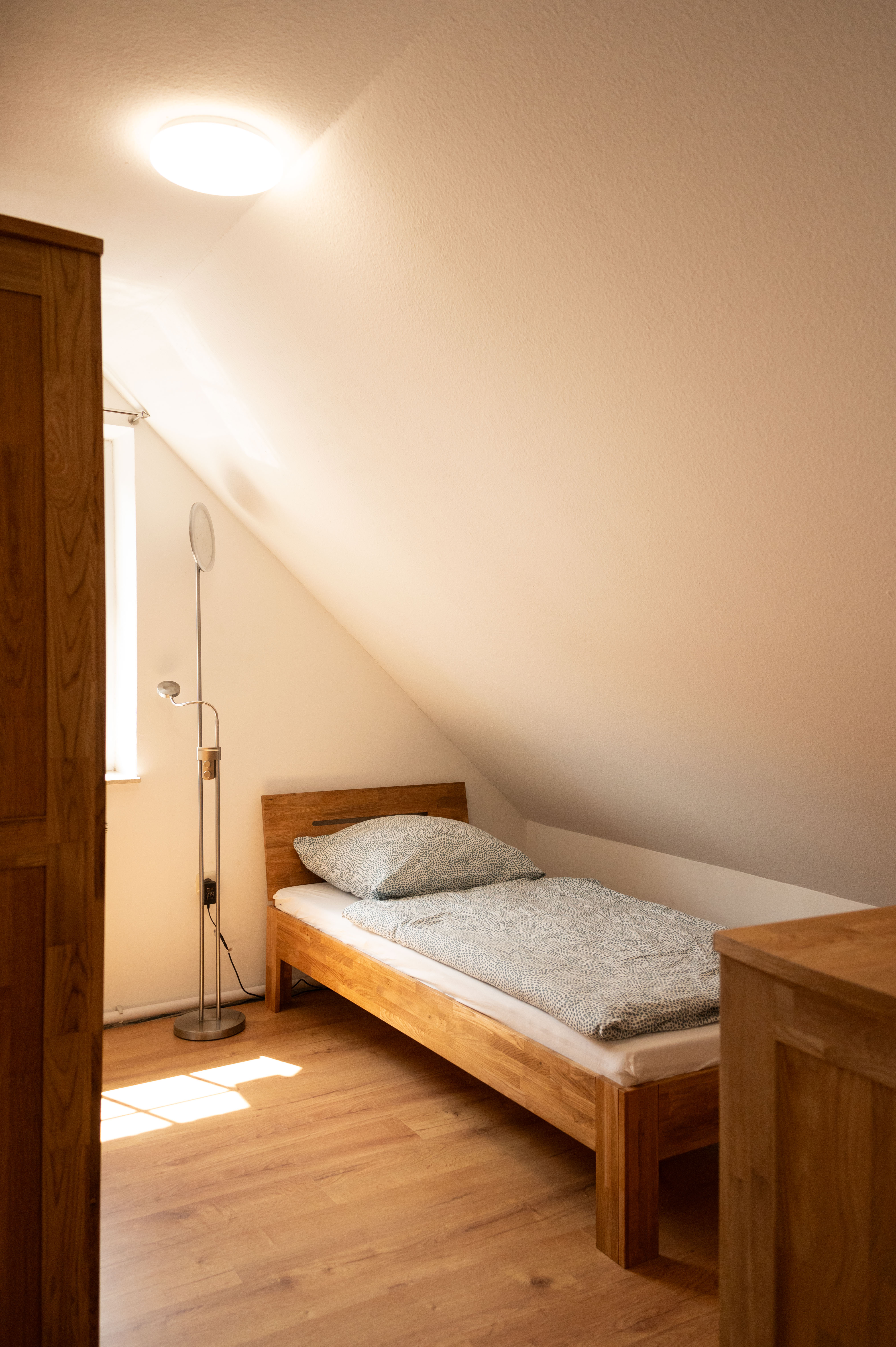 Über eine Wendeltreppe im oberen Flur erreichen Sie den ausgebauten Dachboden, der als viertes Schlafzimmer mit einem gemütlichen Doppelbett und Kommode eingerichtet ist – perfekt für größere Familien oder befreundete Gäste.