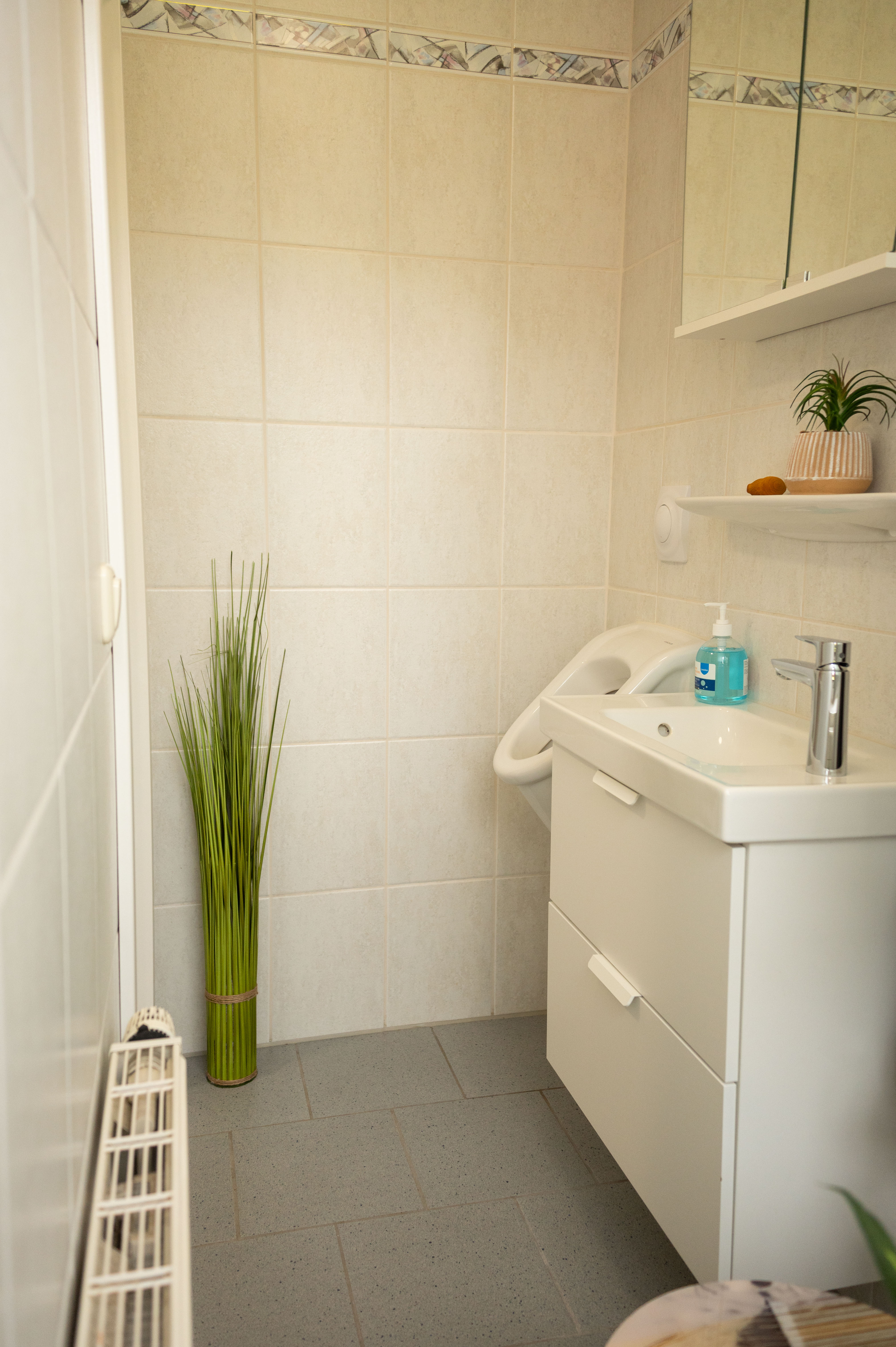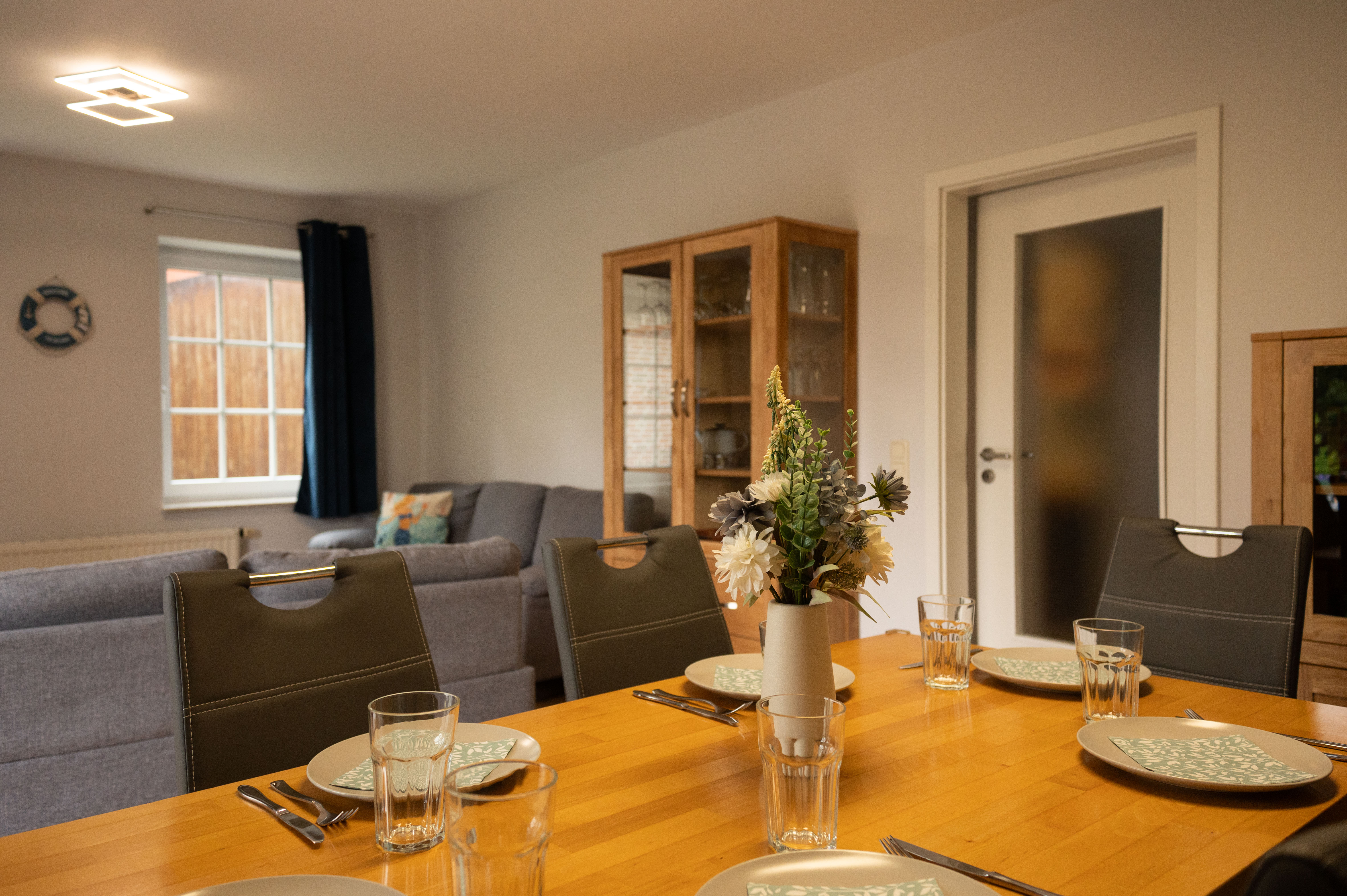 Im Erdgeschoss erwartet Sie ein heller Eingangsbereich, von dem Sie sowohl das Gäste-WC als auch den großzügigen Wohn- und Essbereich erreichen. Hier laden ein gemütliches Sofa und ein großer Esstisch zu entspannten Abenden ein – ob bei einem guten Essen oder einem geselligen Spieleabend. Der Wohnbereich bietet direkten Zugang zur überdachten Terrasse und zum komplett eingezäunten Garten mit Grill – ideal für erholsame Stunden im Freien.