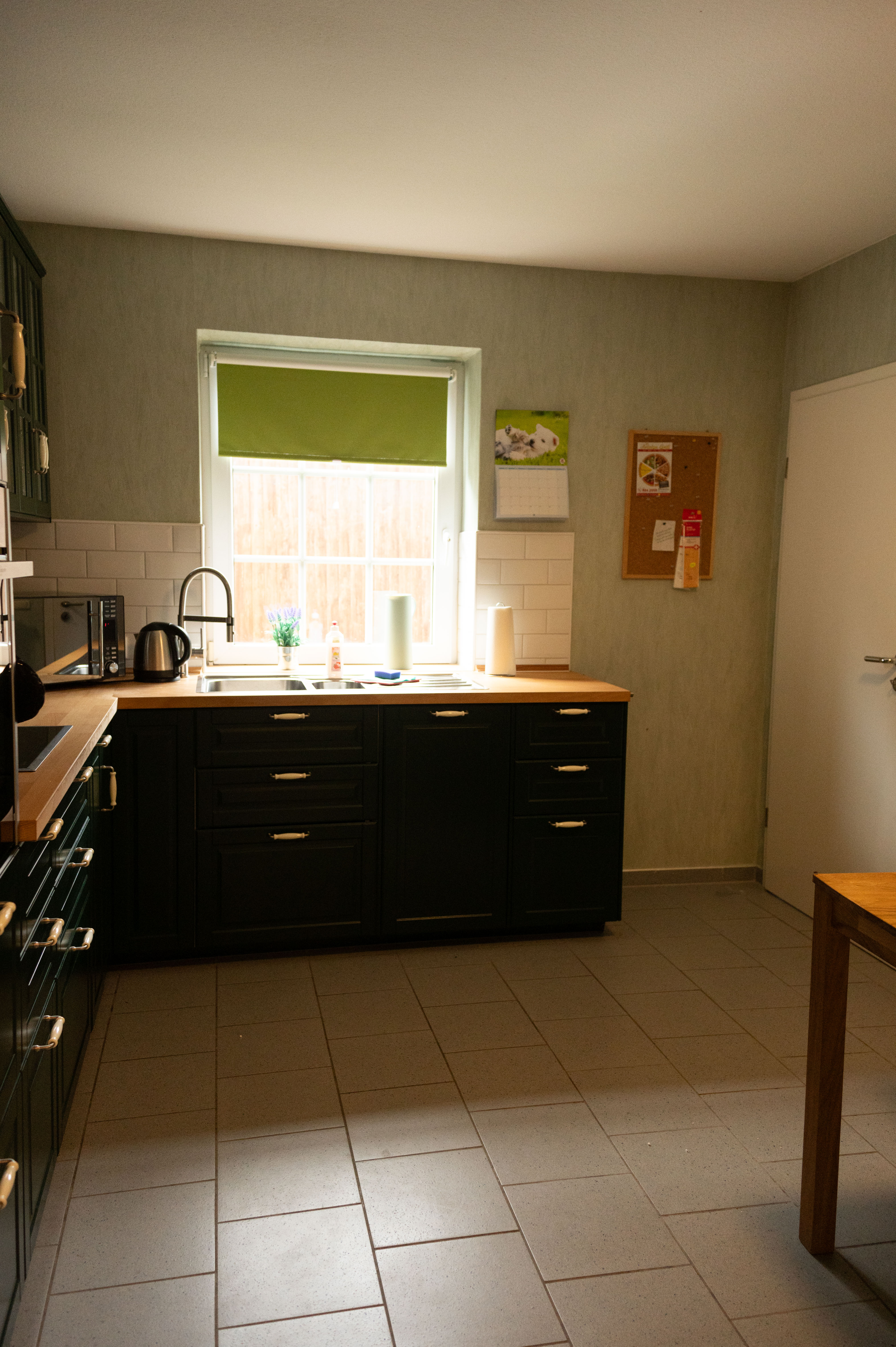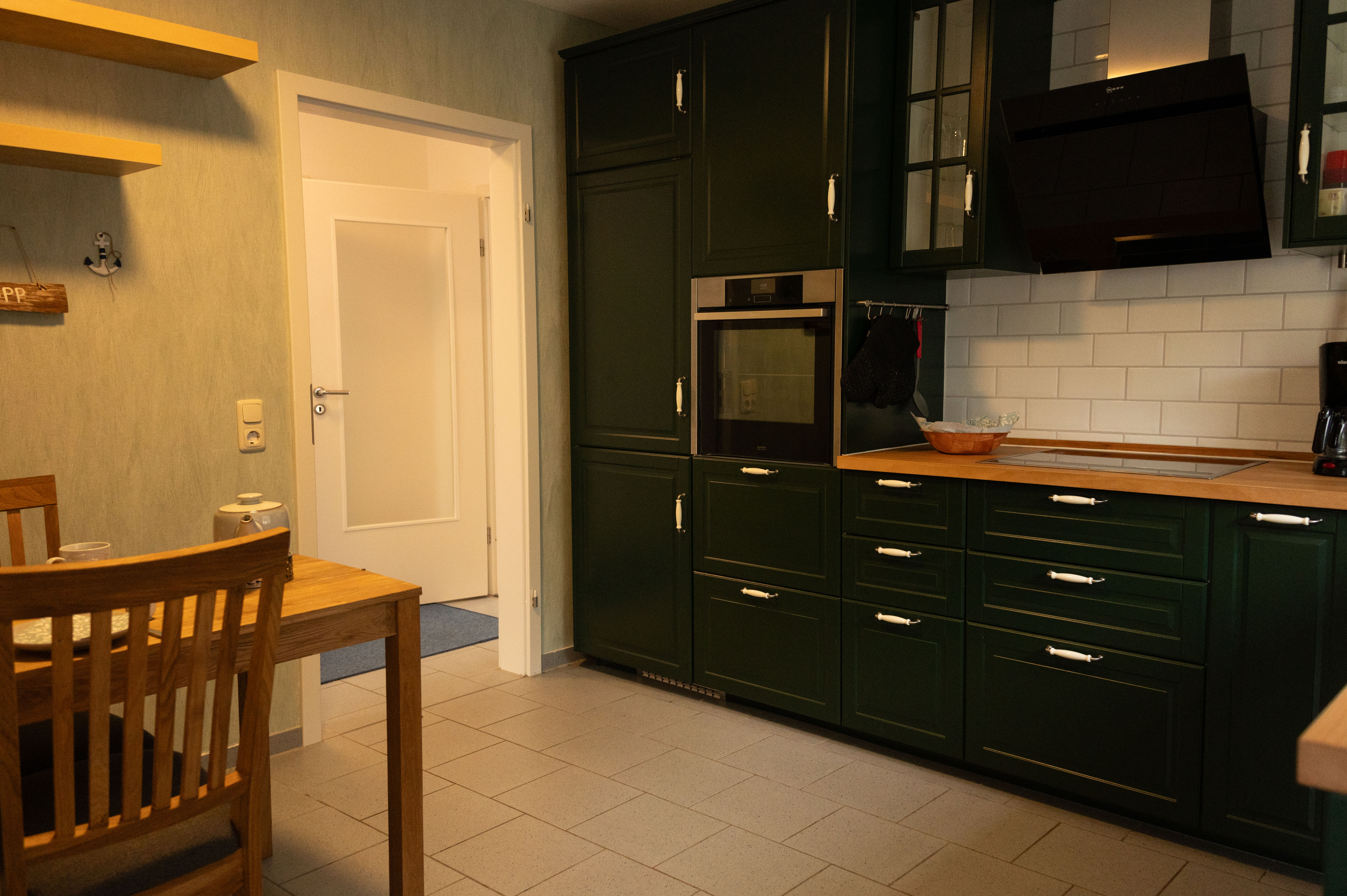 Die voll ausgestattete Küche mit kleiner Sitzecke ist separat zugänglich und führt in einen praktischen Abstellraum mit Waschtrockner sowie einem zusätzlichen Ausgang nach draußen.