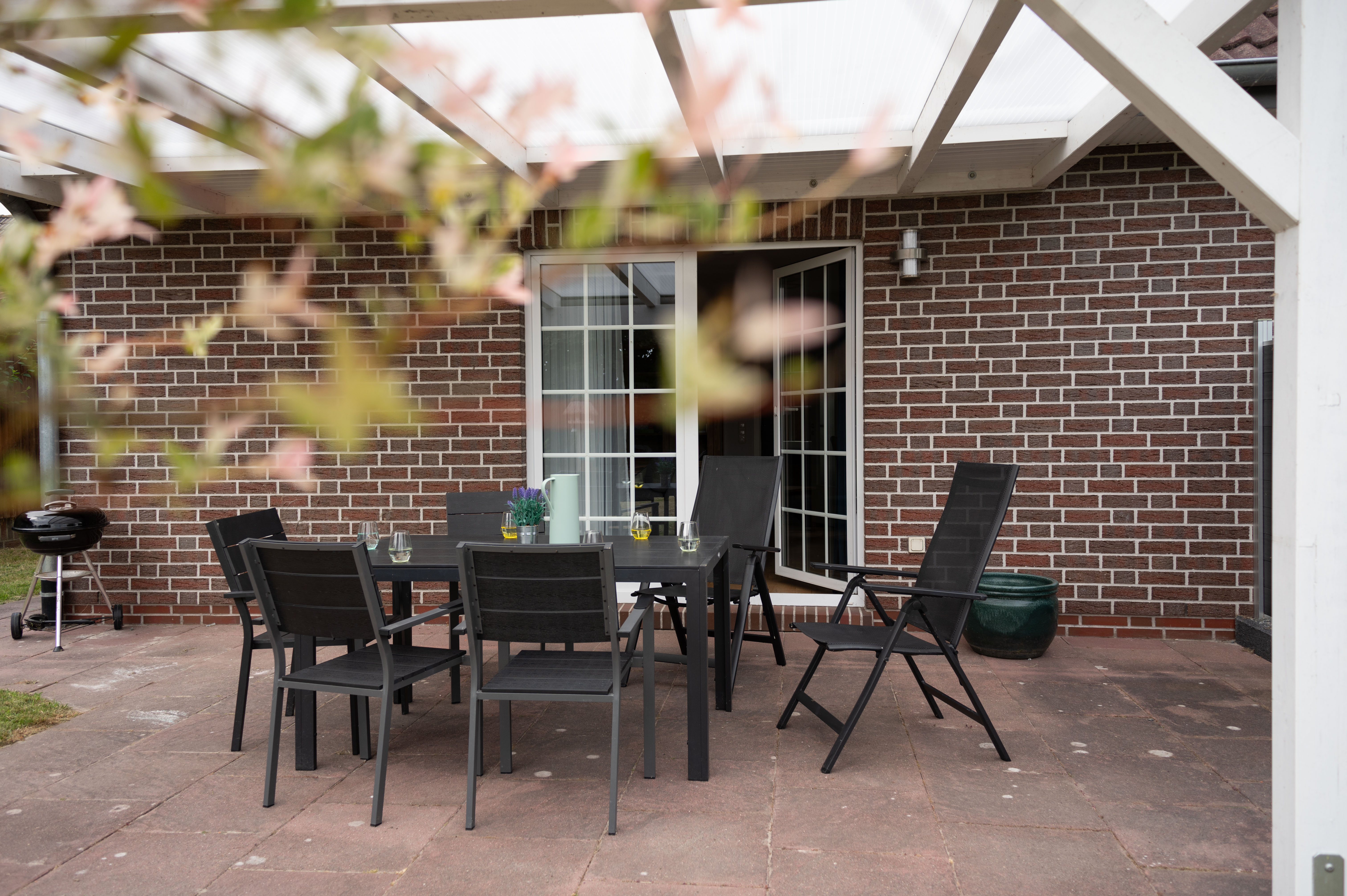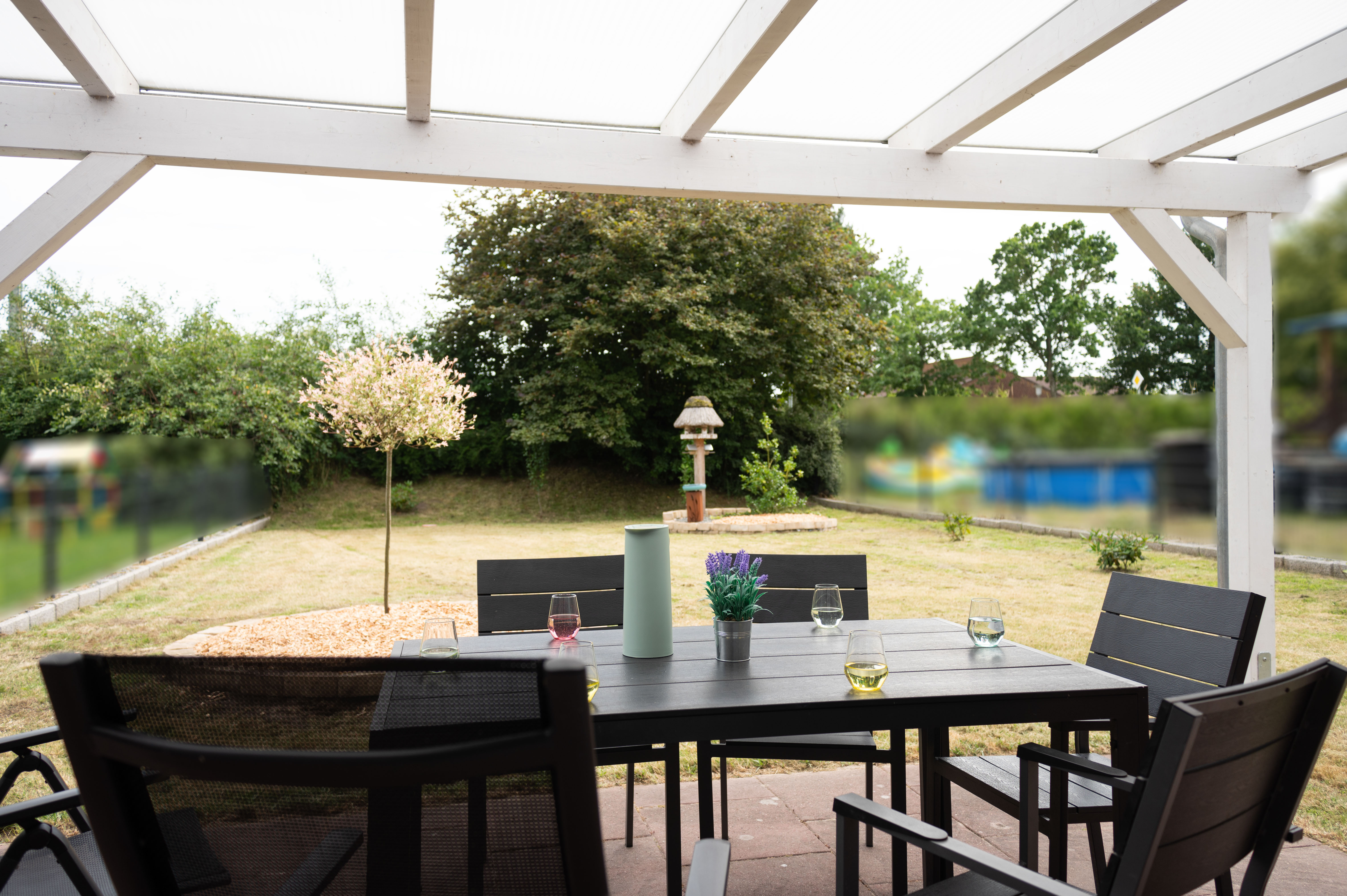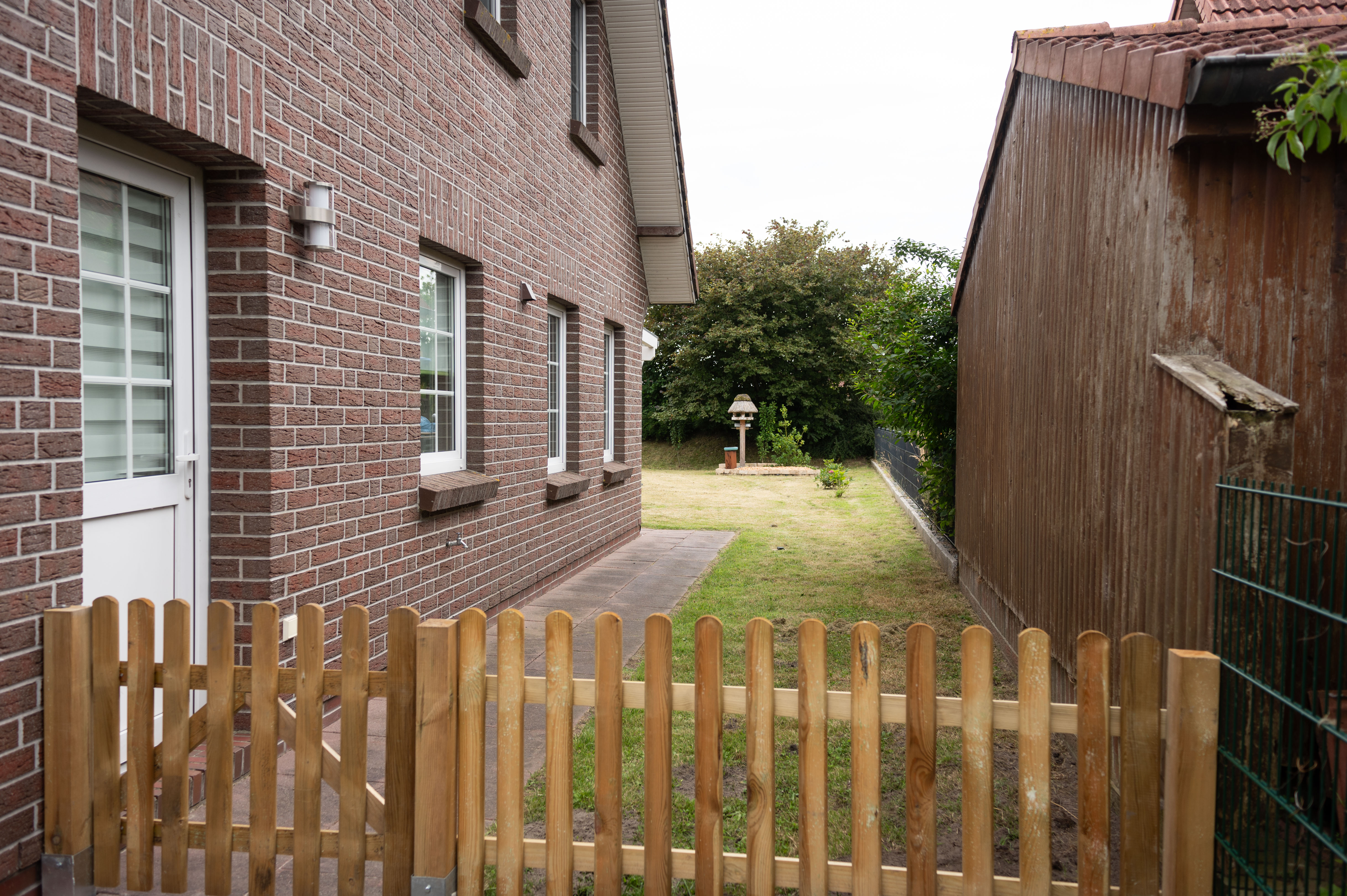 Direkt vor dem Haus befindet sich ein überdachter Carport mit abschließbarem Schuppen für Fahrräder. Der Garten ist auch von außen über ein Tor erreichbar. Bitte beachten Sie, dass nur ein Fahrzeug direkt am Haus abgestellt werden kann; weitere Fahrzeuge können entlang der Straße geparkt werden.
