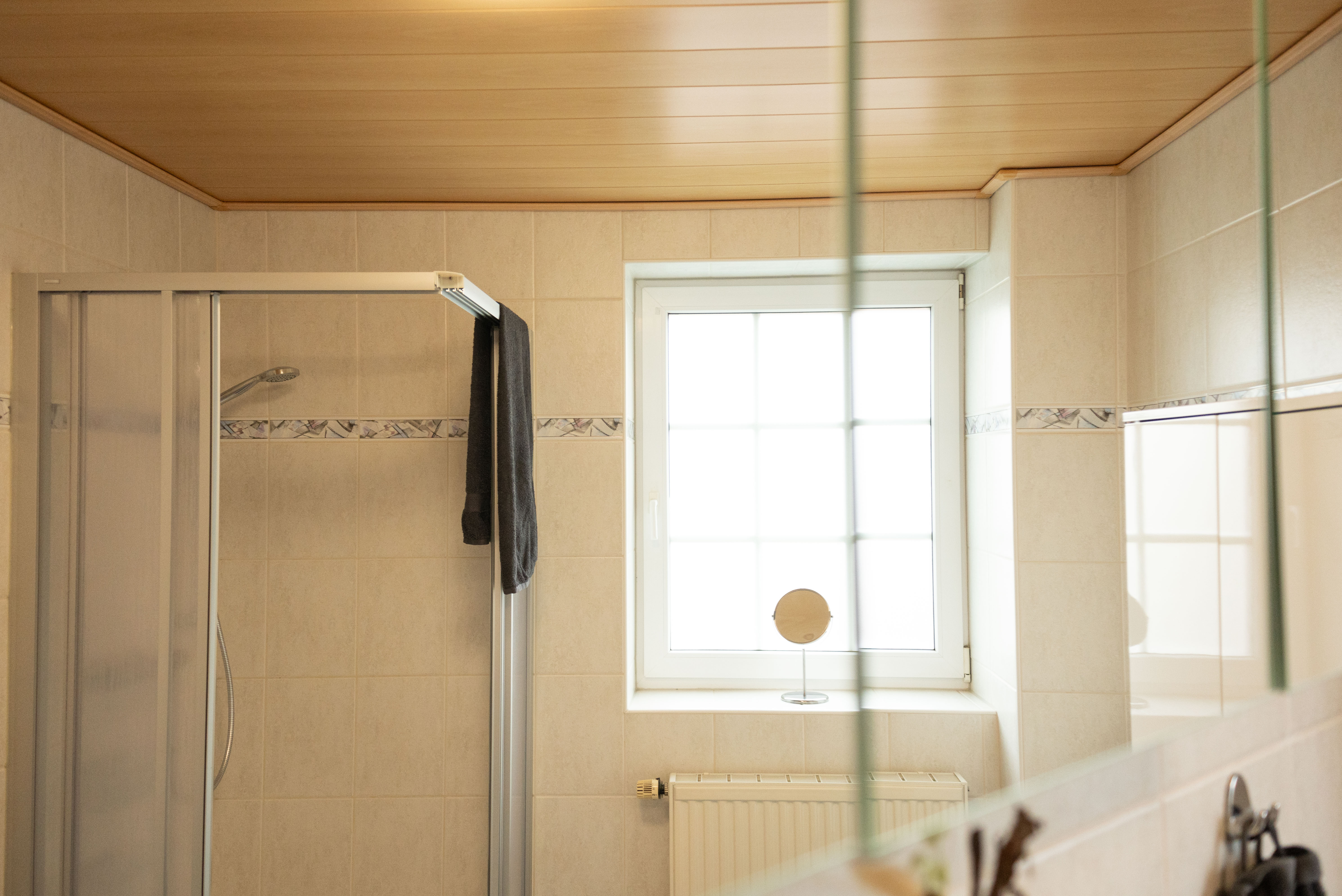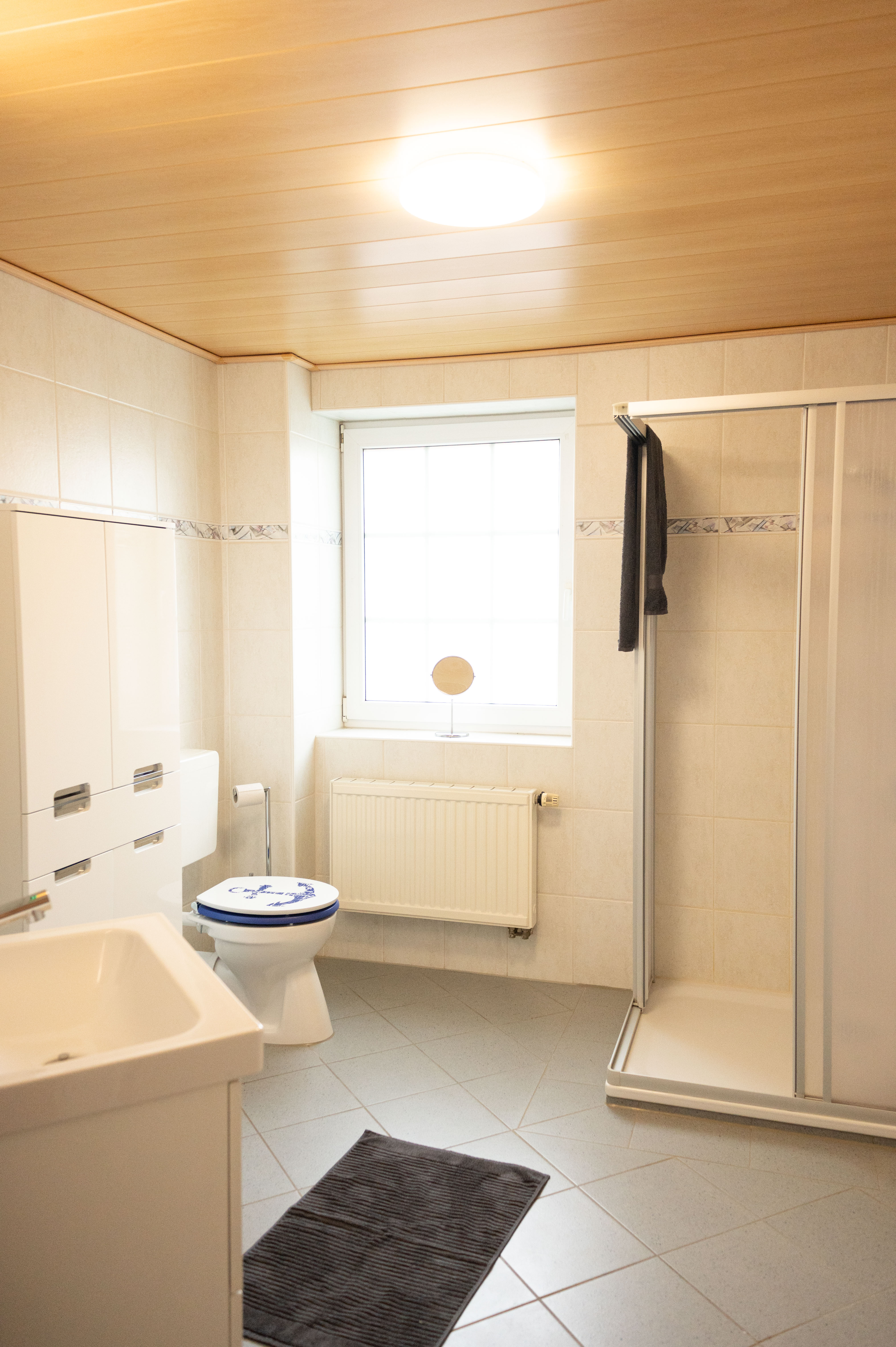 Im Obergeschoss befinden sich drei Schlafzimmer: Das Hauptschlafzimmer mit Doppelbett, Kleiderschrank, Kommode und TV, ein weiteres Zimmer mit zwei Einzelbetten und Kleiderschrank sowie ein drittes Zimmer mit einem Einzelbett, ebenfalls mit Stauraum. Das moderne Badezimmer mit Dusche rundet diese Etage ab.