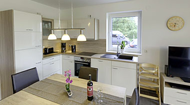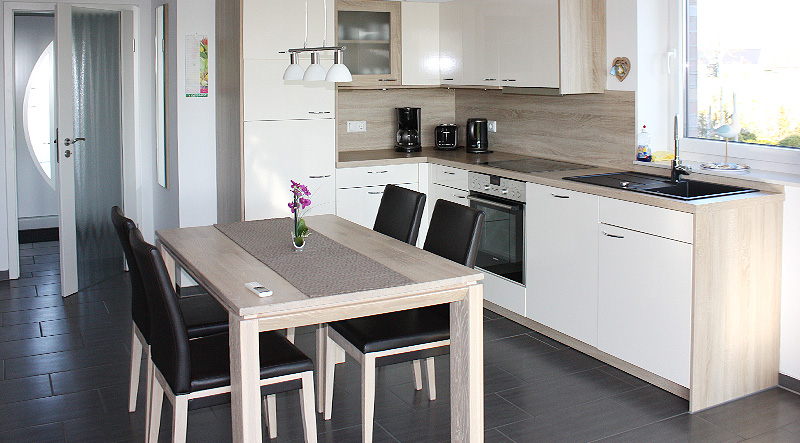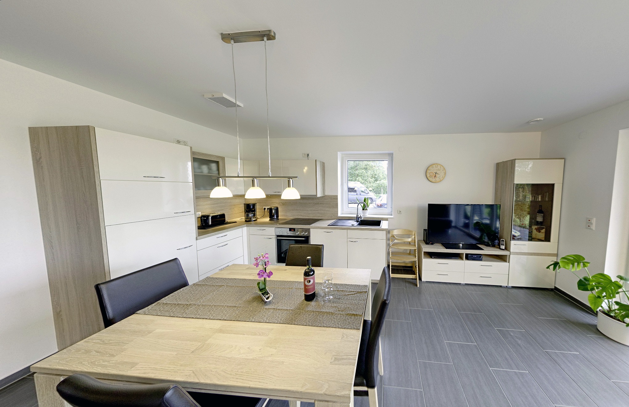 Im Erdgeschoss finden Sie einen hellen, offenen Wohn- und Essbereich mit voll ausgestatteter Küche, der zum gemeinsamen Kochen und Entspannen einlädt. Ein separates WC sowie ein Hauswirtschaftsraum mit Waschmaschine sorgen für zusätzlichen Komfort während Ihres Aufenthalts.