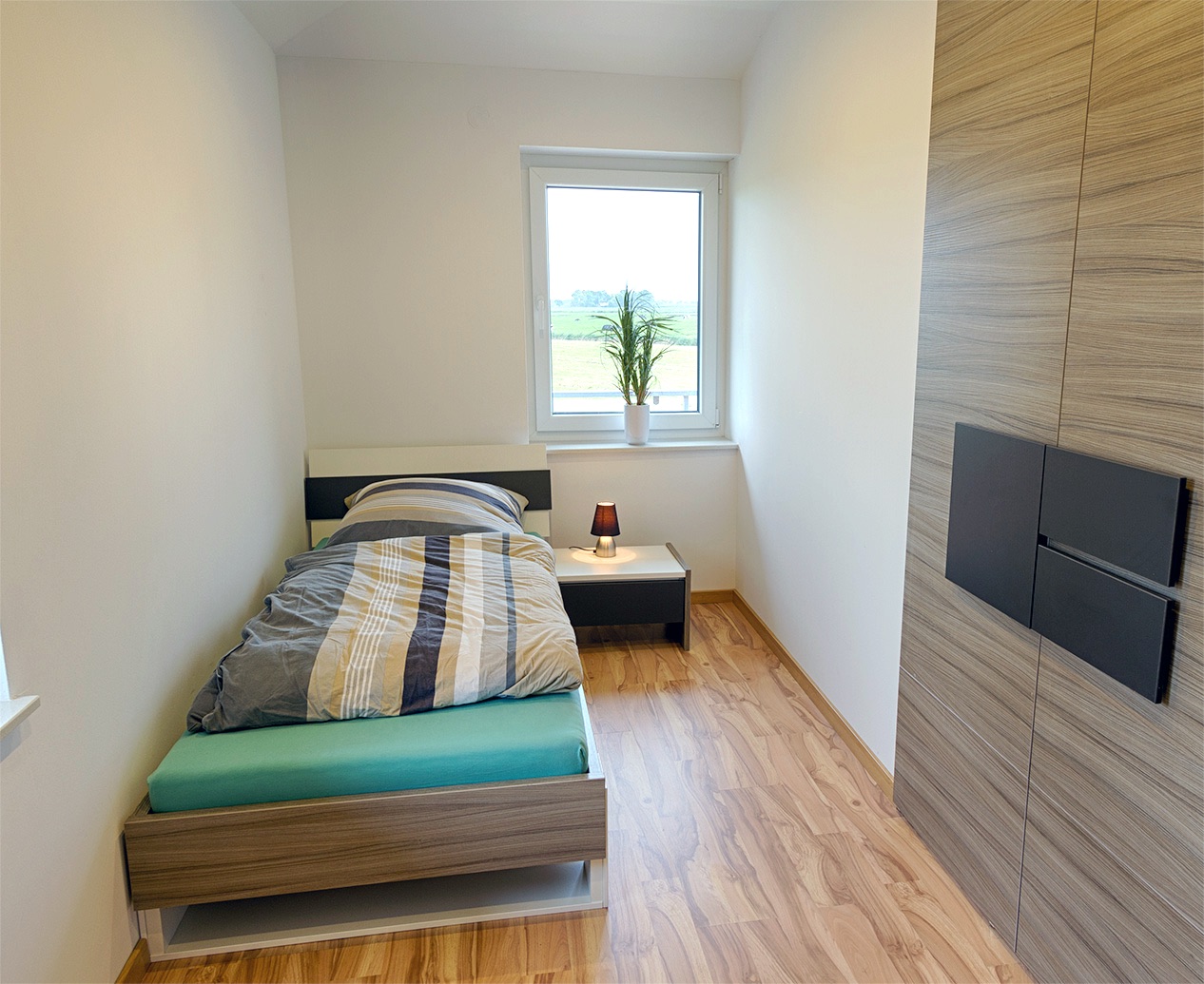 Im Obergeschoss erwarten Sie ein Schlafzimmer mit Doppelbett und ein Schlafzimmer mit Einzelbett, ideal für Paare mit Kind oder kleine Reisegruppen. Highlight des Hauses ist das großzügige Wellnessbad mit Sauna, Badewanne, Dusche und Doppelwaschtisch, perfekt zum Entspannen nach einem Tag an der Nordsee.
