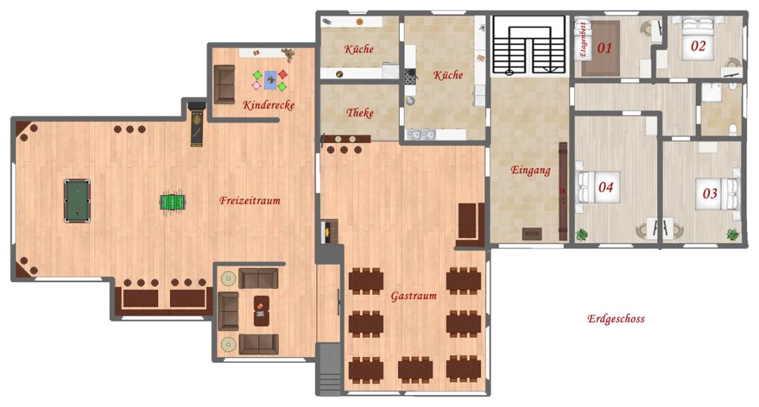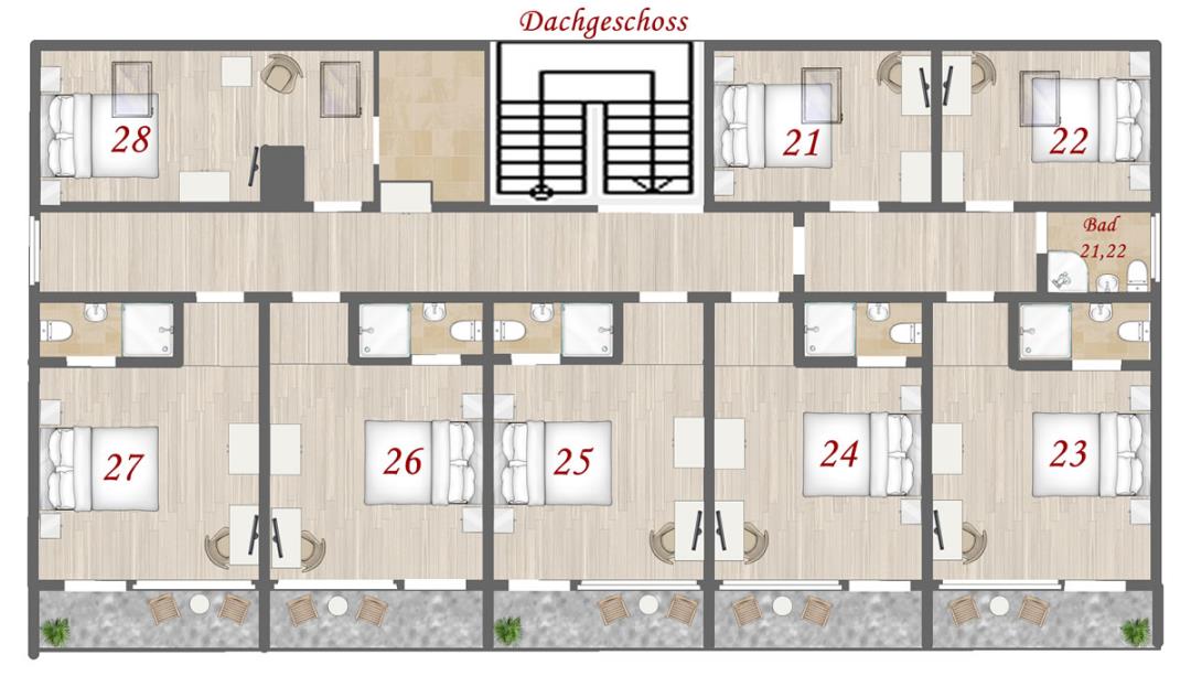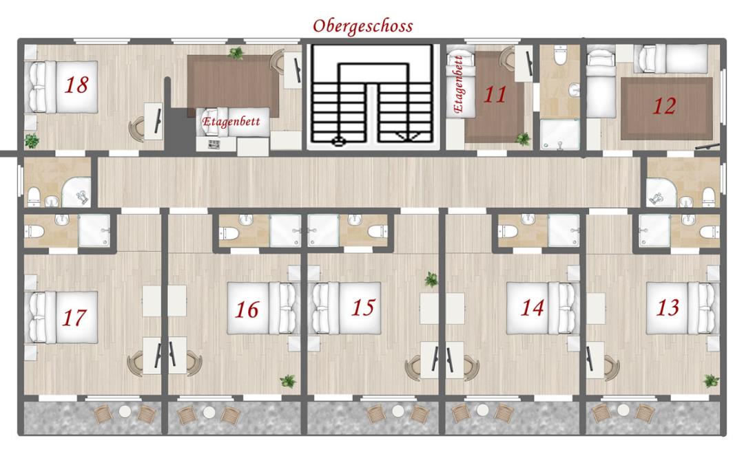 Das Ferienhaus hat 20 Schlafzimmer, die meisten Zimmer haben ein eigenes Bad. Lediglich die Zimmer 1-4 und Zimmer Bad 21 & 22 teilen sich die Zimmer ein Bad (kurzer Gang über den Flur). Auch Zimmer 28 nutzt noch das Bad in Zimmer 27 mit. Ideal als Wohneinheit für Familien oder Kinder geeignet.
