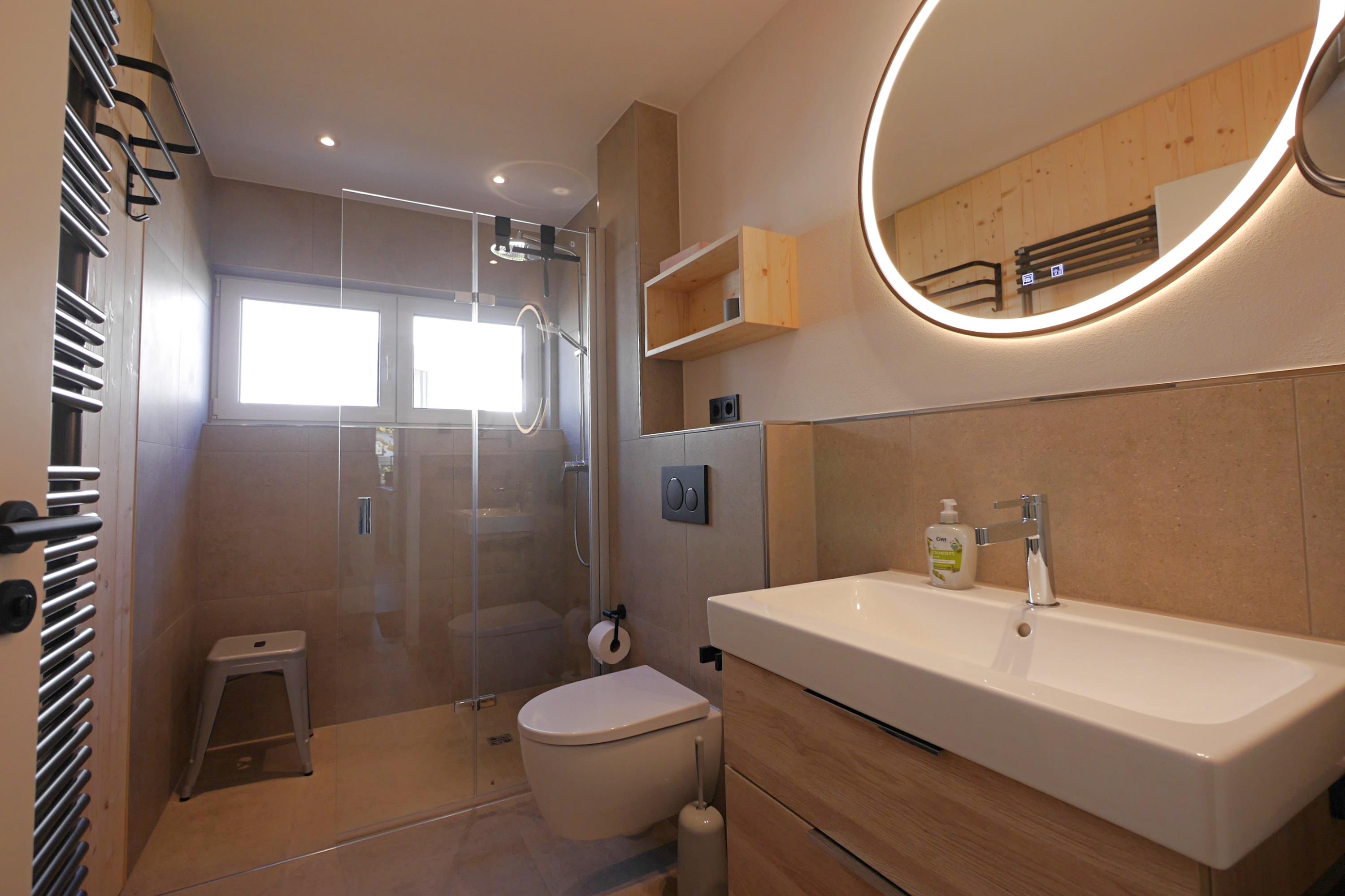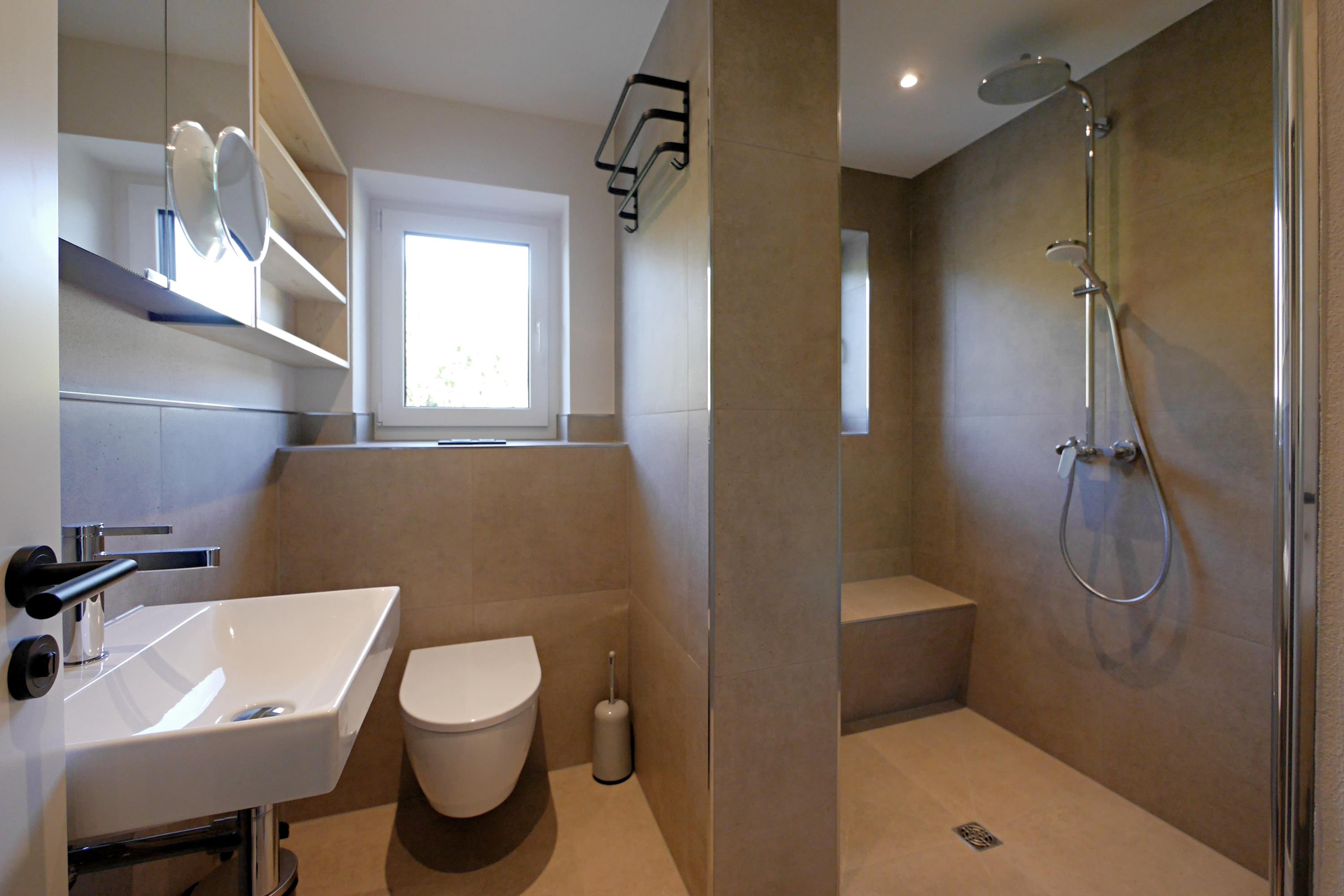 - Bad 1 mit barrierefreier Dusche, Hndtuchheizkörper, Föhn, Kosmetikspiegel und Fenster