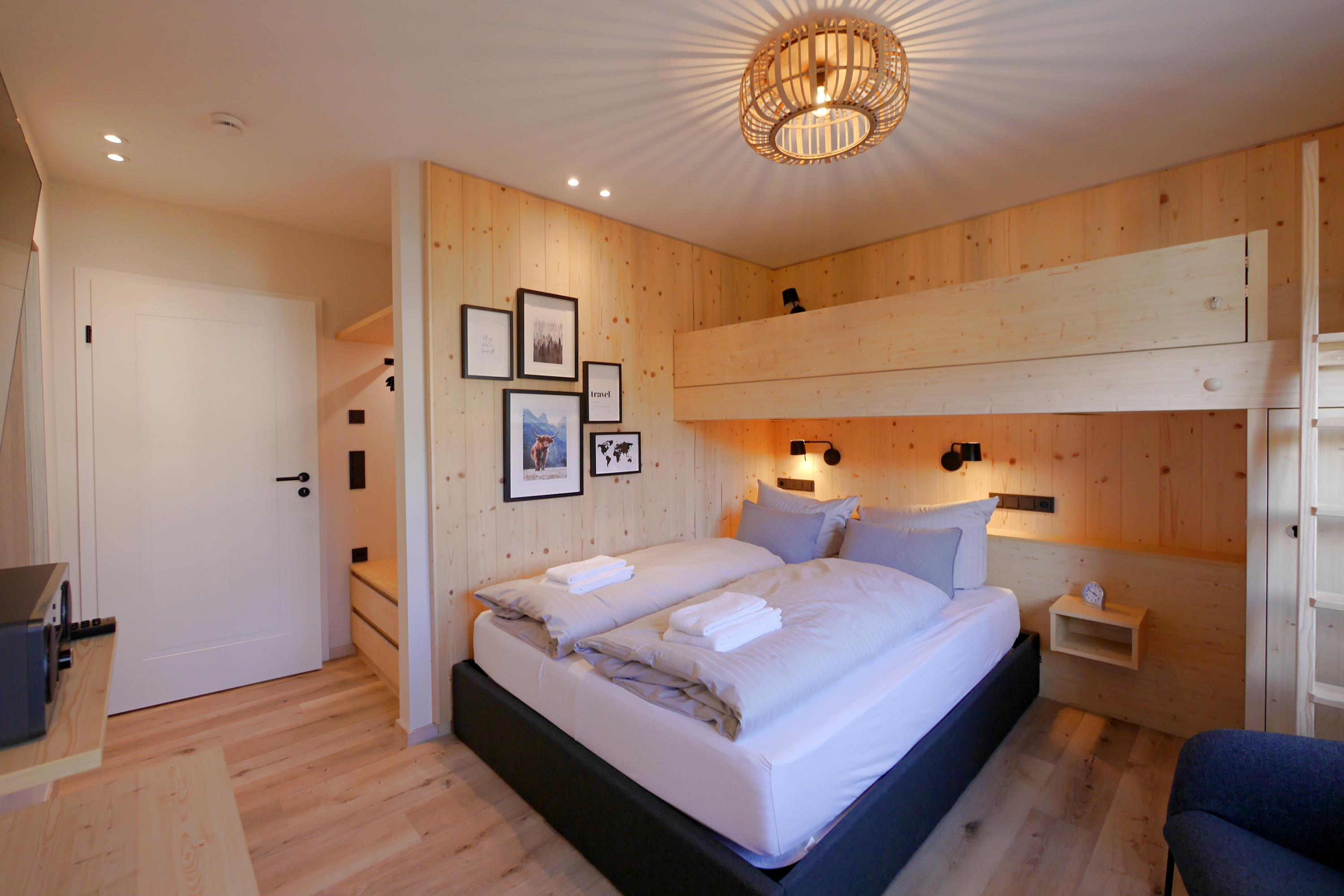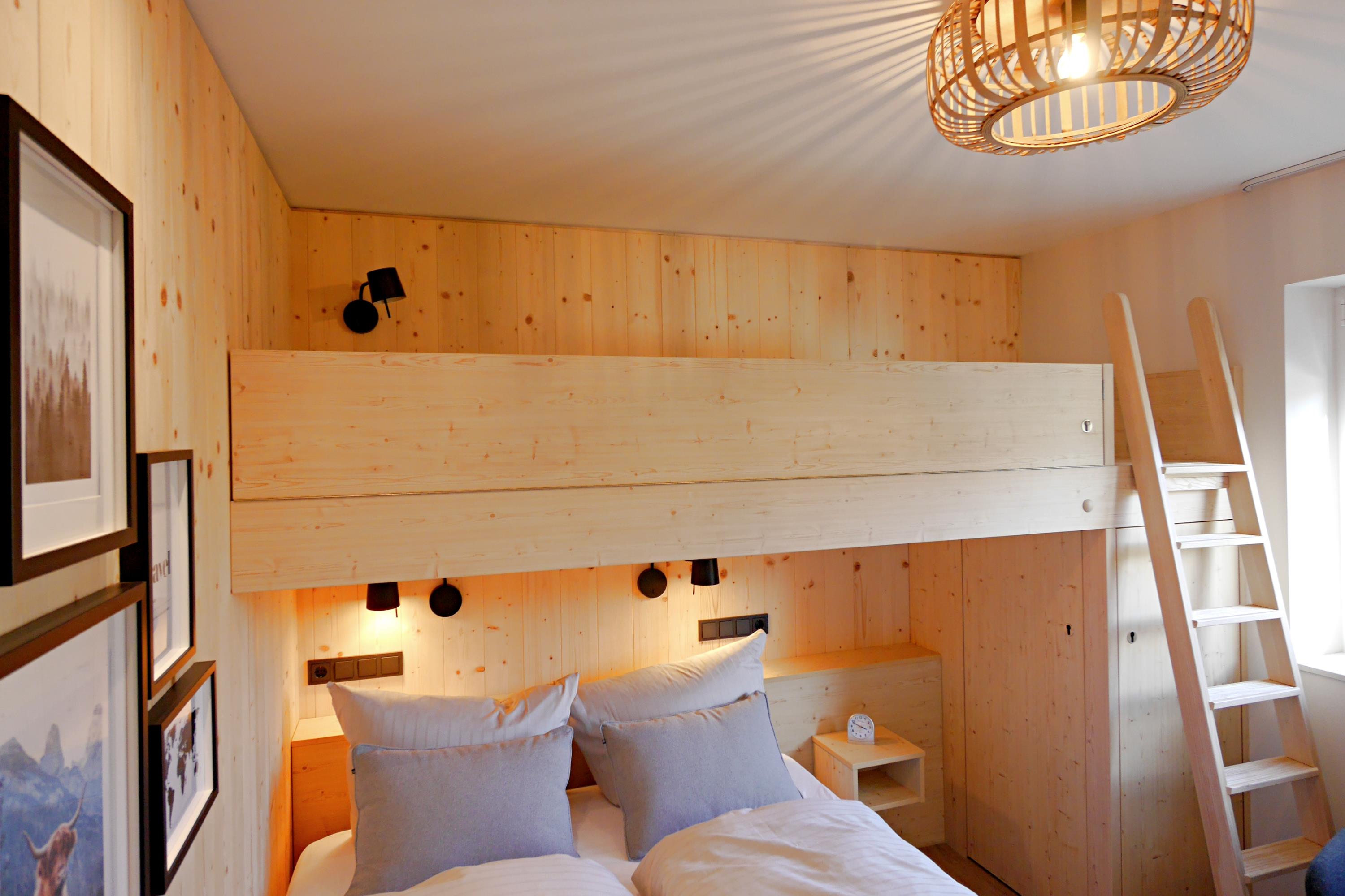 Die im Glamping-Stil mit schlichter Eleganz ausstaffierte Ferienwohnung mit Hauscharakter ist ausgelegt für 6-7 Personen (max. 6 Erw.). Ideal für Mehrgenerationenfamilien und Genussurlauber. Sie verfügt über zwei Zugänge. Einen regulären Zugang über das Treppenhaus sowie einen barrierefreien Zugang über die Terrasse.