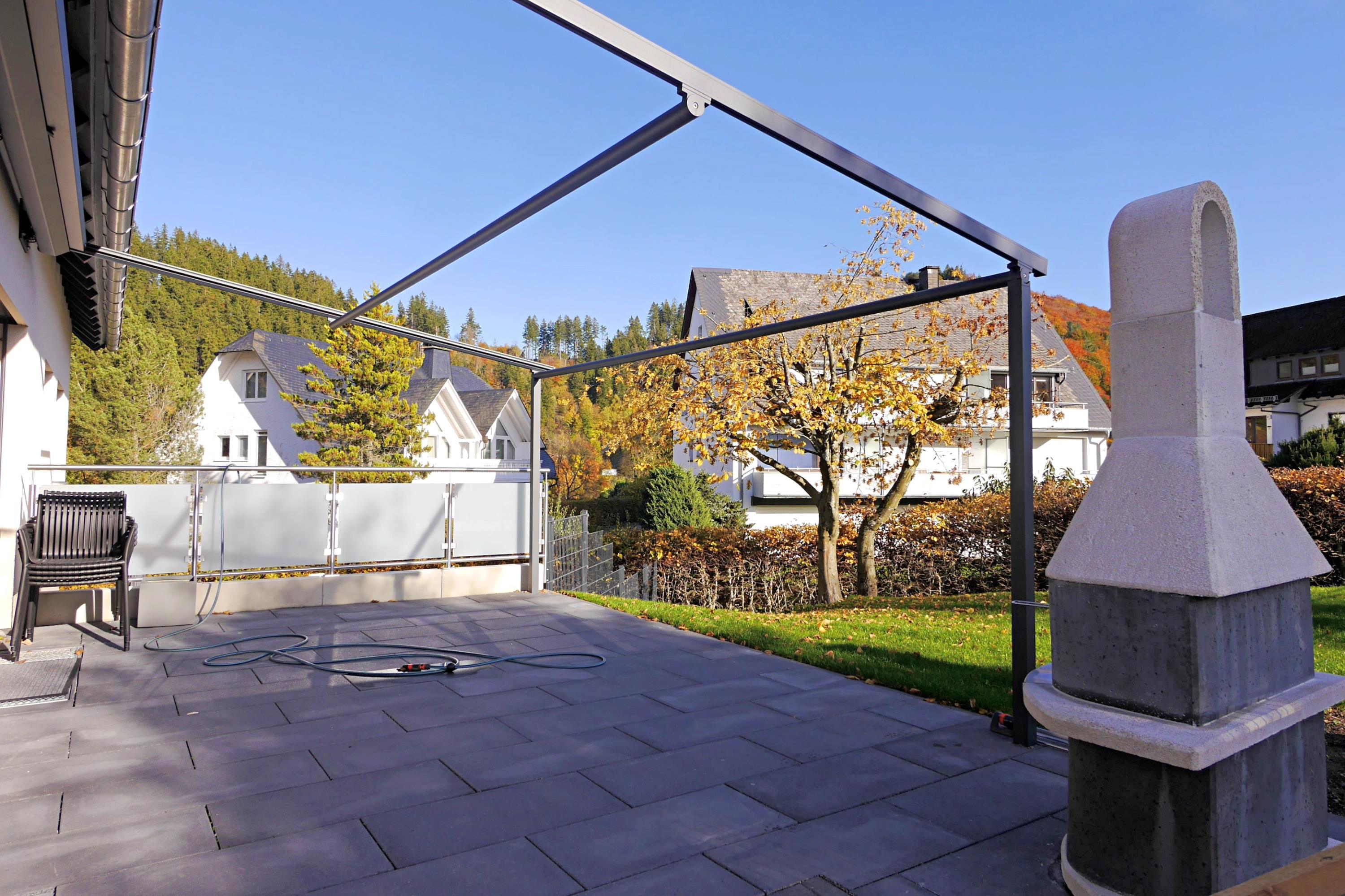 - Südterrasse mit Pergola-Markise, großer Garten-Esstisch, Grill