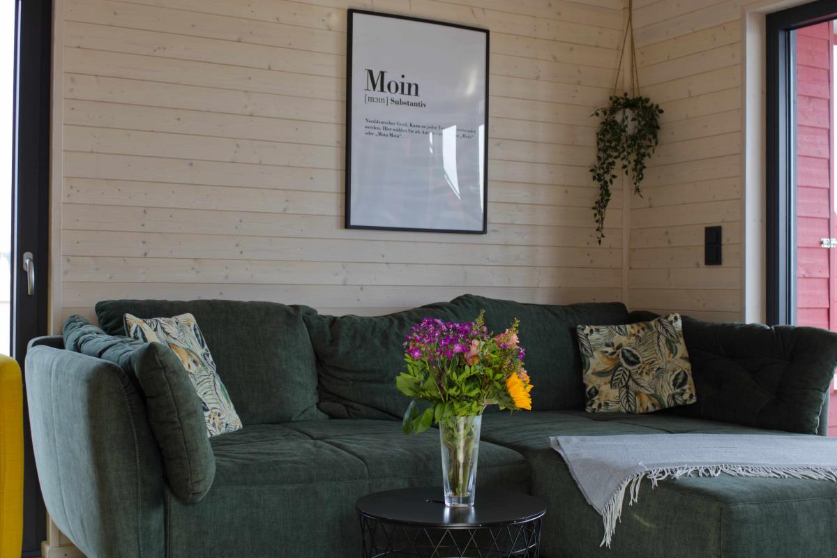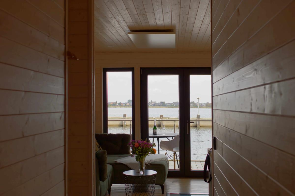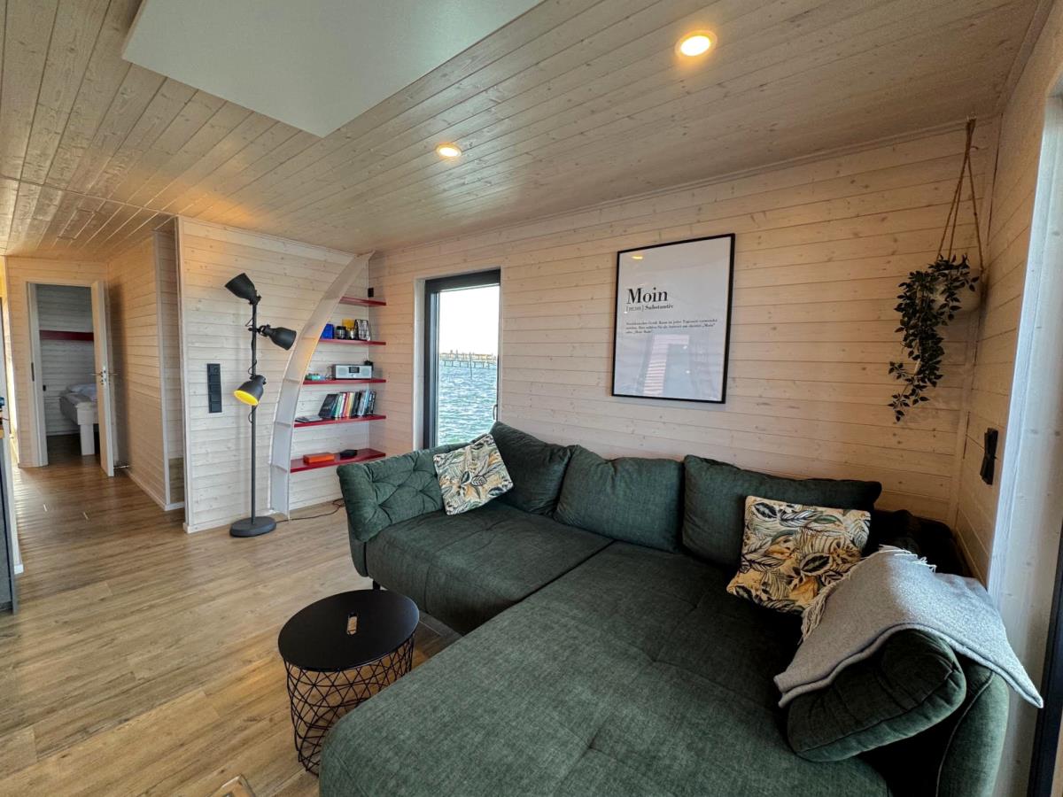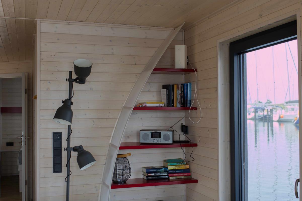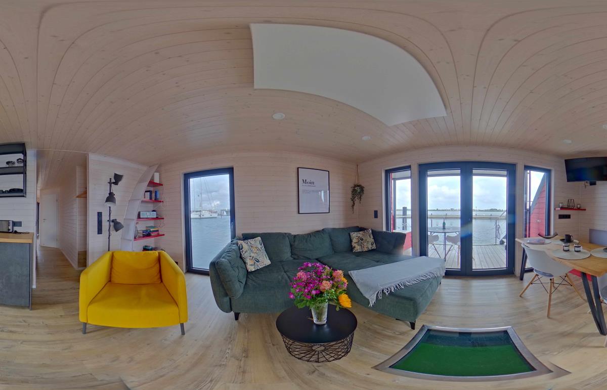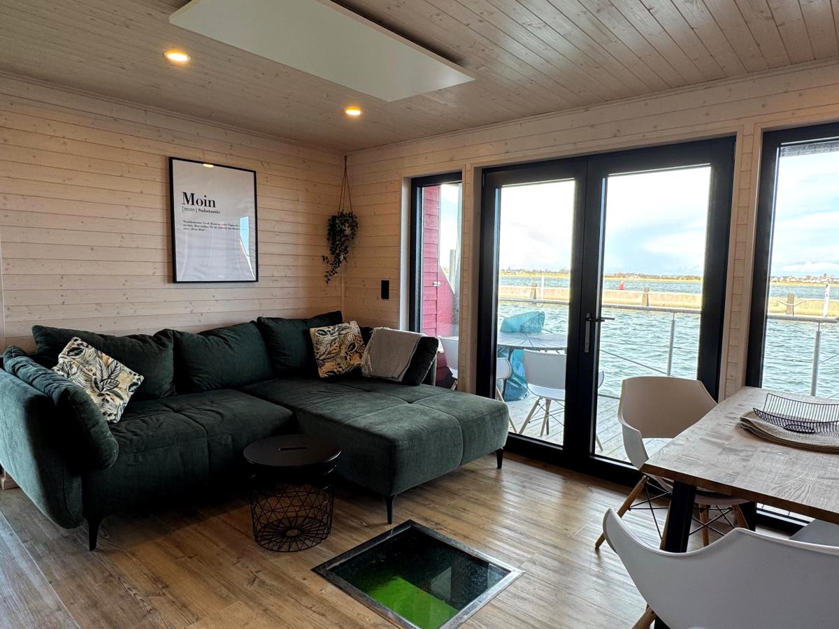 Der großzügige Wohnbereich mit dem komfortablen Sofa und dem gemütlichen Sessel lädt zum Verweilen ein. Die riesigen Panoramafenster geben den Blick frei auf den Yachthafe. Machen Sie es sich bequem und beobachten Sie das maritime Treiben vor Ihrer „Haustür". Schauen Sie Ihre Lieblingssendungen auf dem Flatscreen-TV, hören Sie Radio oder greifen Sie zu einem der vorhandenen Bücher. Das kostenlose WLAN hält Sie bei Bedarf mit der Außenwelt verbunden.