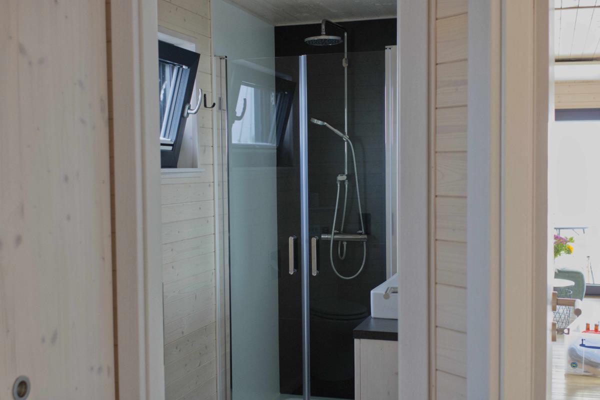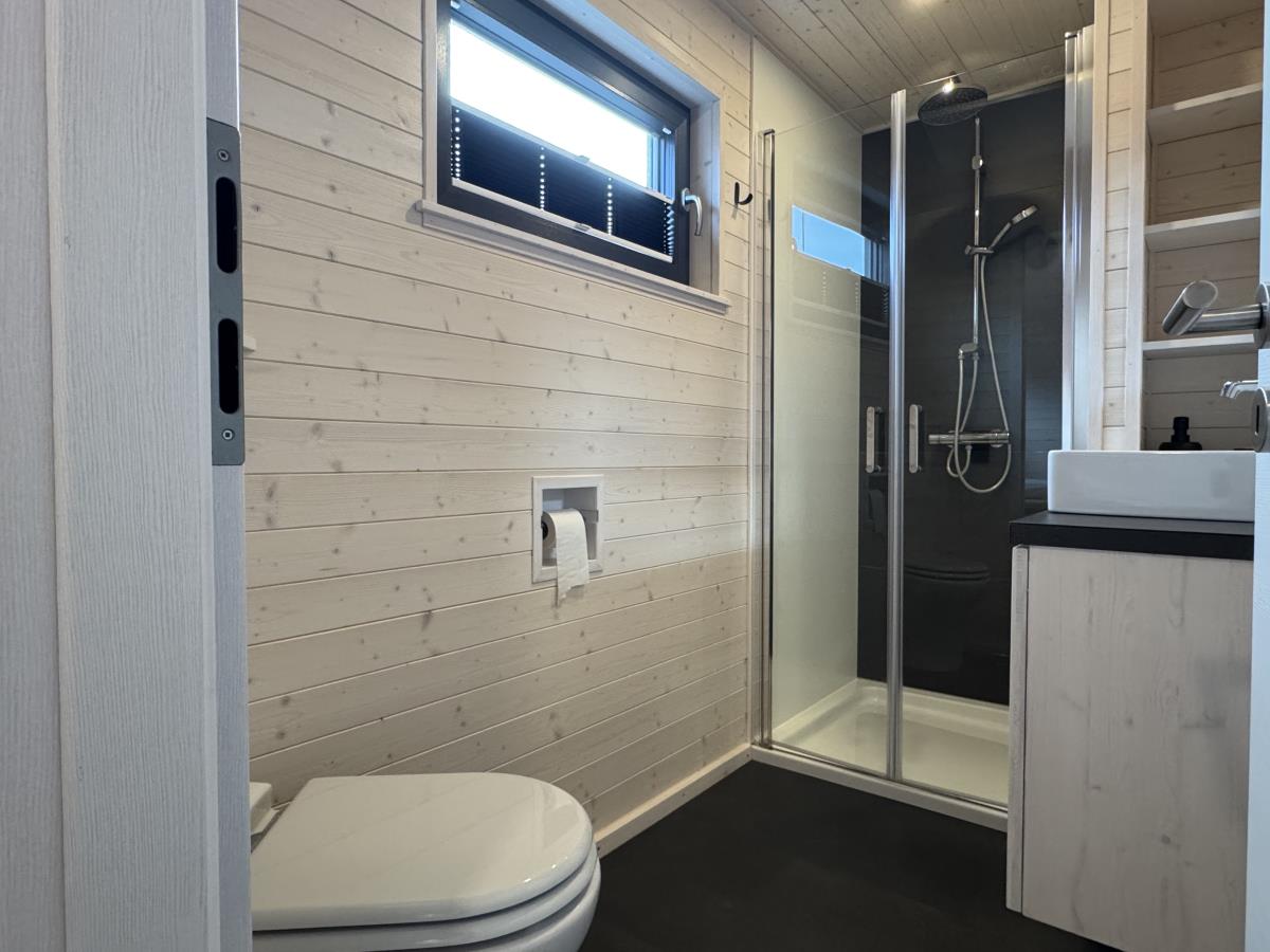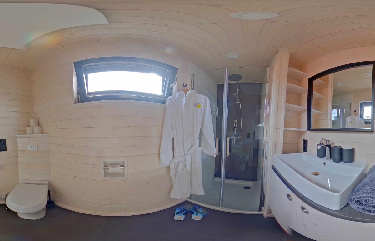 Die beiden Badezimmer sind modern und stilvoll gestaltet. Die bodengleichen Duschen mit den hochwertigen Armaturen laden zum Erfrischen ein, hier können Sie nach einem Tag am Strand oder nach Ihren Aktivitäten entspannt duschen. Die Holzdecken verleihen selbst den Bädern einen besonderen Charme.