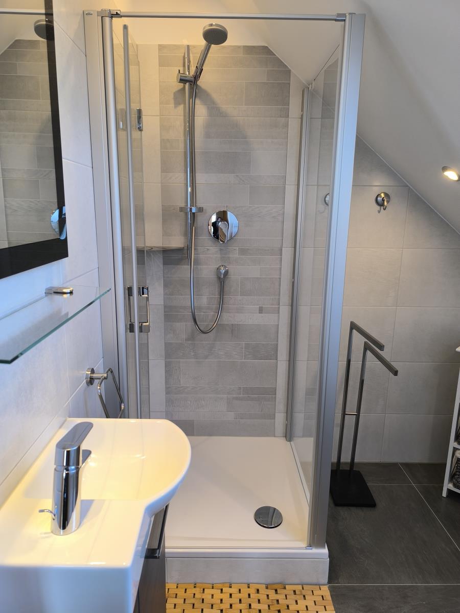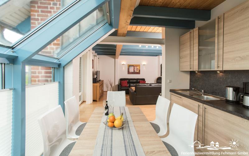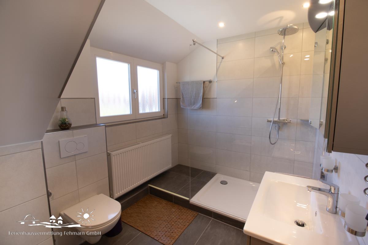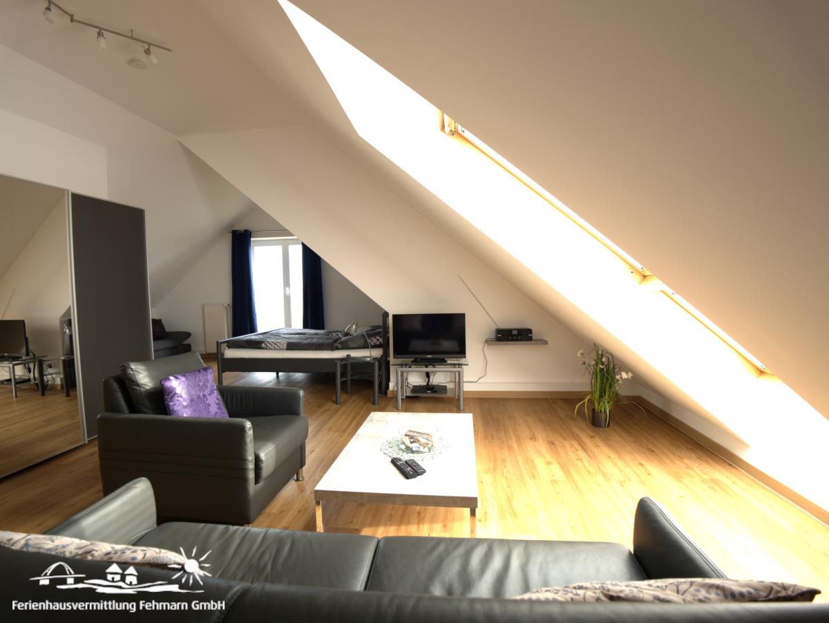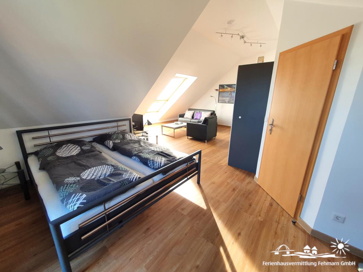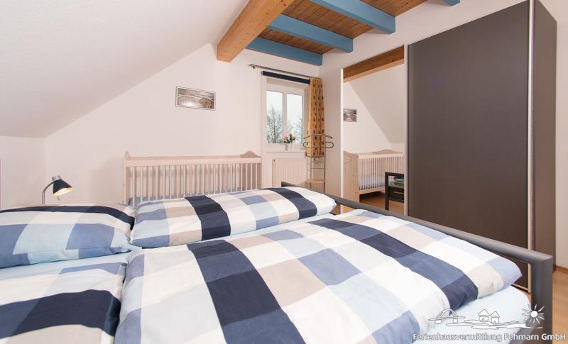 Die 120 m² große Wohnung für bis zu 8 Personen (8. Person im Beistellbett gegen Aufpreis) und 1 Kleinkind (im Kinderbett), liegt links im Obergeschoss des Hauses Fritz-Bleyl-Weg 16a und erstreckt sich über 2 Etagen. Die schöne Wohnung unterteilt sich in einen großzügigen Wohnraum mit angrenzender, offener Küche, 2 Schlafzimmer für je 2 Personen, 1 großes Schlafzimmer mit Wohnbereich in der oberen Etage für 3 Personen, 2 Badezimmer mit Dusche und einen Südbalkon. Der Wohnraum ist sowohl gemütlich als auch geschmackvoll eingerichtet und verfügt über eine große Sitzecke, einen Flat TV, einen DVD-Player und eine HIFI-Anlage. Internet per W-LAN steht kostenlos zur Verfügung. Ein Kamin im Wohnraum sorgt an kühleren Tagen für eine kuschelige, gemütliche Atmosphäre. Abgelagertes Brennholz und Anzündmaterial sind bei Bedarf mitzubringen, können aber auch im Baumarkt auf Fehmarn erworben werden. Die an den Wohnraum angrenzende offene Küche ist komplett ausgestattet mit Spülmaschine, Kühlschrank mit Gefrierfach, Herd mit Backofen, Mikrowelle, Kaffeemaschine, Wasserkocher etc. Es sind ausreichend Geschirr, Besteck, Haushaltsrolle, Küchenausstattung sowie ein Hochstuhl für die Kleinen vorhanden. Spültücher, Spülmittel und Trockentücher etc. bitte mitbringen, 1 Spültab liegt für den Anfang bereit. Der Essplatz an einer Panorama-Fensterfront bietet Ihnen eine herrliche Aussicht über Wiesen und Felder auf den Burger Binnensee und den Yachthafen. In den beiden unteren Schlafzimmern befindet sich jeweils ein 180x200 cm Doppelbett, zusätzlich befindet sich in einem Schlafzimmer ein Gitterbettchen. Ein Schlafzimmer ist zusätzlich mit einem 66cm Flat TV ausgestattet. Das 38 m² große Appartement im Dachgeschoss unterteilt sich in einen großen Wohn- Schlafraum und ein separates Badezimmer mit Dusche und WC. In dem Wohn- Schlafraum befinden sich ein 180x200 cm Doppelbett, eine Schlafcouch, sowie eine gemütlich eingerichtete Sitzecke mit Flat TV und CD-Spieler mit Radio. Bei Bedarf steht Ihnen eine Waschmaschine und ein Trockner zur Verfügung, Waschmittel ist bei Bedarf mitzubringen. Haustiere sind herzlich willkommen! Für ein Haustier berechnen wir pauschal je Aufenthalt 45,- €. Aus dem Wohnzimmer treten Sie auf den Südbalkon mit Blick auf den Burger Binnensee und den Yachthafen. Hier bieten Ihnen Gartenmöbel und Schirm die Möglichkeit, entspannte Stunden zu verbringen. Des Weiteren kann auch gerne der Garten genutzt werden. Hier steht Ihnen ein Grill zur Verfügung. Zu jeder Wohnung gehört ein PKW-Stellplatz auf dem Grundstück. Des Weiteren steht den Gästen ein überdachter Fahrrad-Stellplatz zur Verfügung.
