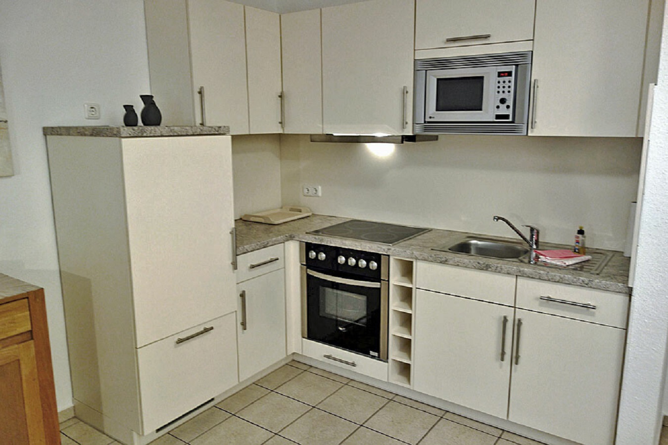 Im Wohnzimmer findet sich eine Schlafcouch , Flat-screen TV und integrierter Einbauküche mit Ceranfeld , Backofen , Kaffemaschine sowie einer Essecke. Badezimmer mit Dusche