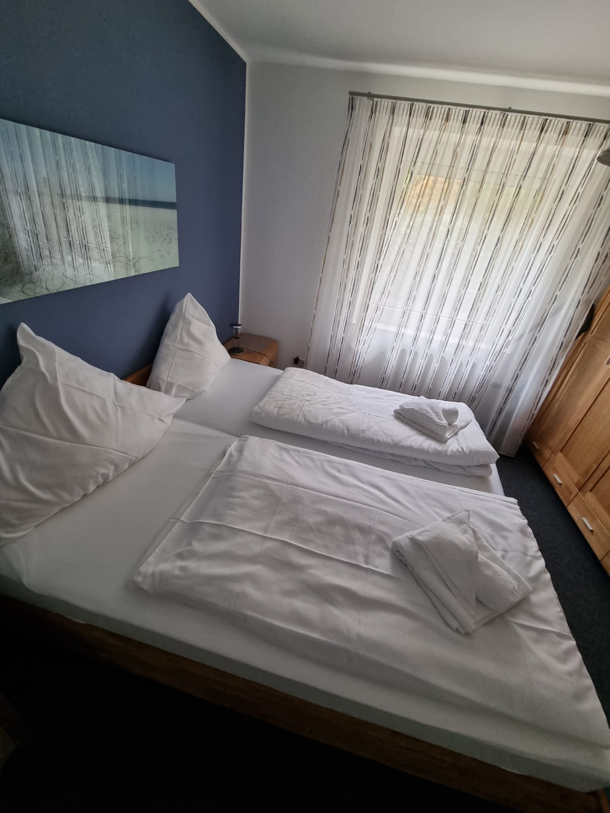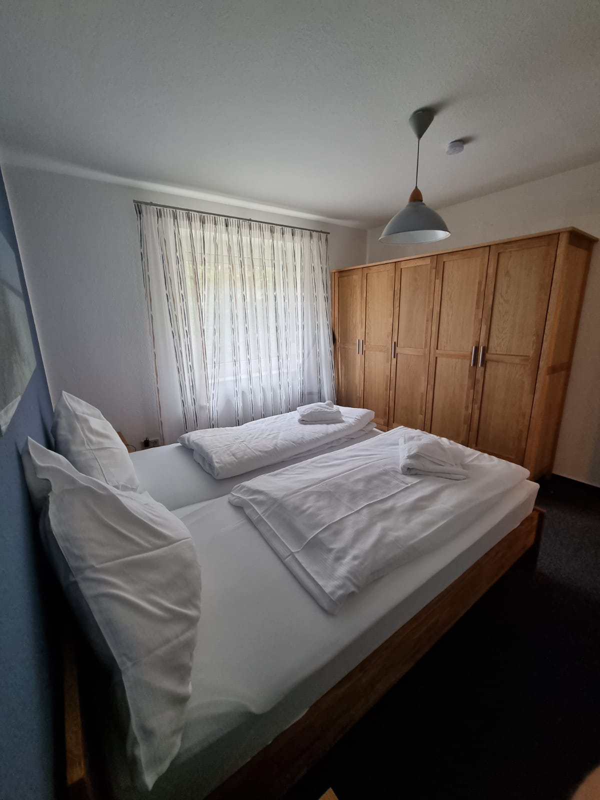 Das Schlafzimmer ist mit einem Doppelbett und Kleiderschrank ausgestattet.