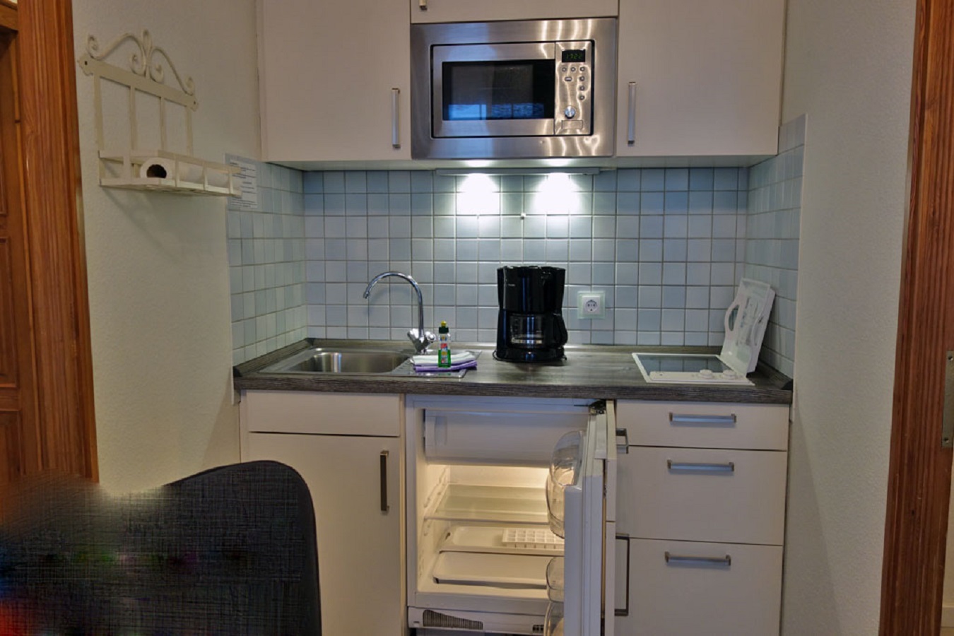 Flachbildschirm, Neuer Einbauküche, Mikrowelle, 2er Glaskeramik-Kochfeld, Kühlschrank/Spüle,
