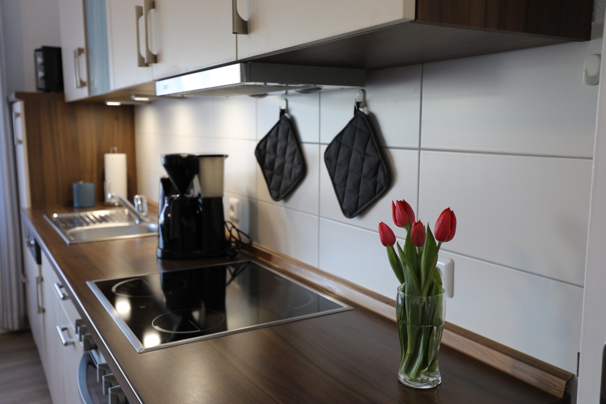 Die Küchenzeile ist ausgestattet mit einem Ceranfeld, Backofen, Kühlschrank, Toaster, Wasserkocher sowie einer Mikrowolle.
