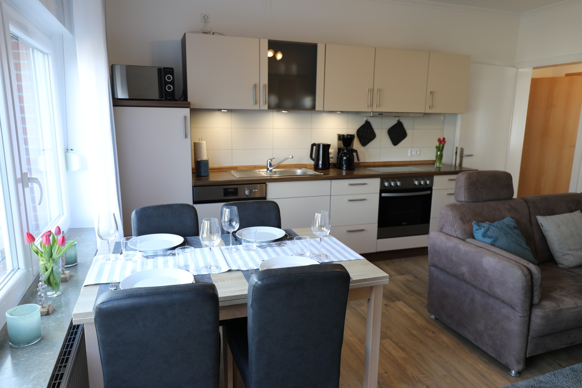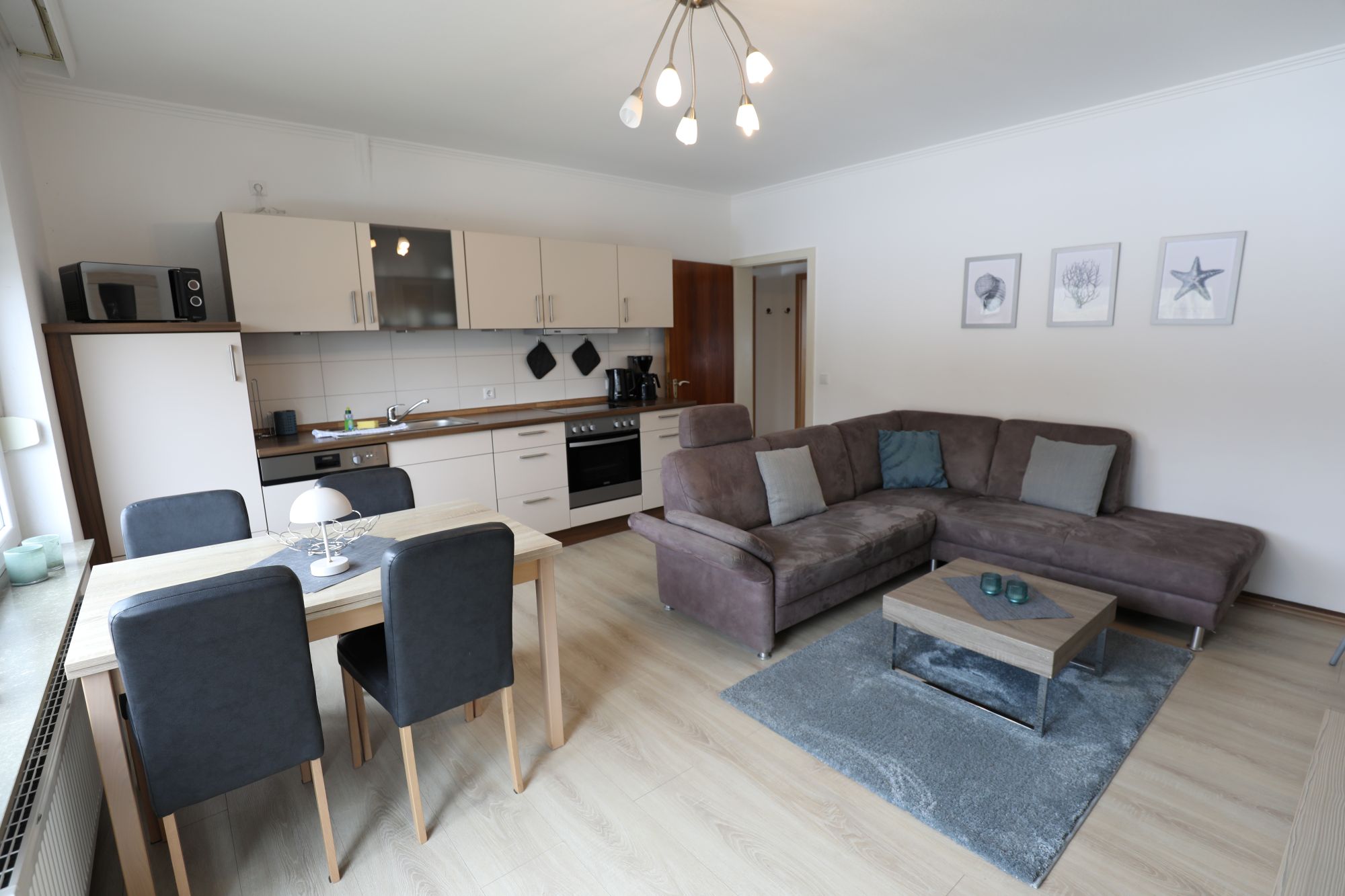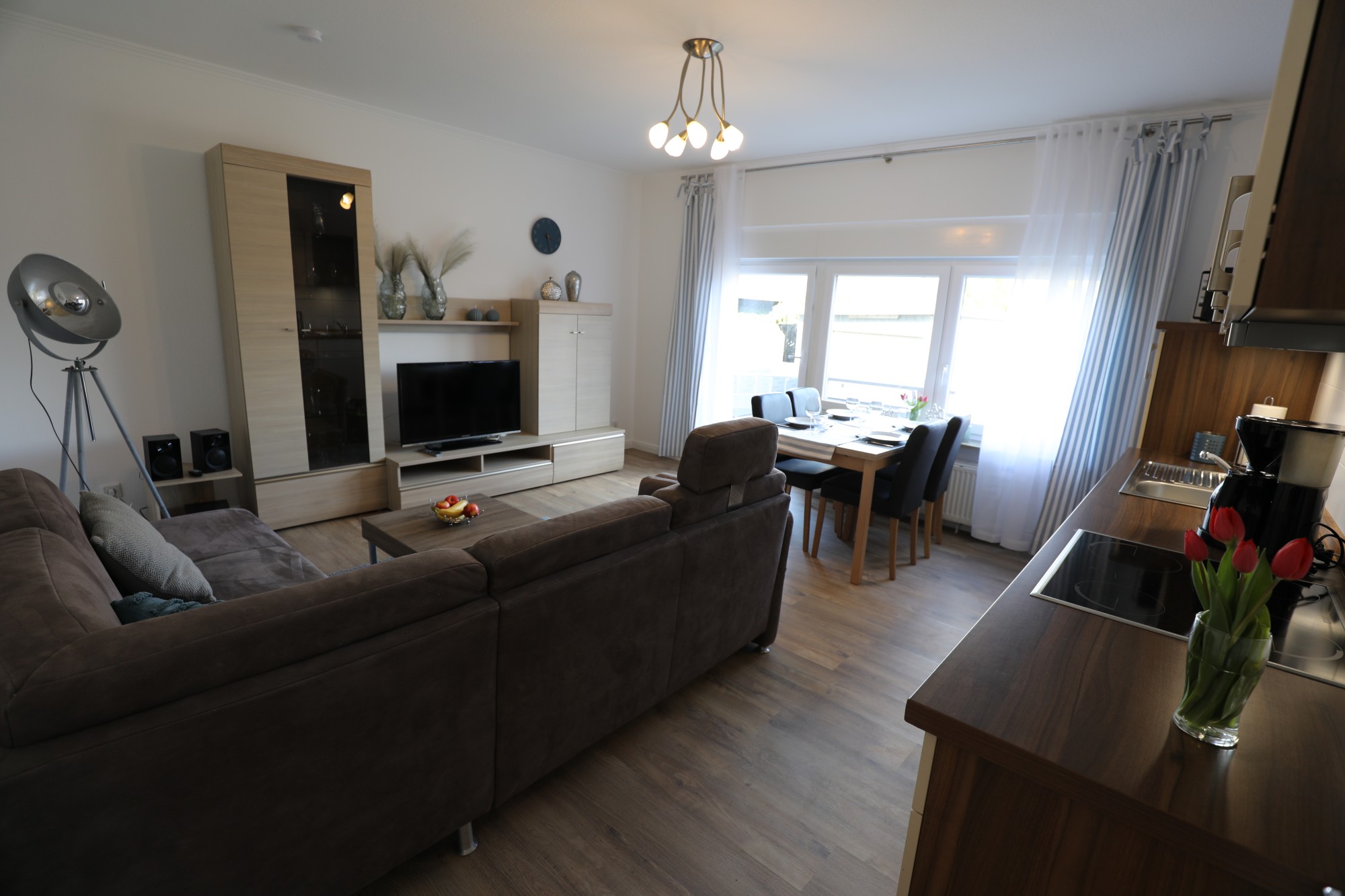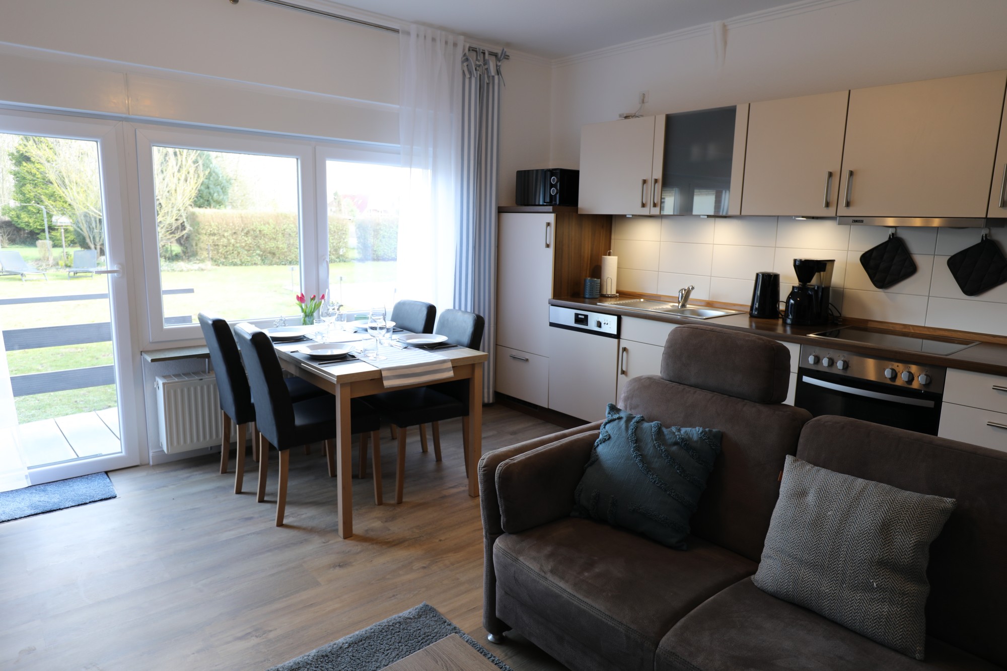 Das geräumige Wohnzimmer verfügt über eine bequeme Couchgruppe, einen separaten Essplatz und eine komplett ausgestattete Küchenzeile.
